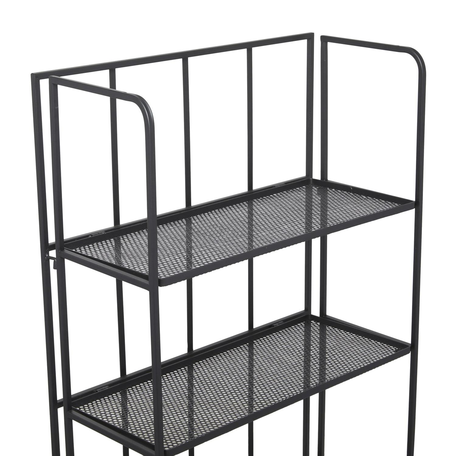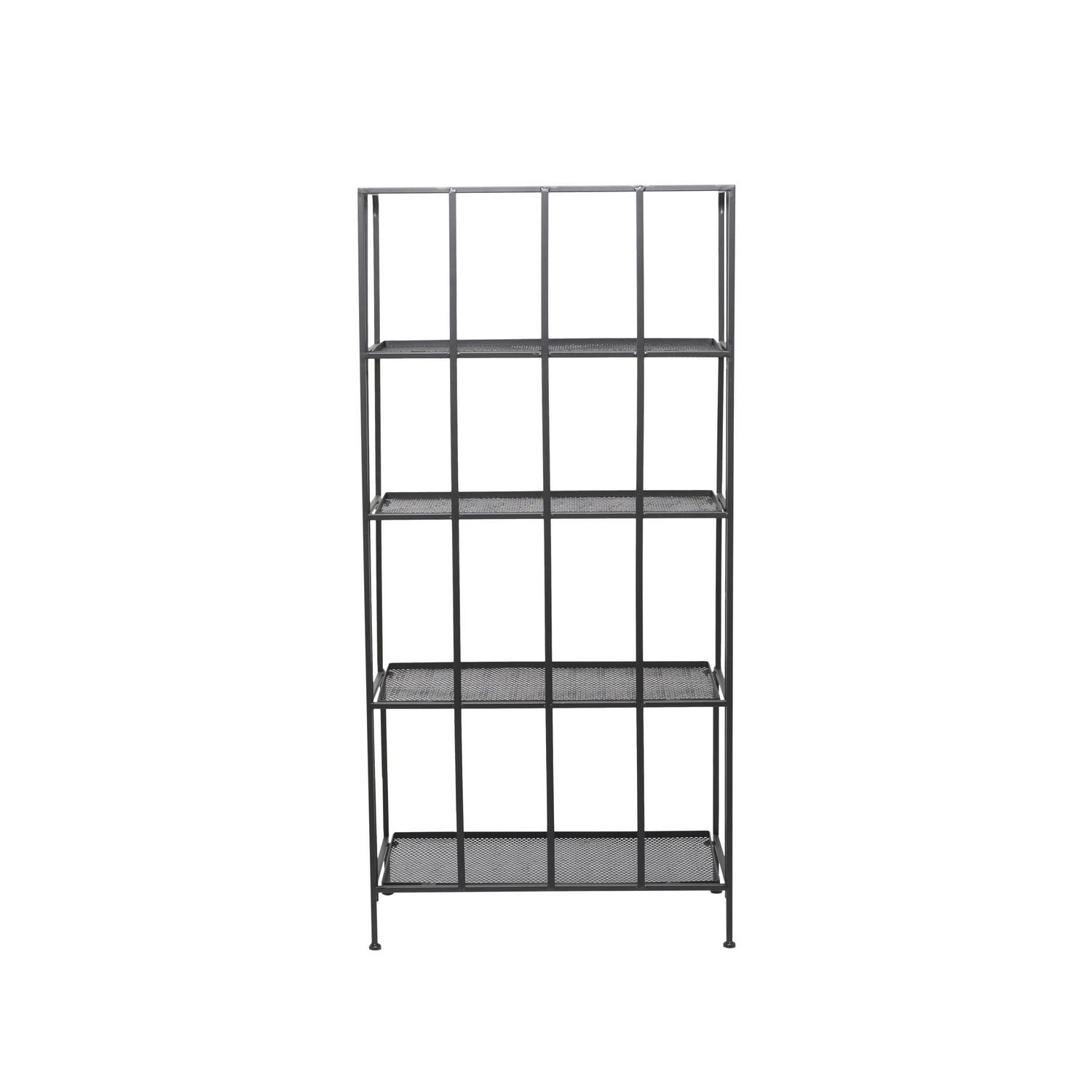 - This black metal bakera s rack features rectangular shelves with grid patterns and round feet