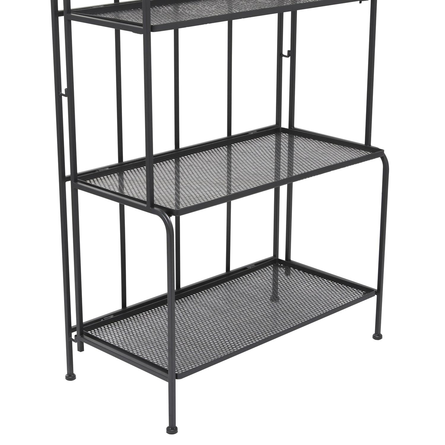 – This black metal baker s rack features rectangular shelves with grid patterns and round feet