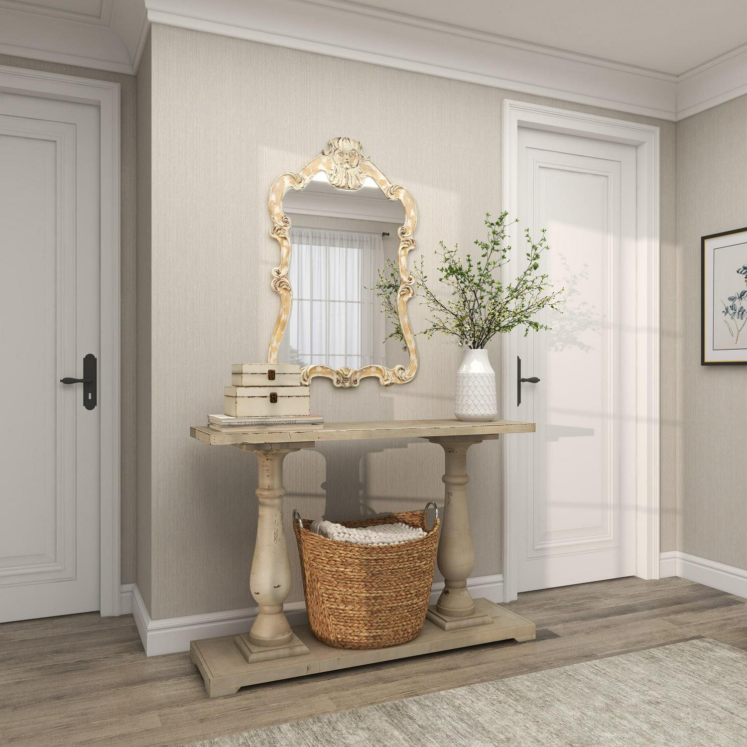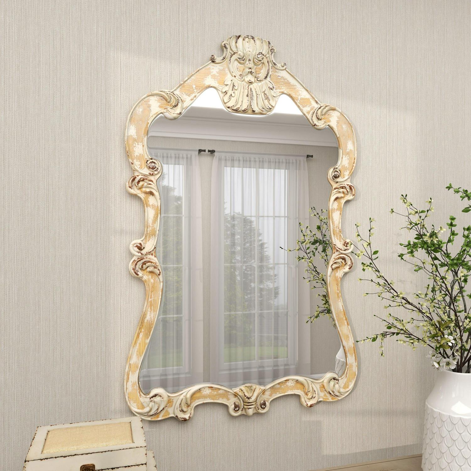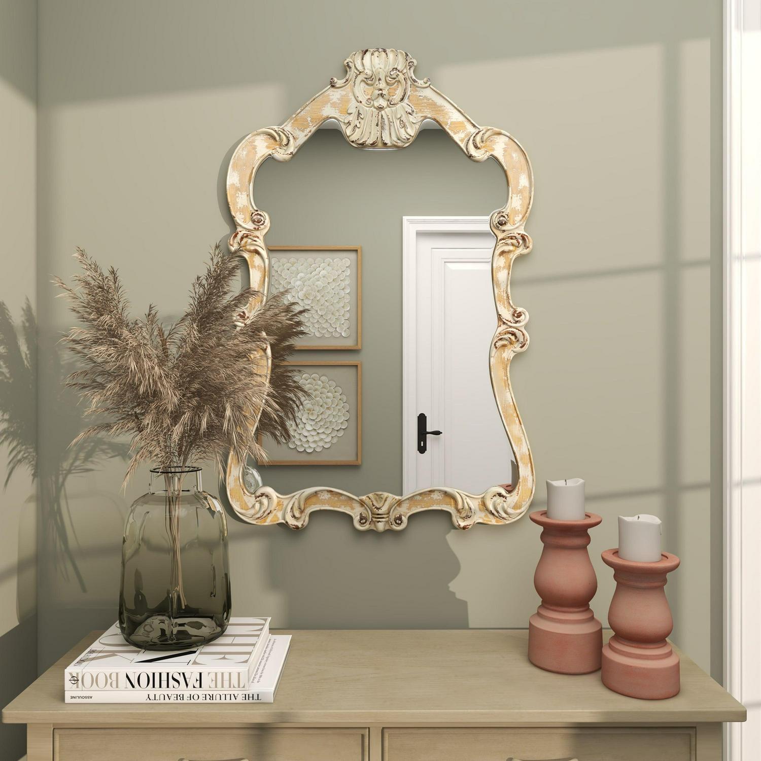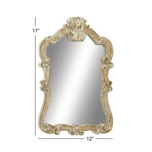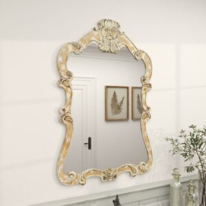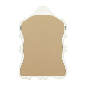 DecMode 25″ x 39″ Cream Carved Acanthus Wall Mirror with Arched Top and Distressing is a unique addition to your stylish home. Apart from decorating your home, the purpose of this wall mirror is to bounce back outdoor light to a small room to make it look bigger. Pair this decorative wall mirror with house plants or other wall decor accent pieces to blend everything together perfectly. Display as centerpiece accent decor in entryway or bedroom as a vintage-inspired vanity mirror. This item ships in 1 carton. Can be hung vertically using the keyholes on the back; nails and screws not included. Suitable for indoor use only. This item ships fully assembled in one piece. This is a single cream colored entryway mirror. Vintage style.