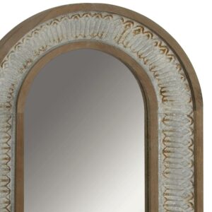 - This arched wooden mirror features decorative carvings on the whitewashed wooden frame