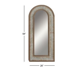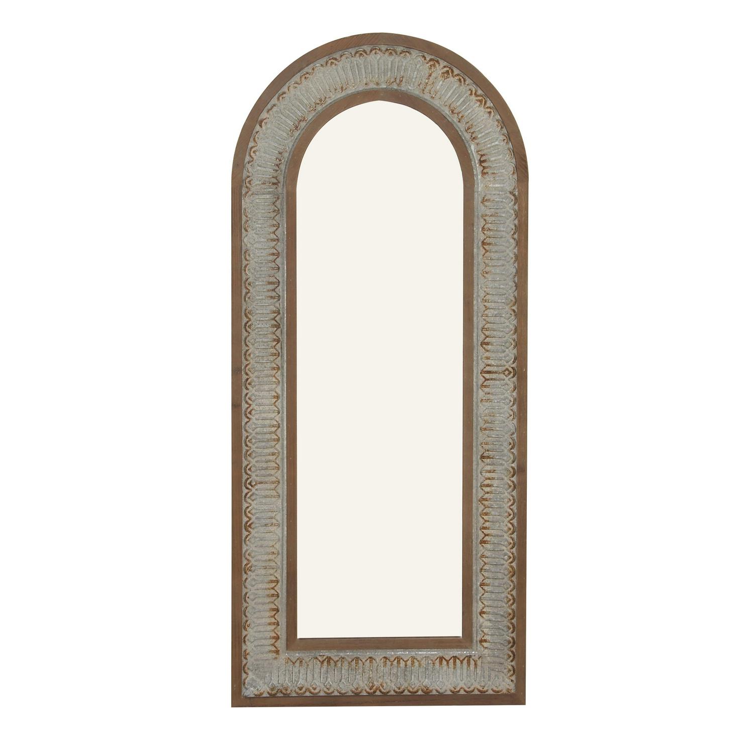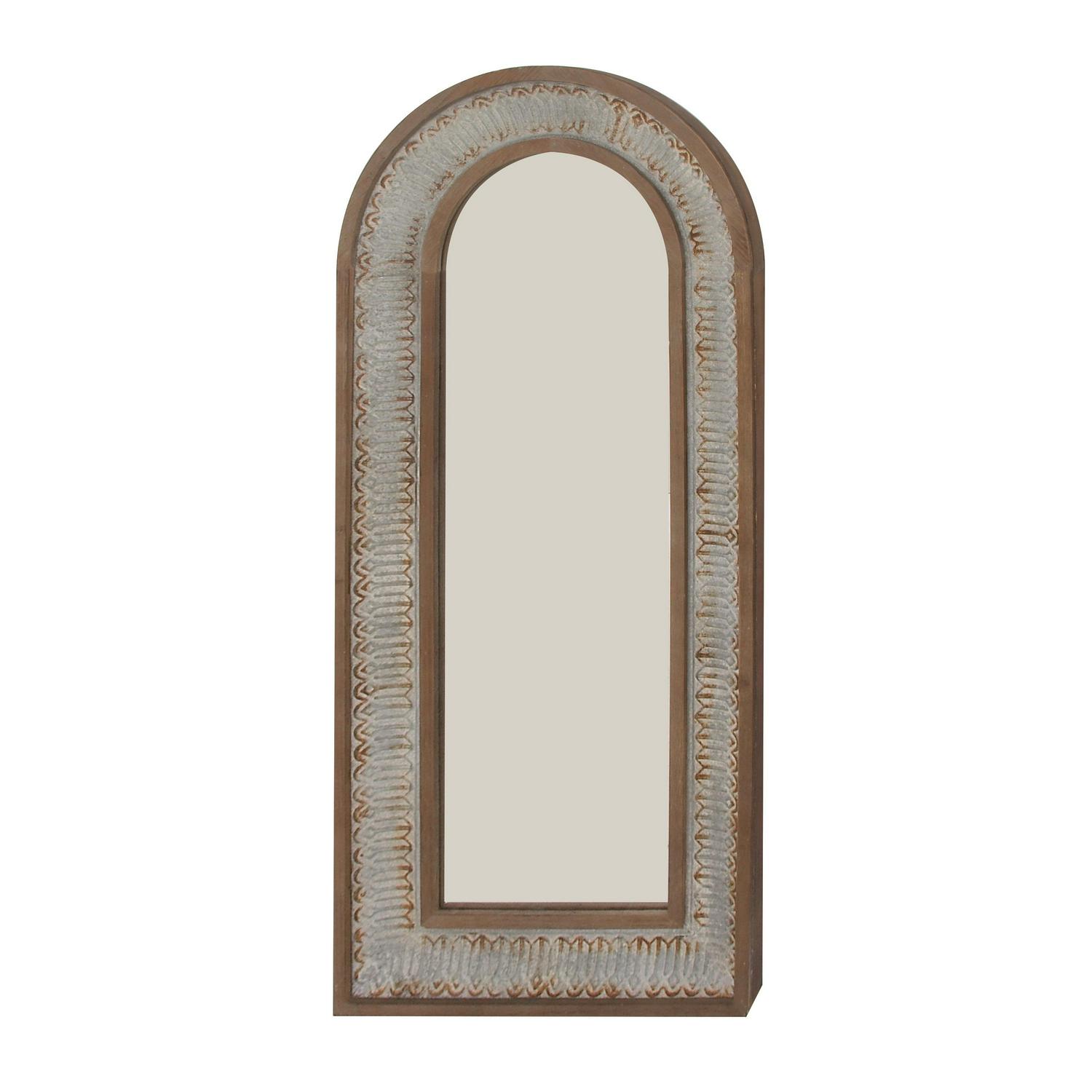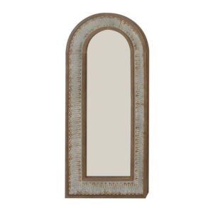 - This rustic arched floor mirror has a brown wood undertone and a whitewashed distressing