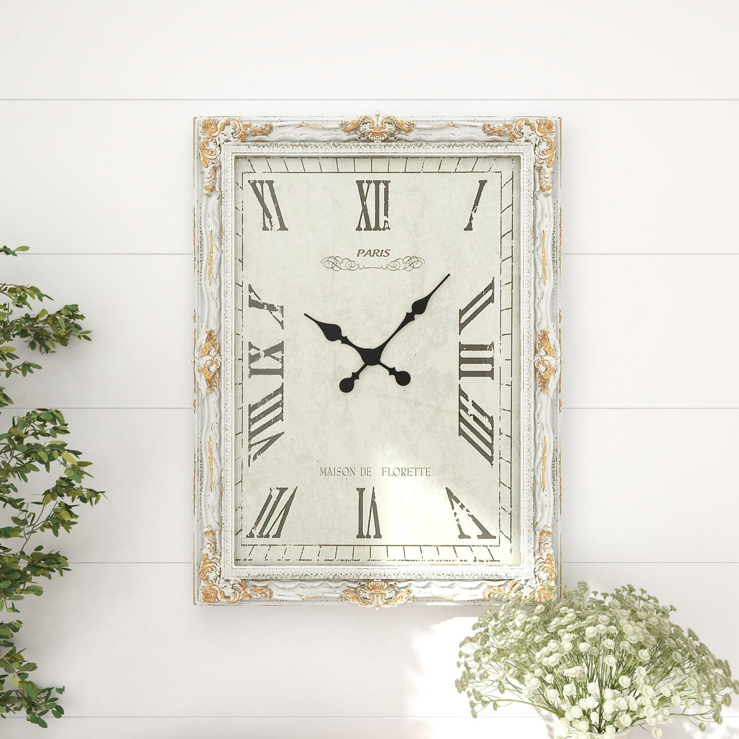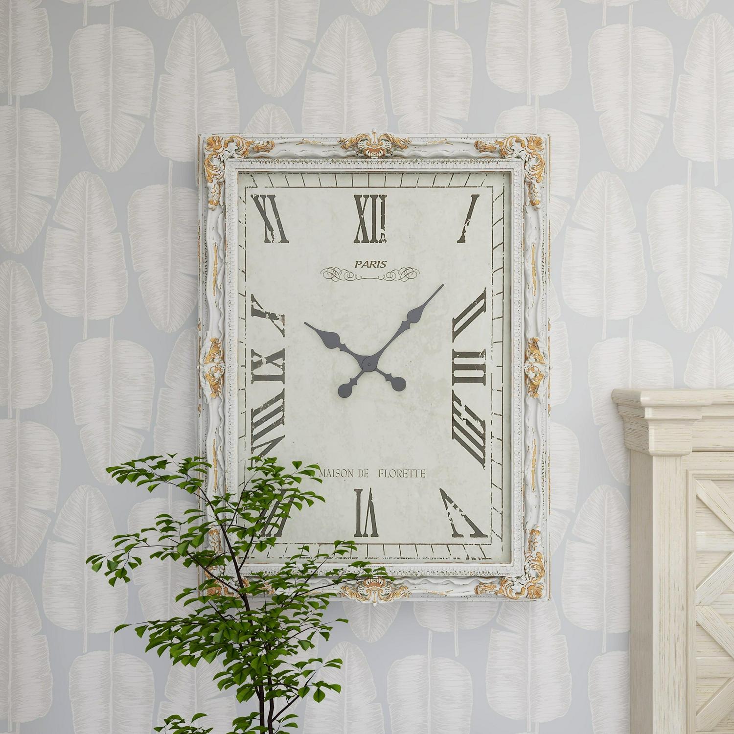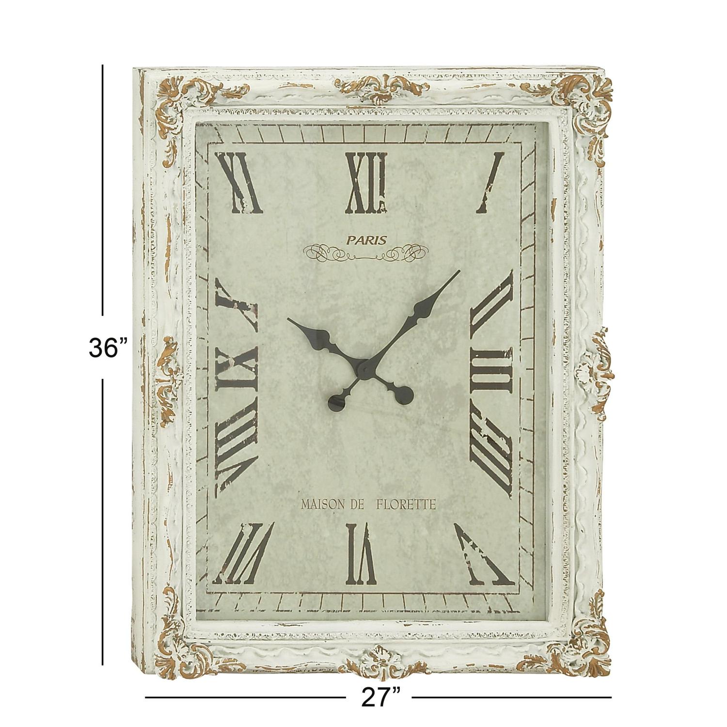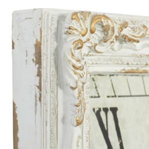 DecMode 27″ x 36″ White Wood Floral Carved Acanthus Wall Clock with Distressing is a unique addition to your stylish home. This rustic wall clock is ideal for farmhouse, minimalist, and vintage-themed living spaces. Requires 1 AA battery. Battery not included. This item ships in 1 carton. Features Roman numerals for the hour and minute markers. The clock mechanism runs silent. Can be hung vertically using the D-rings on the back; nails and screws not included. Suitable for indoor use only. This item ships fully assembled in one piece. This is a single white colored oversized wall clock. Vintage style. Showcases vintage-inspired typographies of “Paris” and “Maison De Florette”.