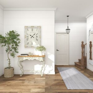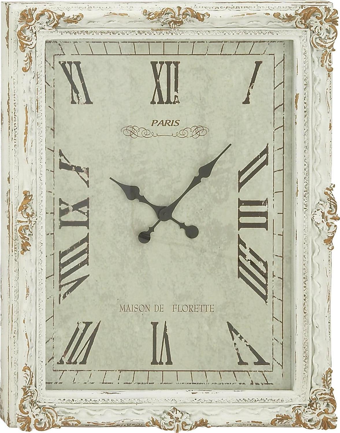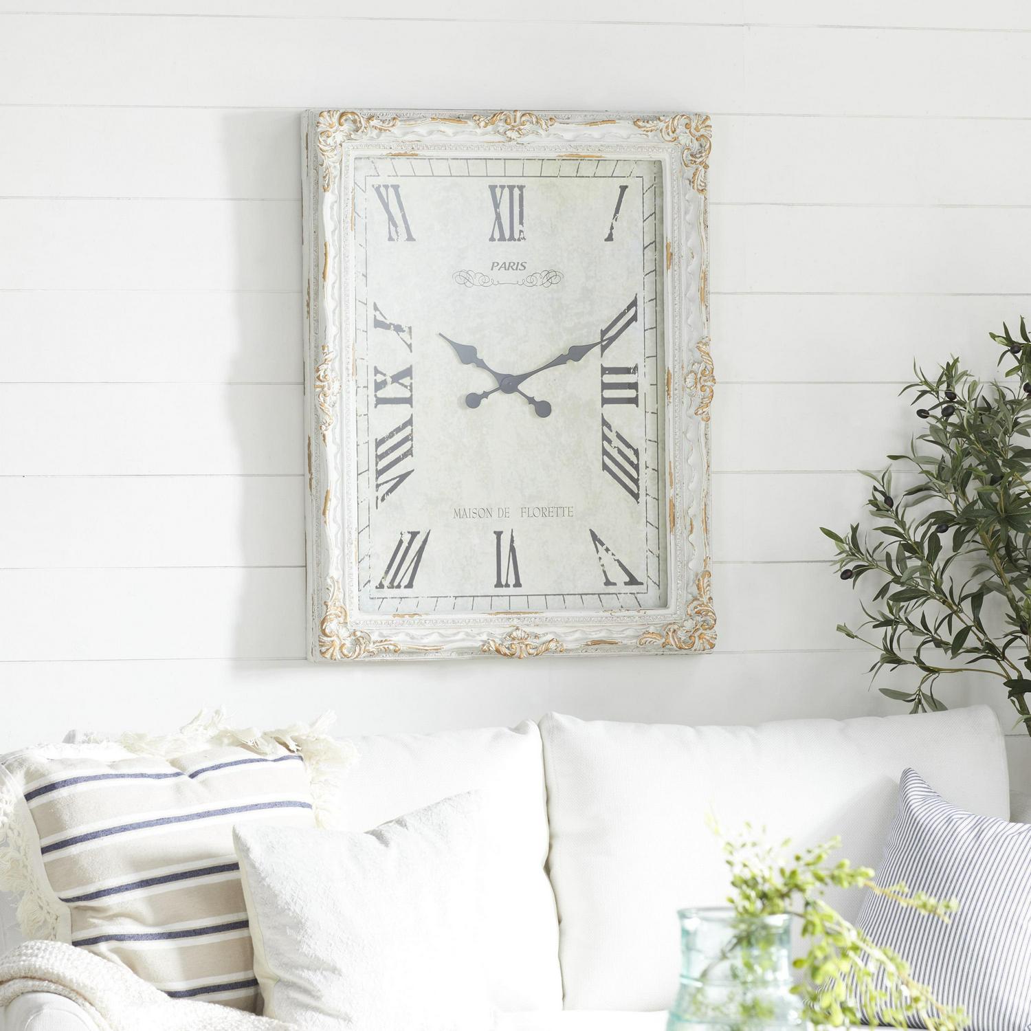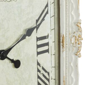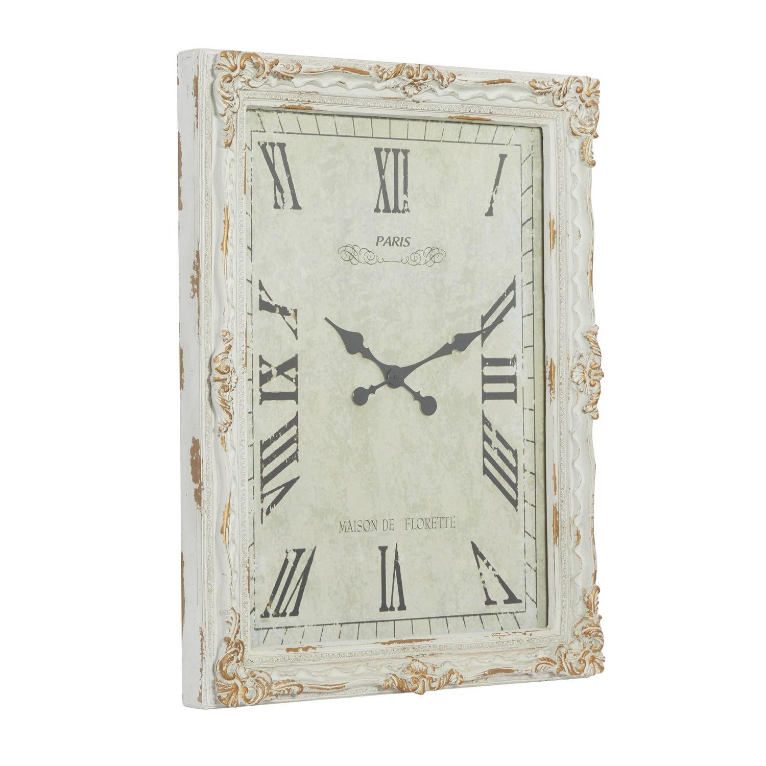 DecMode 27″ x 36″ White Wood Floral Carved Acanthus Wall Clock with Distressing is a unique addition to your stylish home. This rustic wall clock is ideal for farmhouse, minimalist, and vintage-themed living spaces. Requires 1 AA battery. Battery not included. This item ships in 1 carton. Features Roman numerals for the hour and minute markers. The clock mechanism runs silent. Can be hung vertically using the D-rings on the back; nails and screws not included. Suitable for indoor use only. This item ships fully assembled in one piece. This is a single white colored oversized wall clock. Vintage style. Showcases vintage-inspired typographies of “Paris” and “Maison De Florette”.