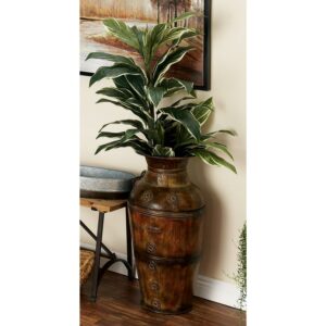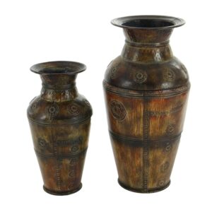 DecMode 29″, 22″H Indoor Outdoor Large Brown Metal Vase with Floral Relief, Set of 2 is a unique addition to your stylish home. Display as decorative accent piece or lightweight home decor holder. Designed with felt or rubber stoppers at the base that prevent scratching furniture and table tops, as well as sliding around. This item ships in 1 carton. Easily goes with vanilla-toned walls and pastel-painted drapes or tables. Suitable for indoor use only. This item ships fully assembled in one piece. This brown colored vase comes as a set of 2. Rustic style. Vases have a 7 in, and 5 in mouth openings.
