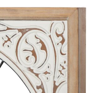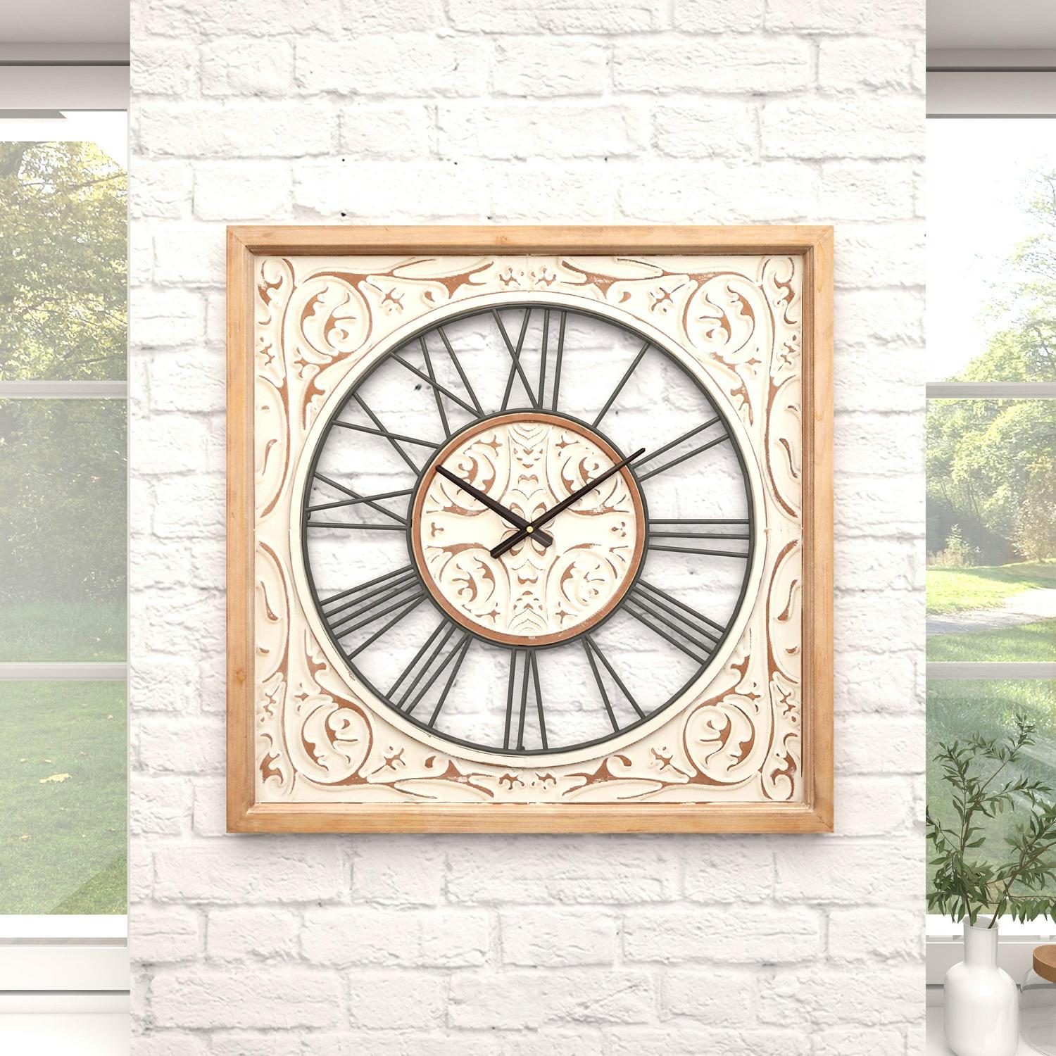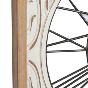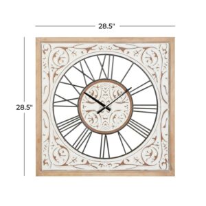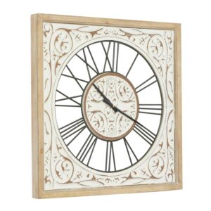 DecMode 29 In. White Farmhouse Wall Clock is a unique addition to your stylish home. The neutral light color tone will provide a high level of comfort and romantic atmosphere to your living space. Requires 1 AA battery. Battery not included. This item ships in 1 carton. Roman numerals for the hour markers. The clock mechanism runs silent. Metal secure loop backing for easy hang; nails and screws are not included. Suitable for indoor use only. This item ships fully assembled in one piece. Farmhouse-styled style.