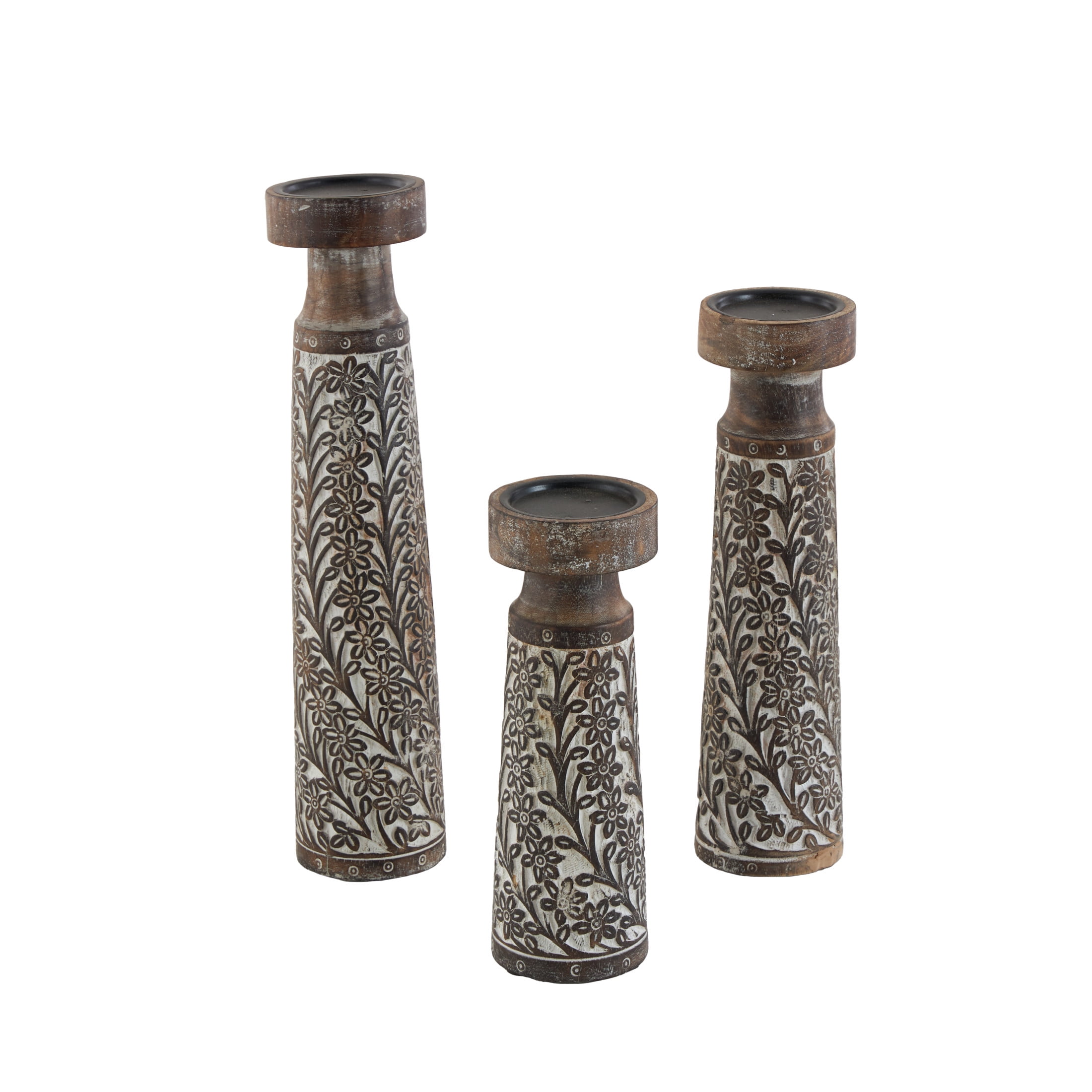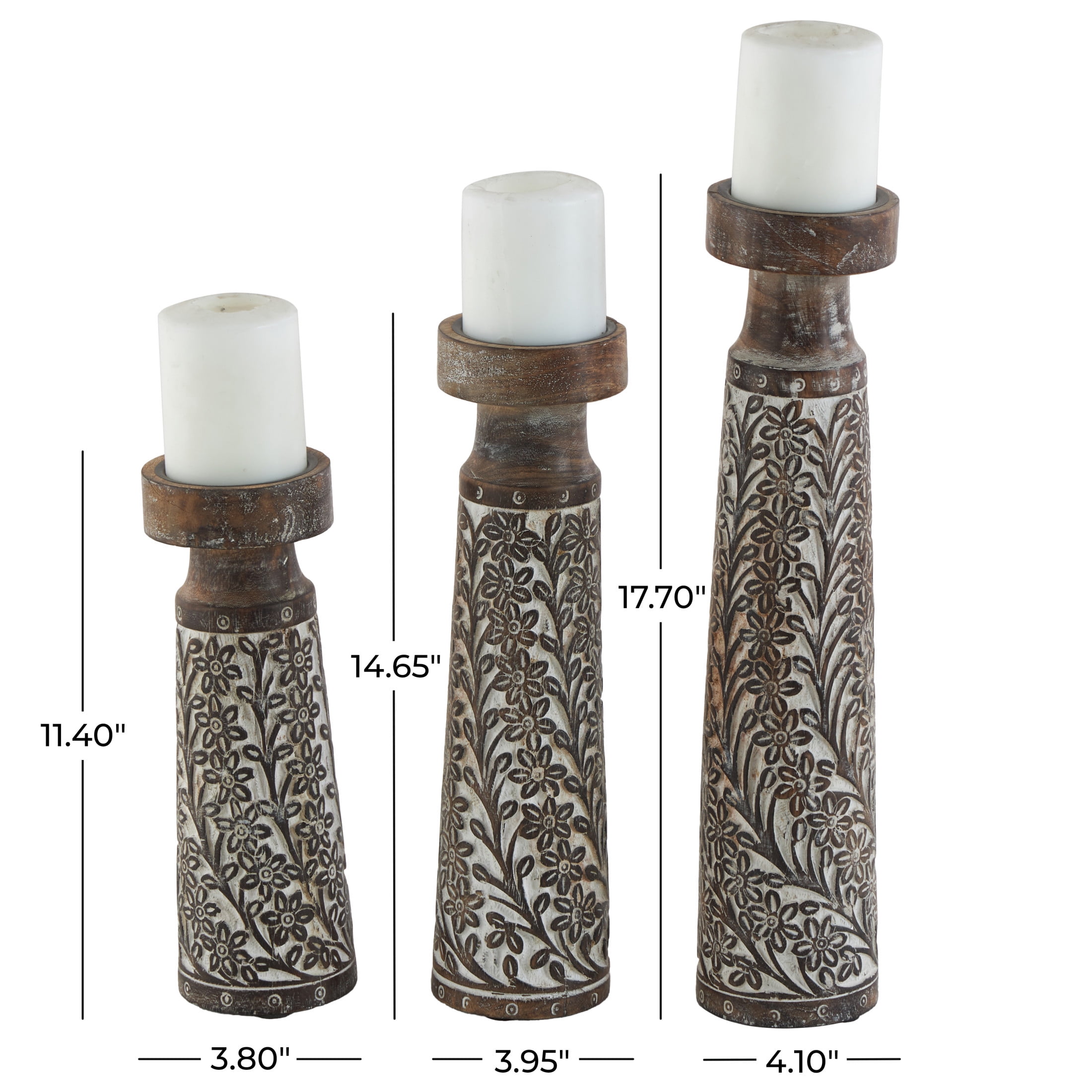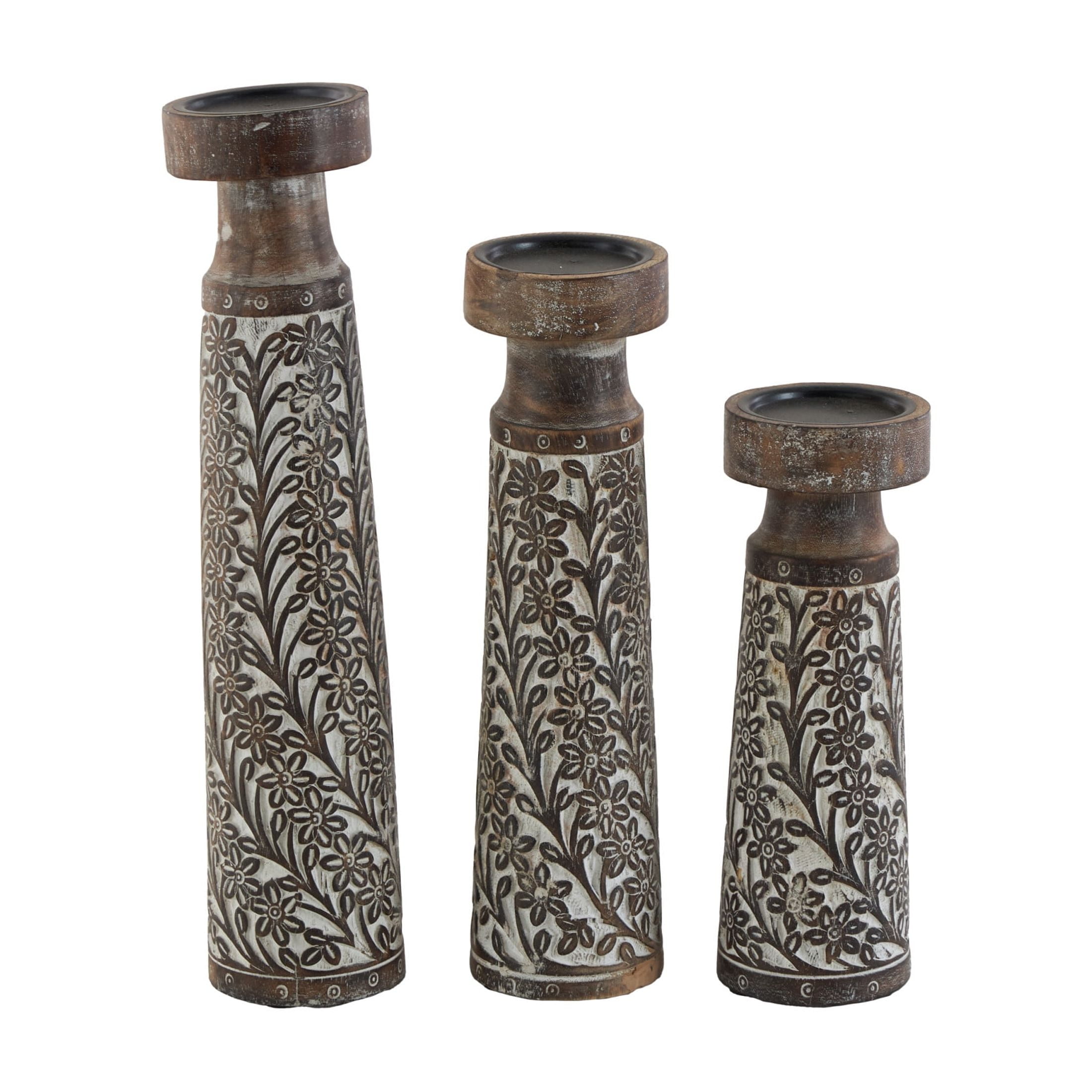 Inspired by blissful serenity and the allure of the sea, where soothing hues and natural textures bring effortless charm to the home Brown decorative candle holder set is crafted from mango wood with iron candle plates, ensuring both durability and elegance Featuring natural golden-brown wood with a whitewashed finish, this round candle stand holder set boasts a harmonious blend of colors This mango wood set of 3 candle holders features pillar holders with round plates and tumbler-shaped bodies adorned with intricate floral details Each brown mango wood candle holder measures 4.10L x 4.10W x 17.70H , 3.95L x 3.95W x 14.65H, 3.80L x 3.80W x 11.40H inches, and collectively weighs 7.58 lbs Washed brown candle holders for centerpiece highlights a round shaped with floral carved patterns, adding an artistic touch to any setting Wipe clean with a dry cloth Coastal set of 3 candle holders for home decor is expertly carved from mango wood and adorned with intricate floral patterns in a charming, washed finish Coastal style DecMode 3 Candle Brown Mango Wood Handmade Candle Holder, Set of 3 makes a perfect addition to any home