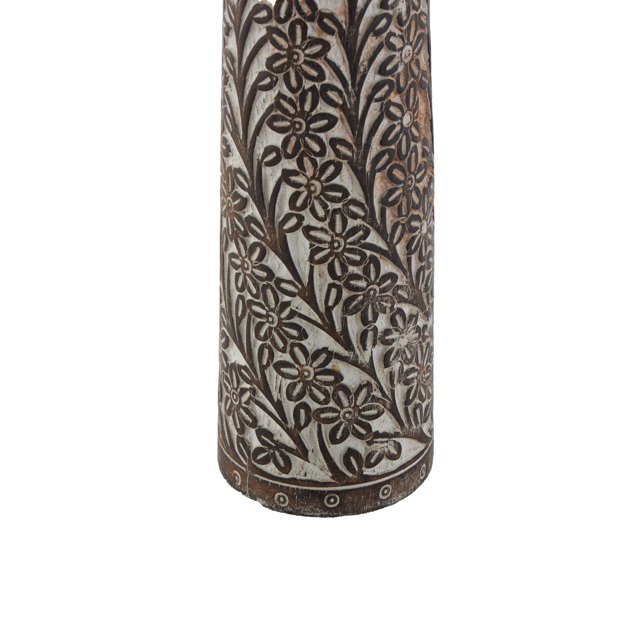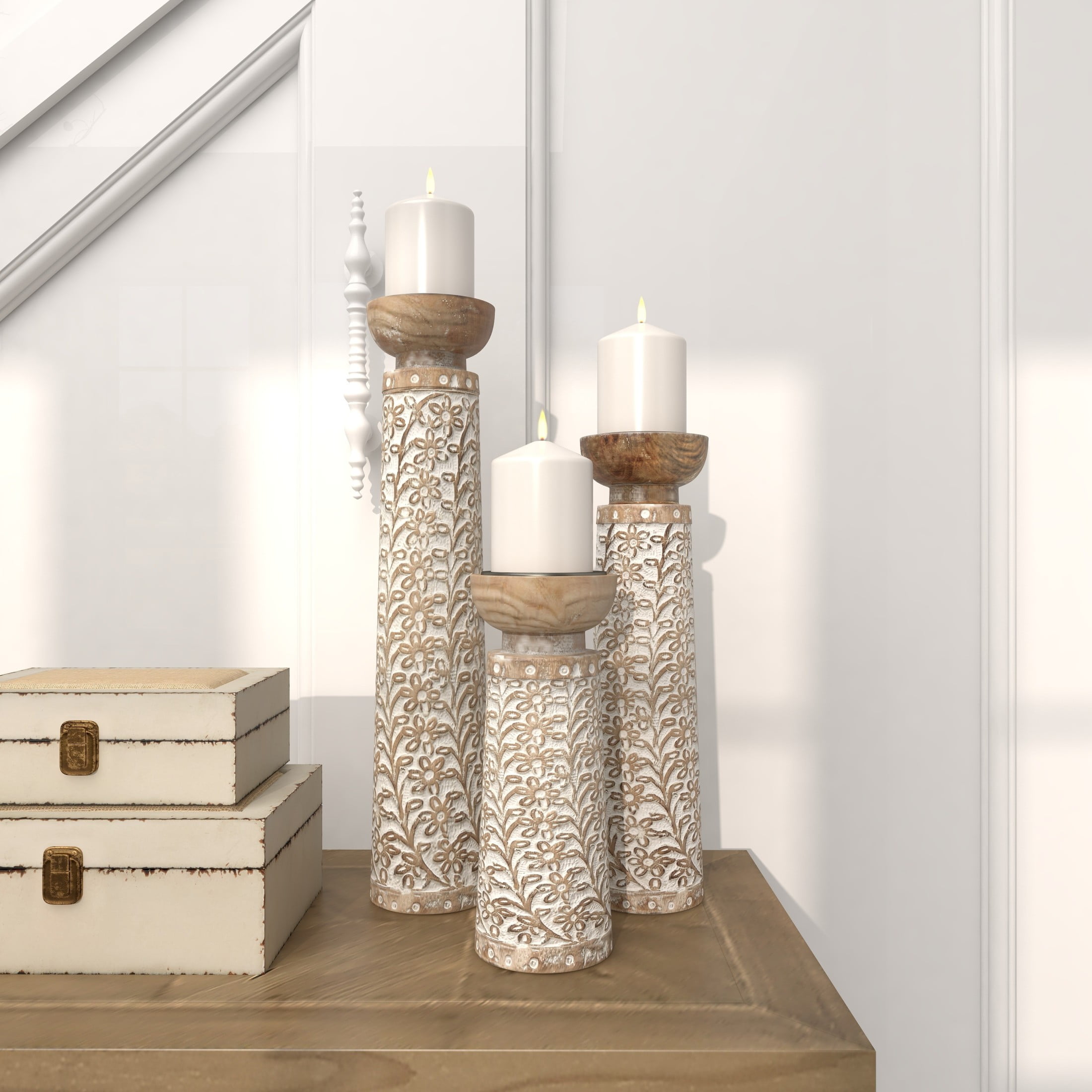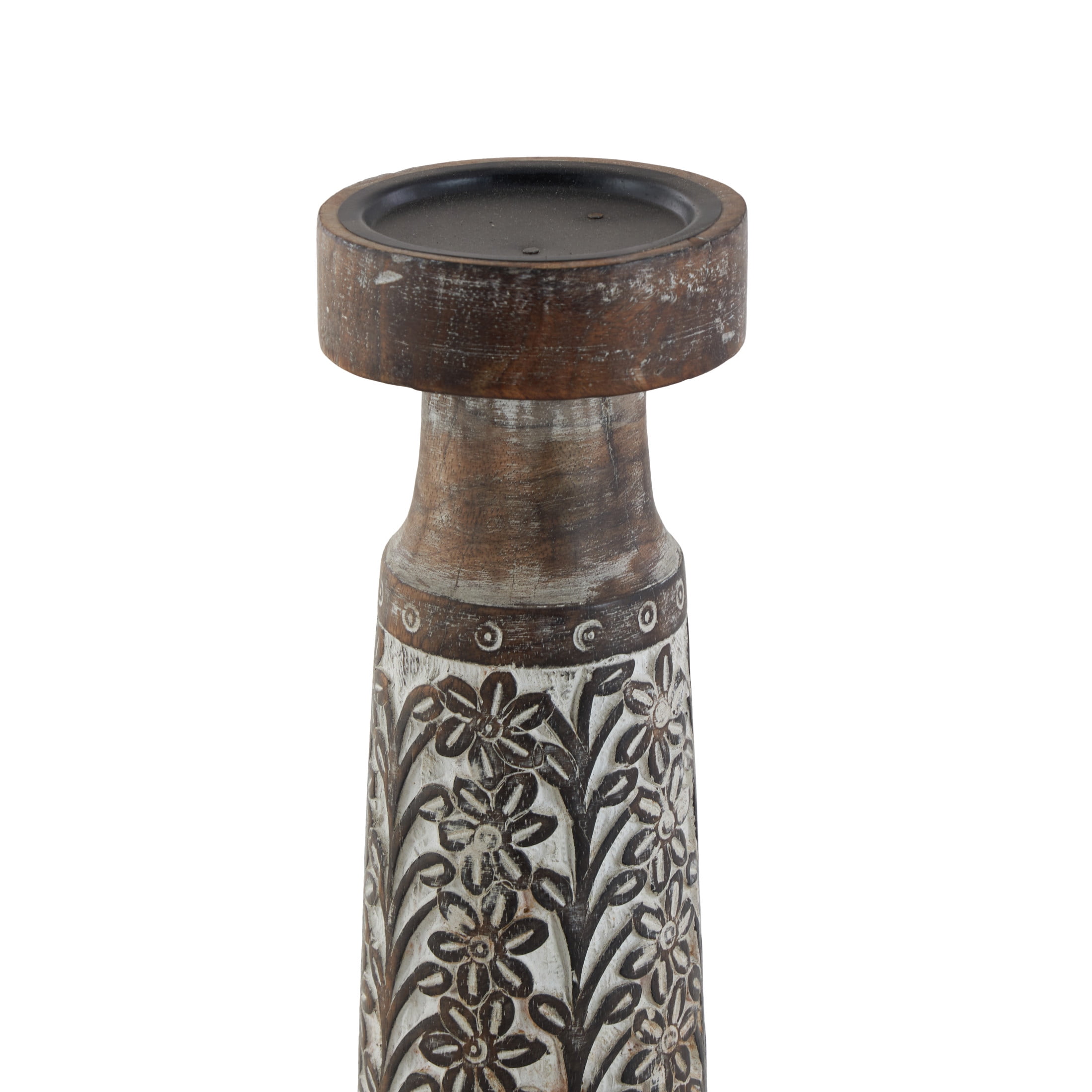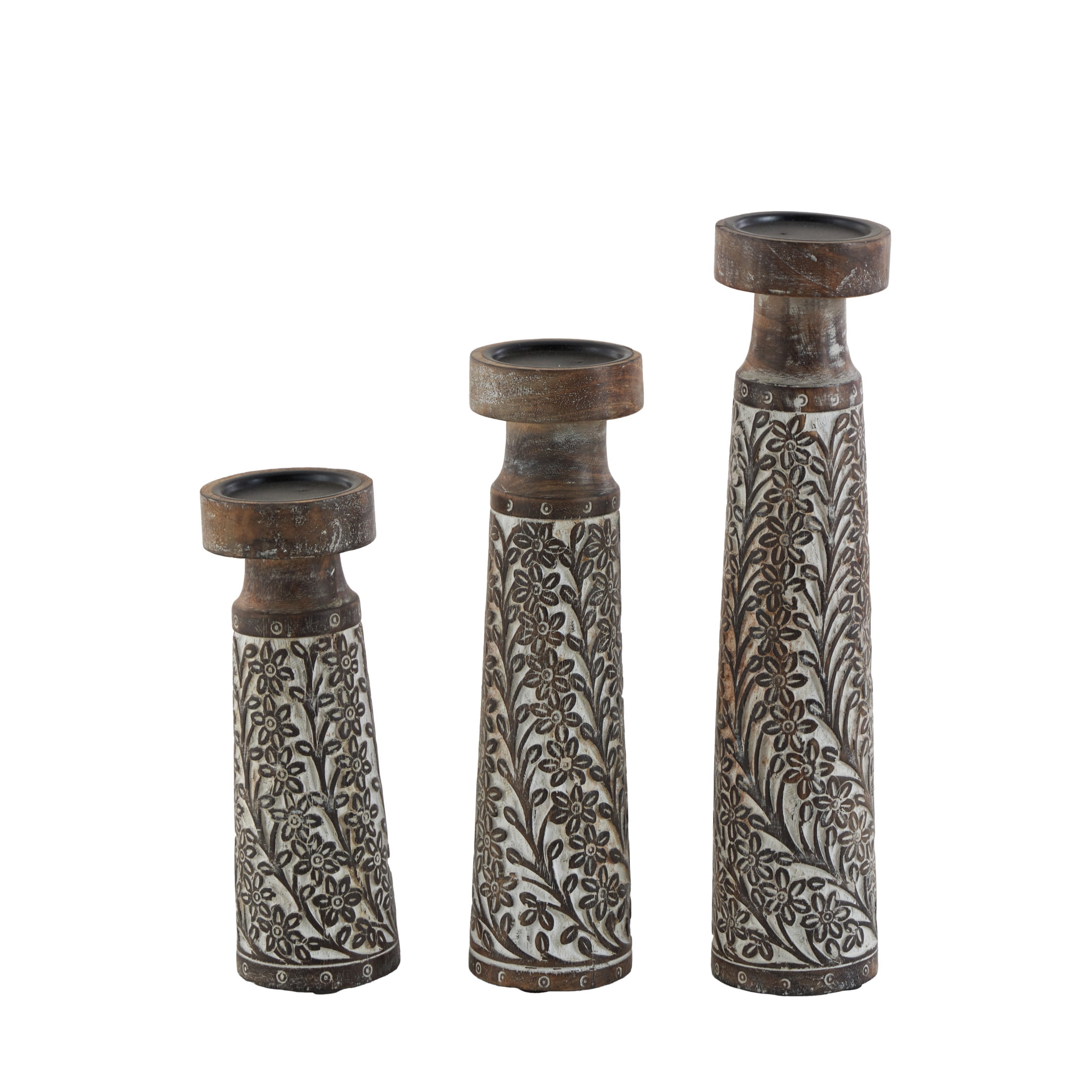 Inspired by blissful serenity and the allure of the sea, where soothing hues and natural textures bring effortless charm to the home Brown decorative candle holder set is crafted from mango wood with iron candle plates, ensuring both durability and elegance Featuring natural golden-brown wood with a whitewashed finish, this round candle stand holder set boasts a harmonious blend of colors This mango wood set of 3 candle holders features pillar holders with round plates and tumbler-shaped bodies adorned with intricate floral details Each brown mango wood candle holder measures 4.10L x 4.10W x 17.70H , 3.95L x 3.95W x 14.65H, 3.80L x 3.80W x 11.40H inches, and collectively weighs 7.58 lbs Washed brown candle holders for centerpiece highlights a round shaped with floral carved patterns, adding an artistic touch to any setting Wipe clean with a dry cloth Coastal set of 3 candle holders for home decor is expertly carved from mango wood and adorned with intricate floral patterns in a charming, washed finish Coastal style DecMode 3 Candle Brown Mango Wood Handmade Candle Holder, Set of 3 makes a perfect addition to any home