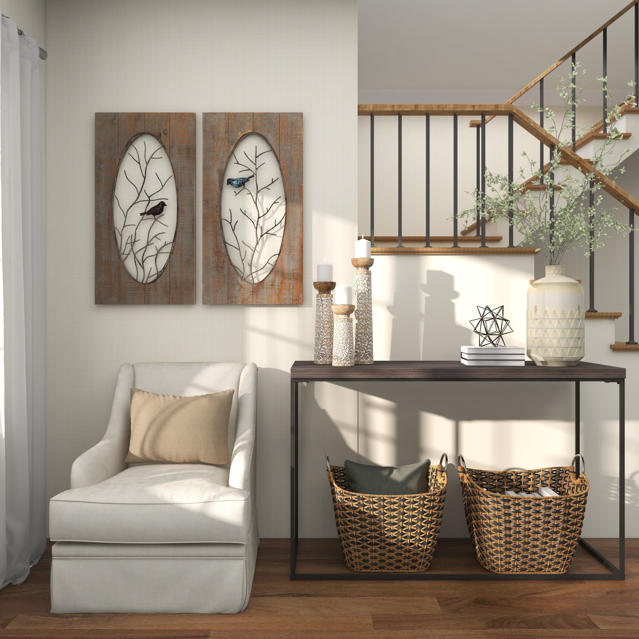 DecMode 3 Candle Brown Mango Wood Handmade Floral Vine Candle Holder with Whitewashed Cream Backing, Set of 3