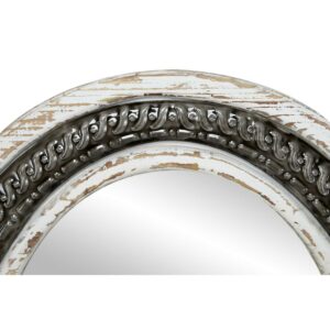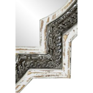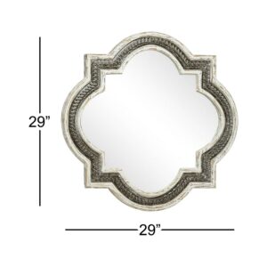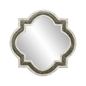 DecMode 30″ x 30″ White Quatrefoil Wall Mirror is a unique addition to your stylish home. Complements vanilla and dark neutral-toned walls to flatter the mirror’s baroque iron inlay detail and natural distressed white finish. This item ships in 1 carton. Can be hung vertically using the D-rings on the back; nails and screws not included. Suitable for indoor use only. This item ships fully assembled in one piece. This is a single white colored entryway mirror. Farmhouse style.