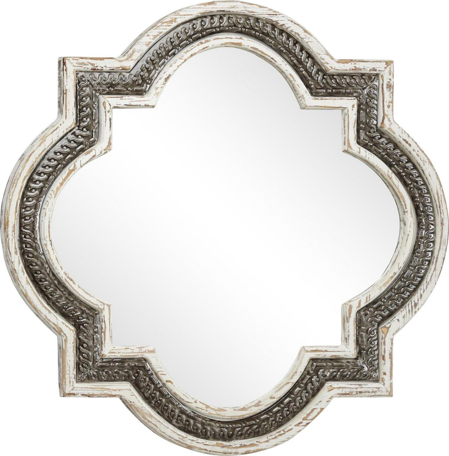 - The glass material of this white quatrefoil wall mirror is encased in wood and iron frame