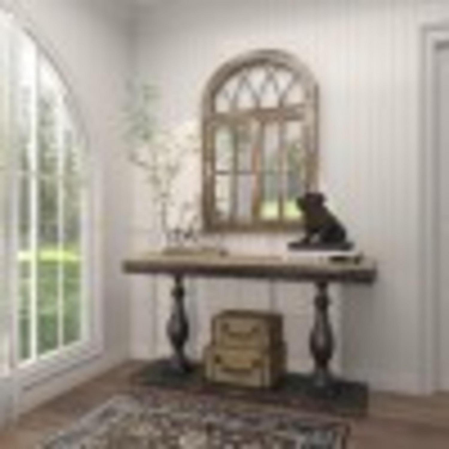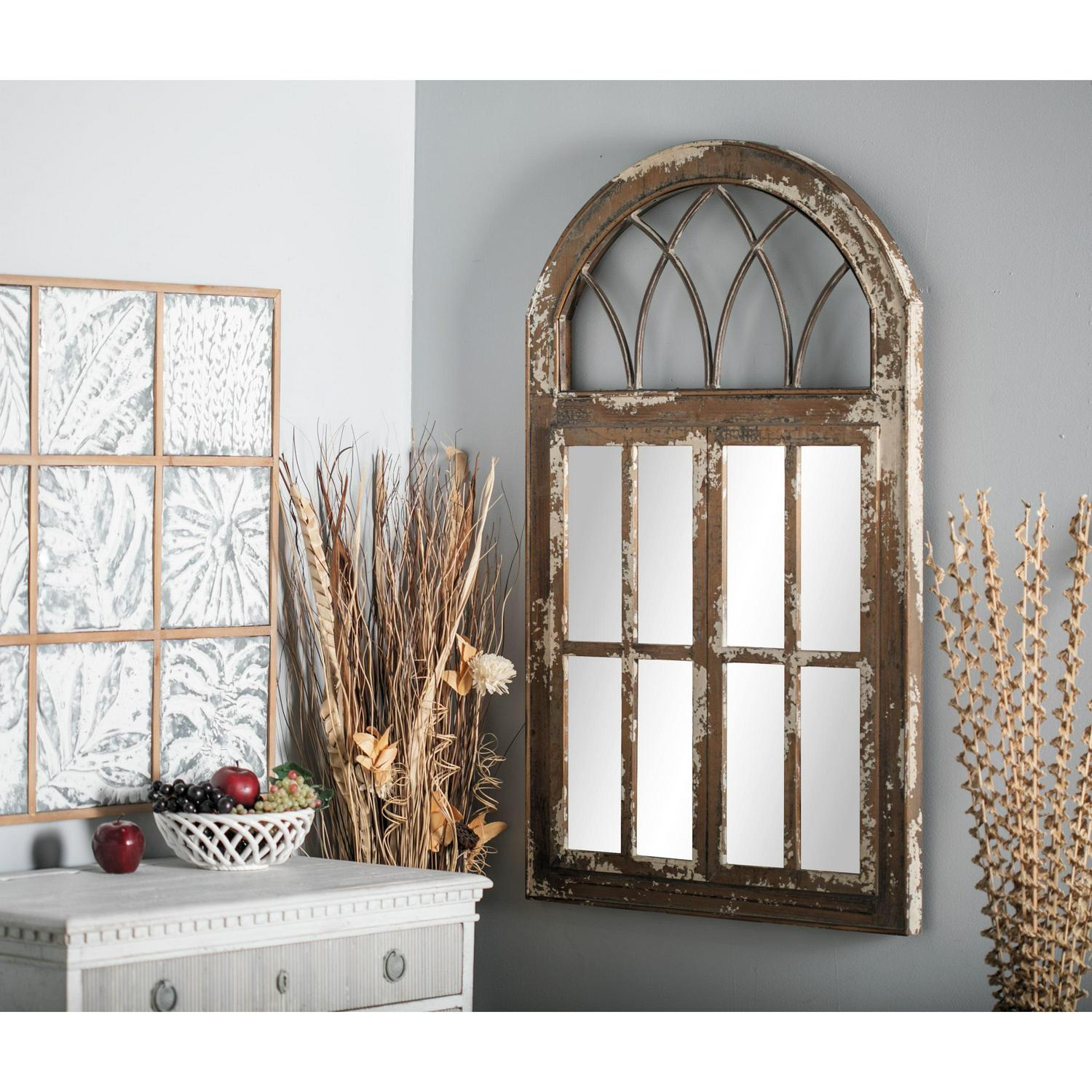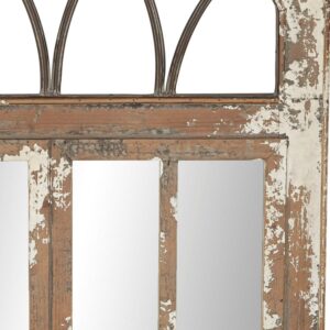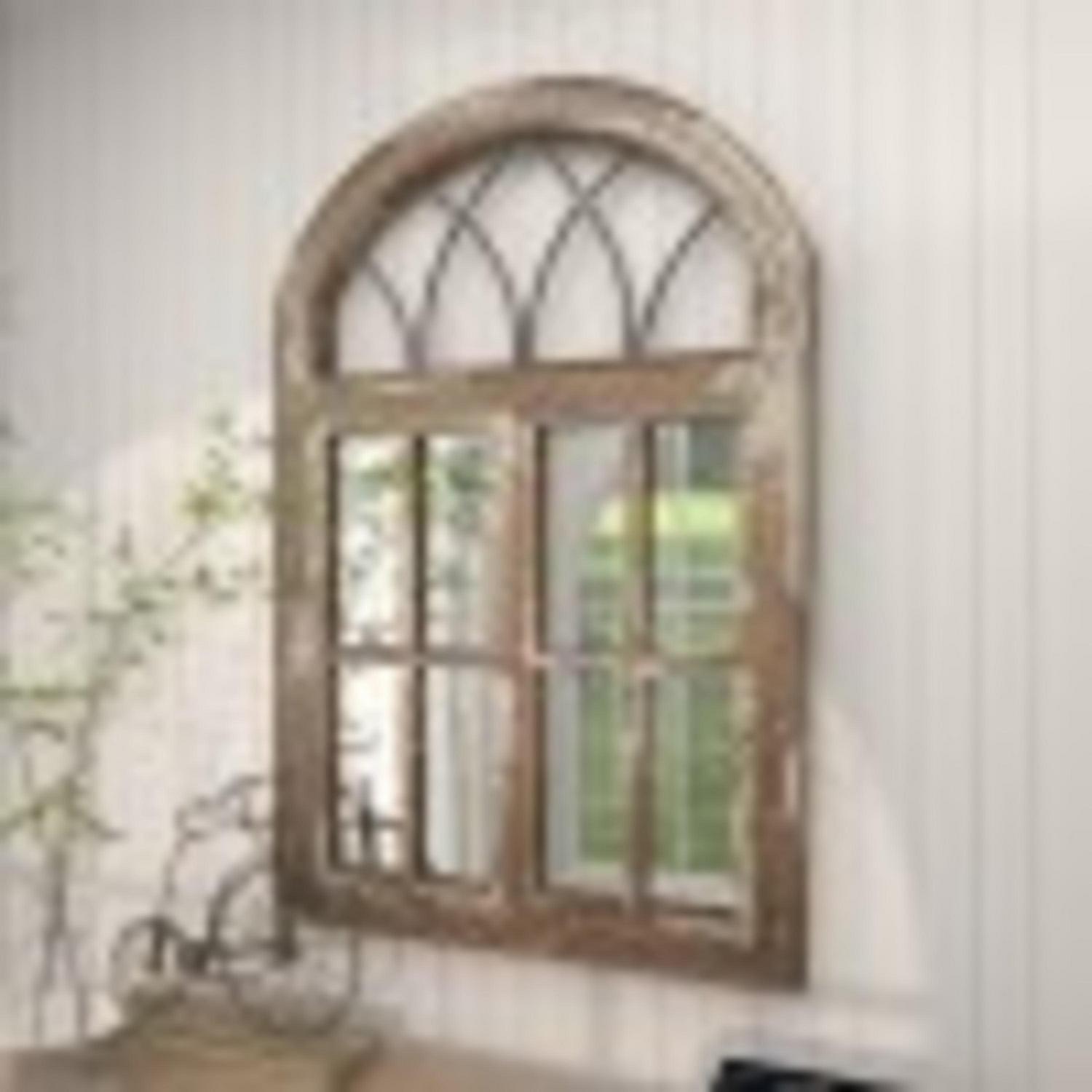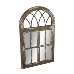 DecMode 30″ x 48″ Brown Window Pane Inspired Wall Mirror with Arched Top is a unique addition to your stylish home. This decorative accent wall mirror is ideal as an accent wall mirror for the living room, the hallway, and the bedroom. This item ships in 1 carton. Can be hung vertically using the D-rings on the back; nails and screws not included. Suitable for indoor use only. This item ships fully assembled in one piece. This is a single brown colored entryway mirror. Farmhouse style.
