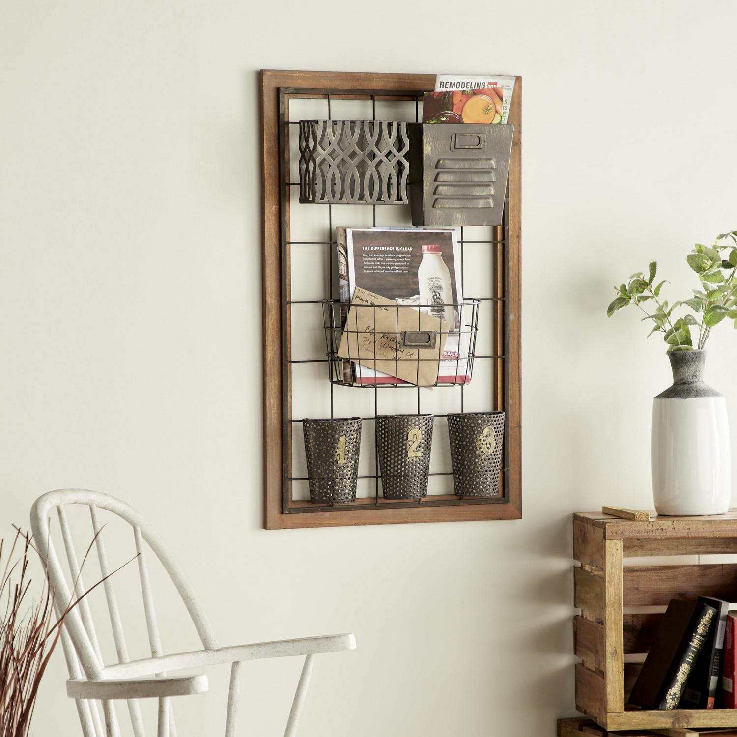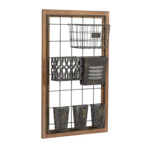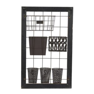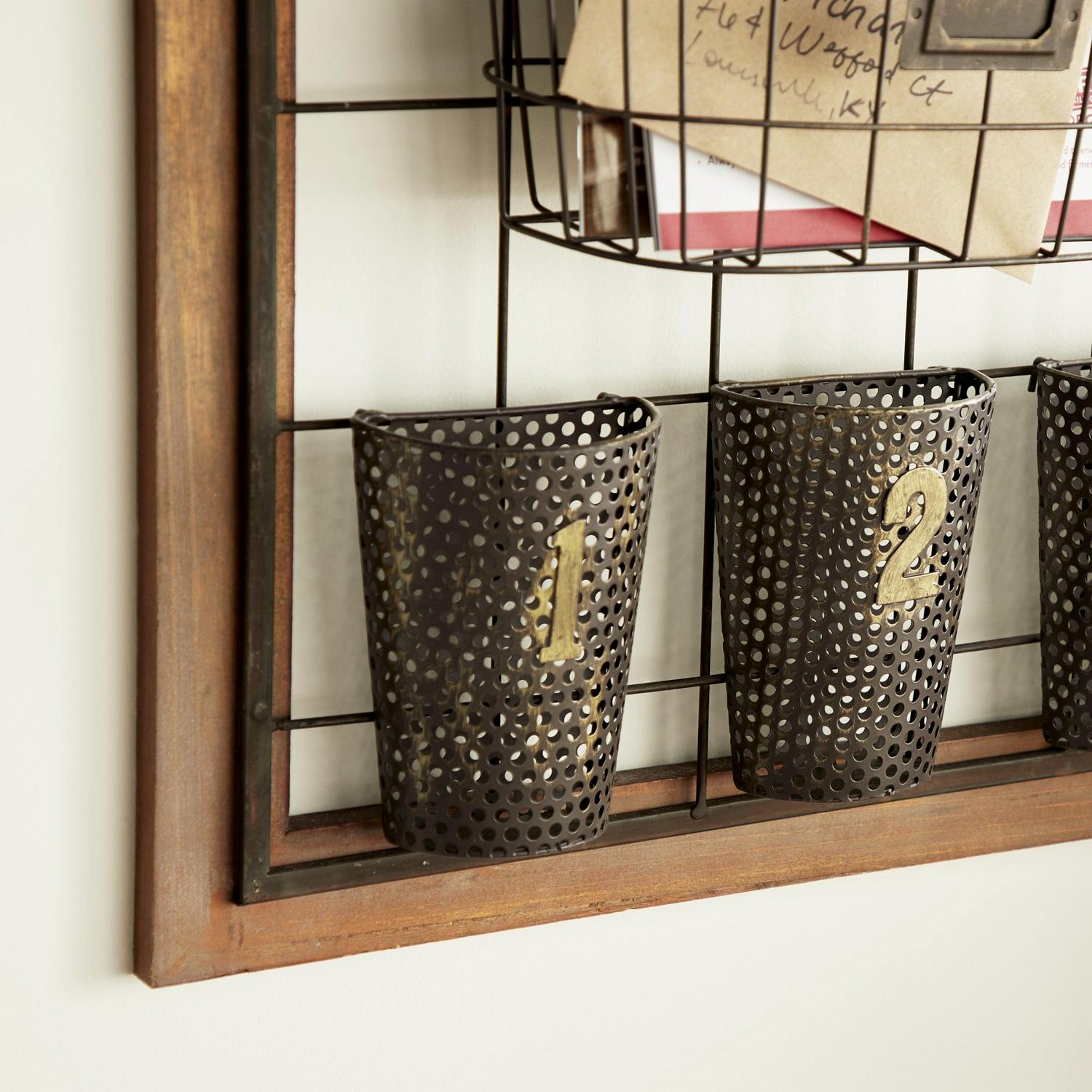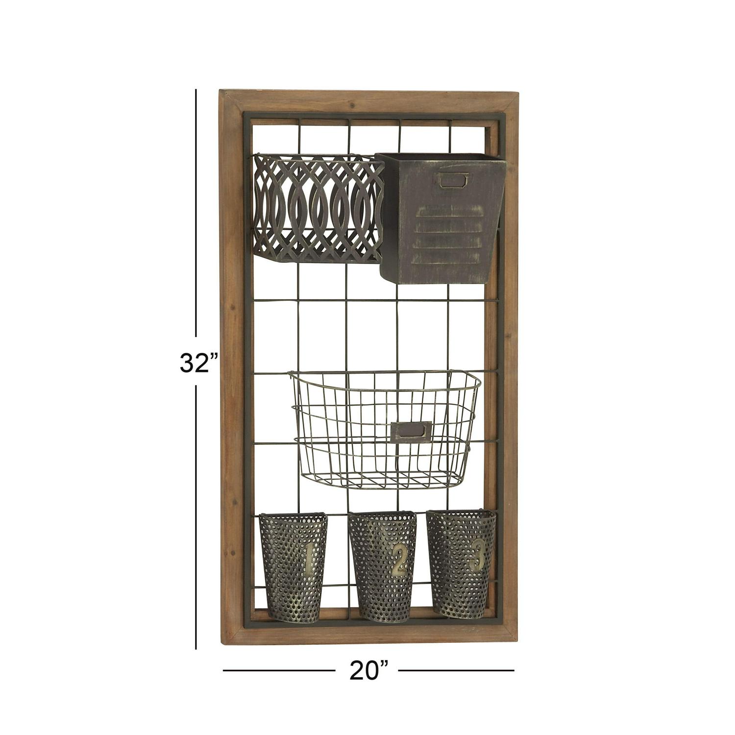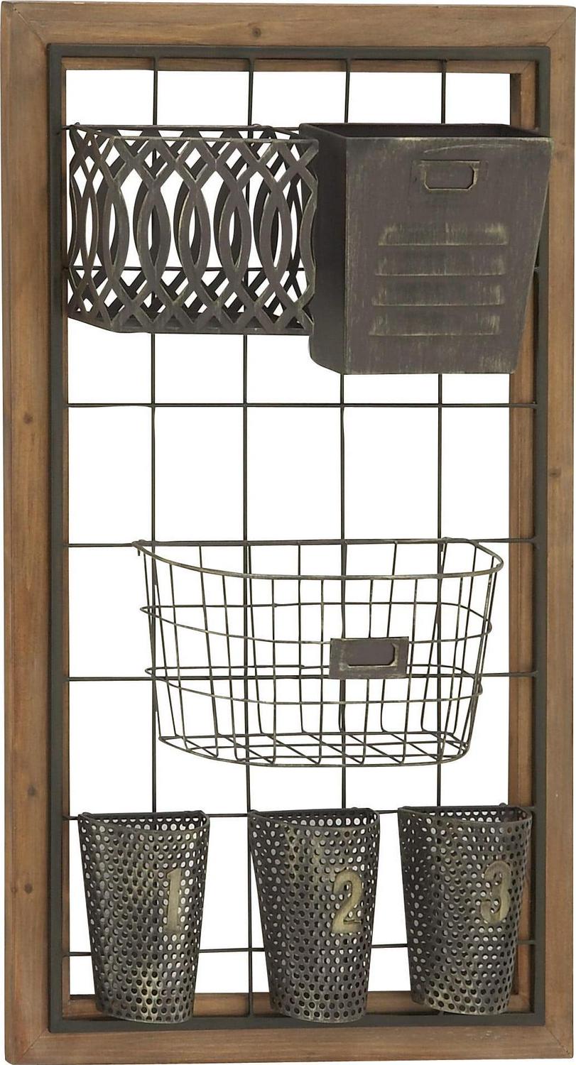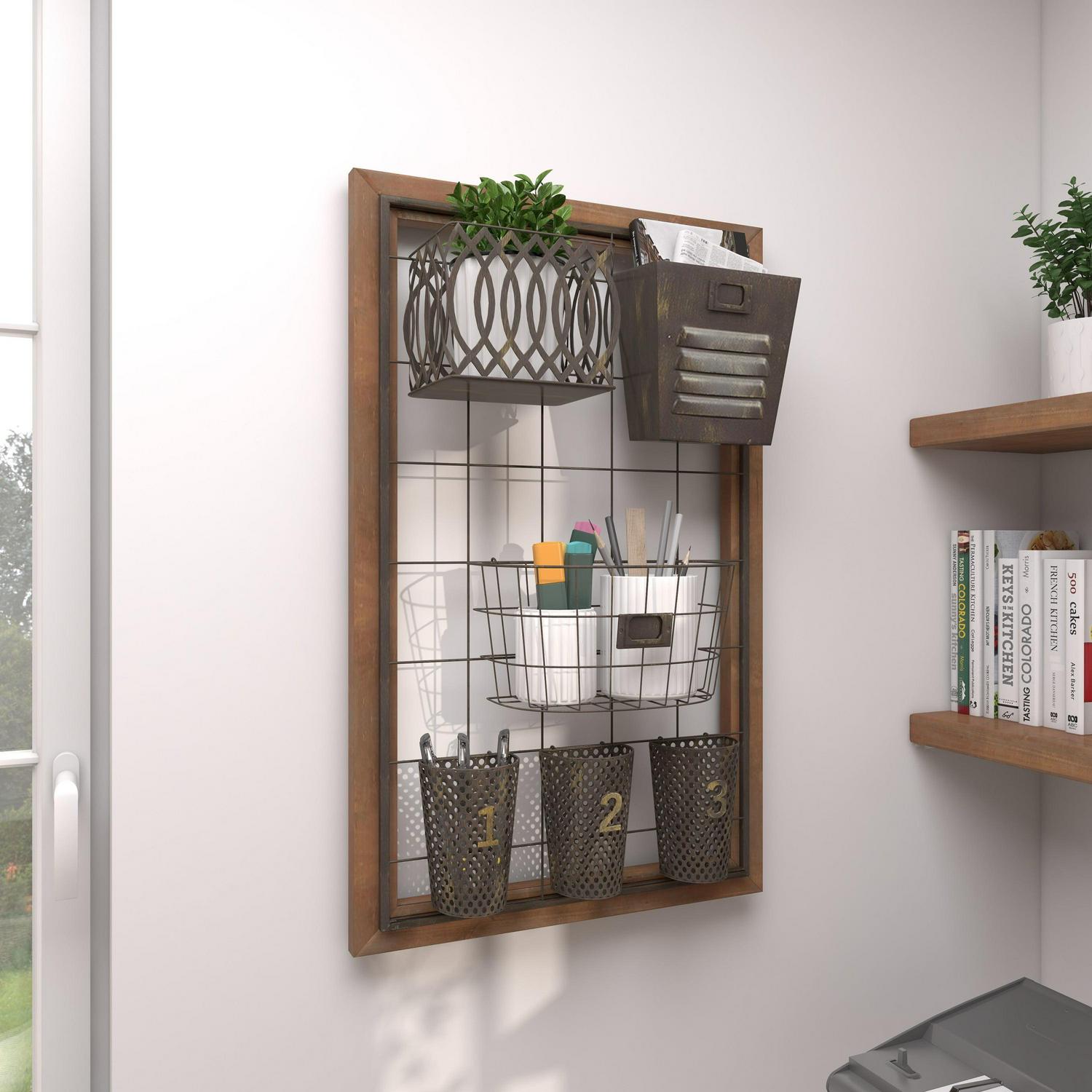 – This wall storage organizer features a rectangular frame and a wire panel holding 3 perforated cup containers, 1 rectangle basket with a trellis pattern, 1 large file cabinet basket, and 1 wide metal grid basket