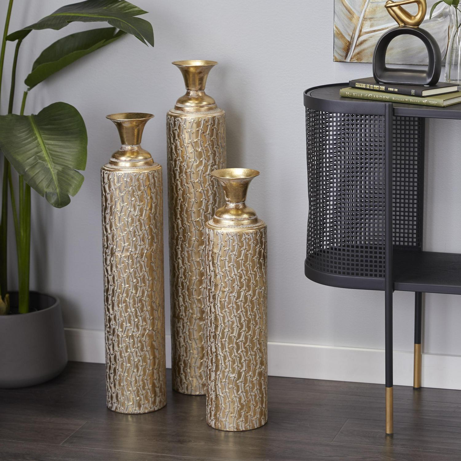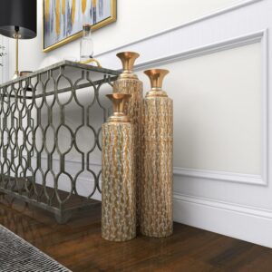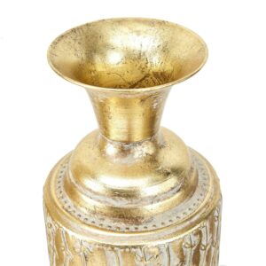 DecMode 34″, 29″, 25″H Tall Distressed Metallic Gold Metal Vase with Growing Vine Pattern, Set of 3 is a unique addition to your stylish home. Add a touch of glamour on your splendid living spaces as you decorate your tables with these focal point geometric vases that blends well on both light and dark toned interior settings. Designed with felt or rubber stoppers at the base that prevent scratching furniture and table tops, as well as sliding around. This item ships in 1 carton. Suitable for indoor use only. This item ships fully assembled in one piece. This gold colored vase comes as a set of 3. Glam style. Vases have 1.50 in, 1.50 in, and 1.50 in mouth openings.