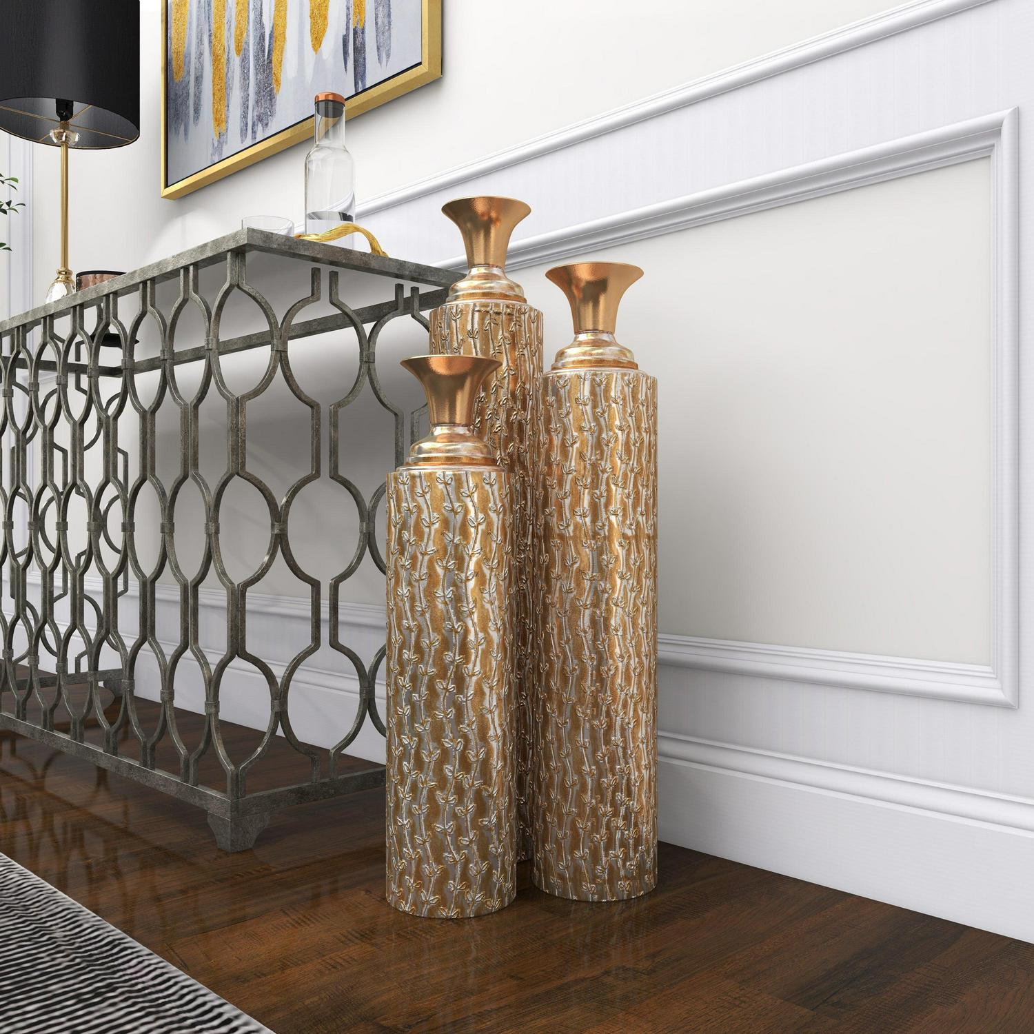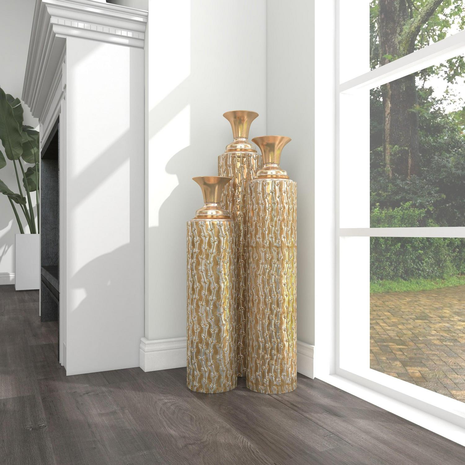 DecMode 34 , 29 , 25 H Tall Distressed Metallic Gold Metal Vase with Growing Vine Pattern, Set of 3