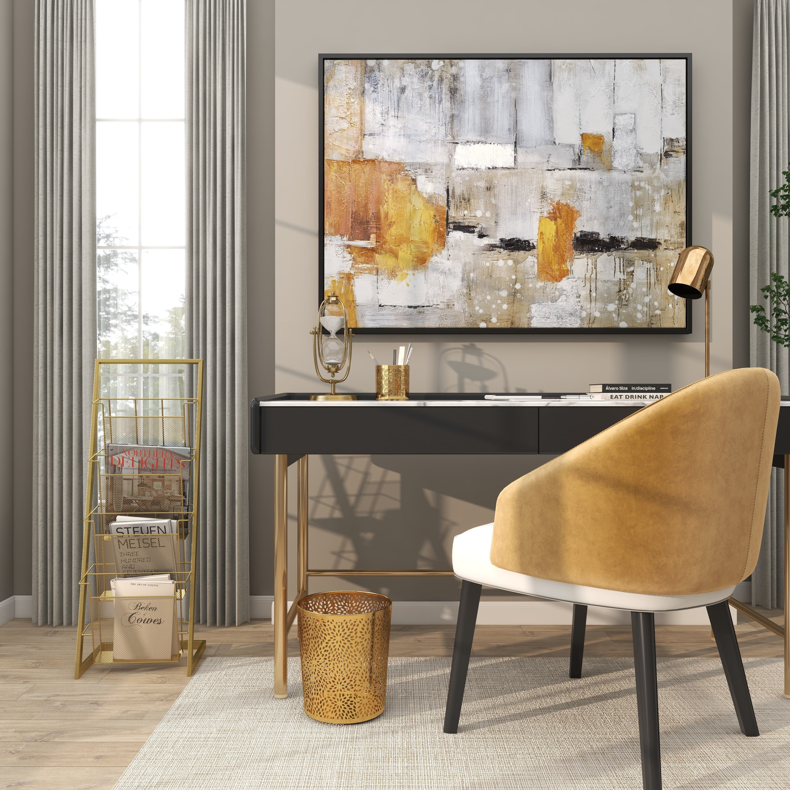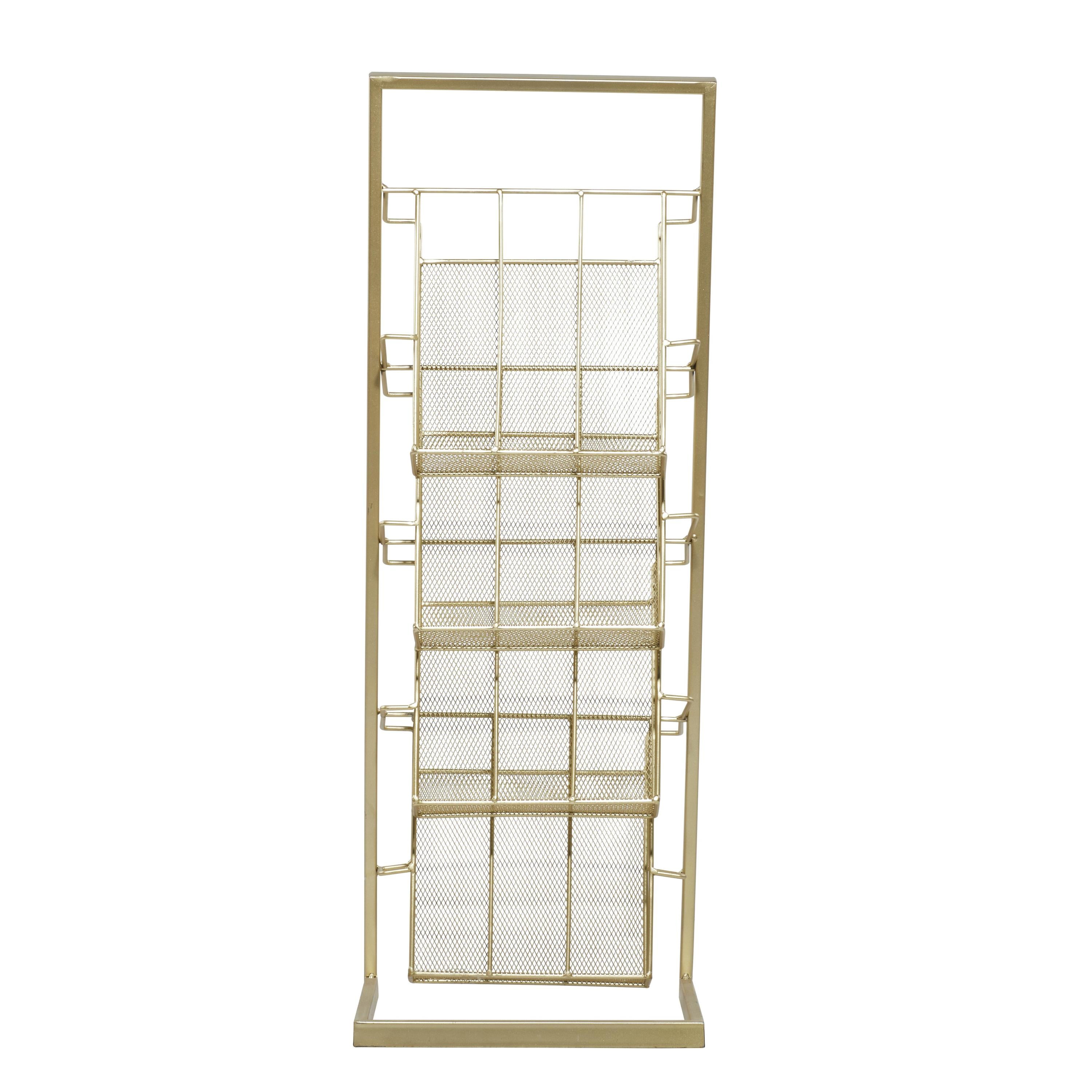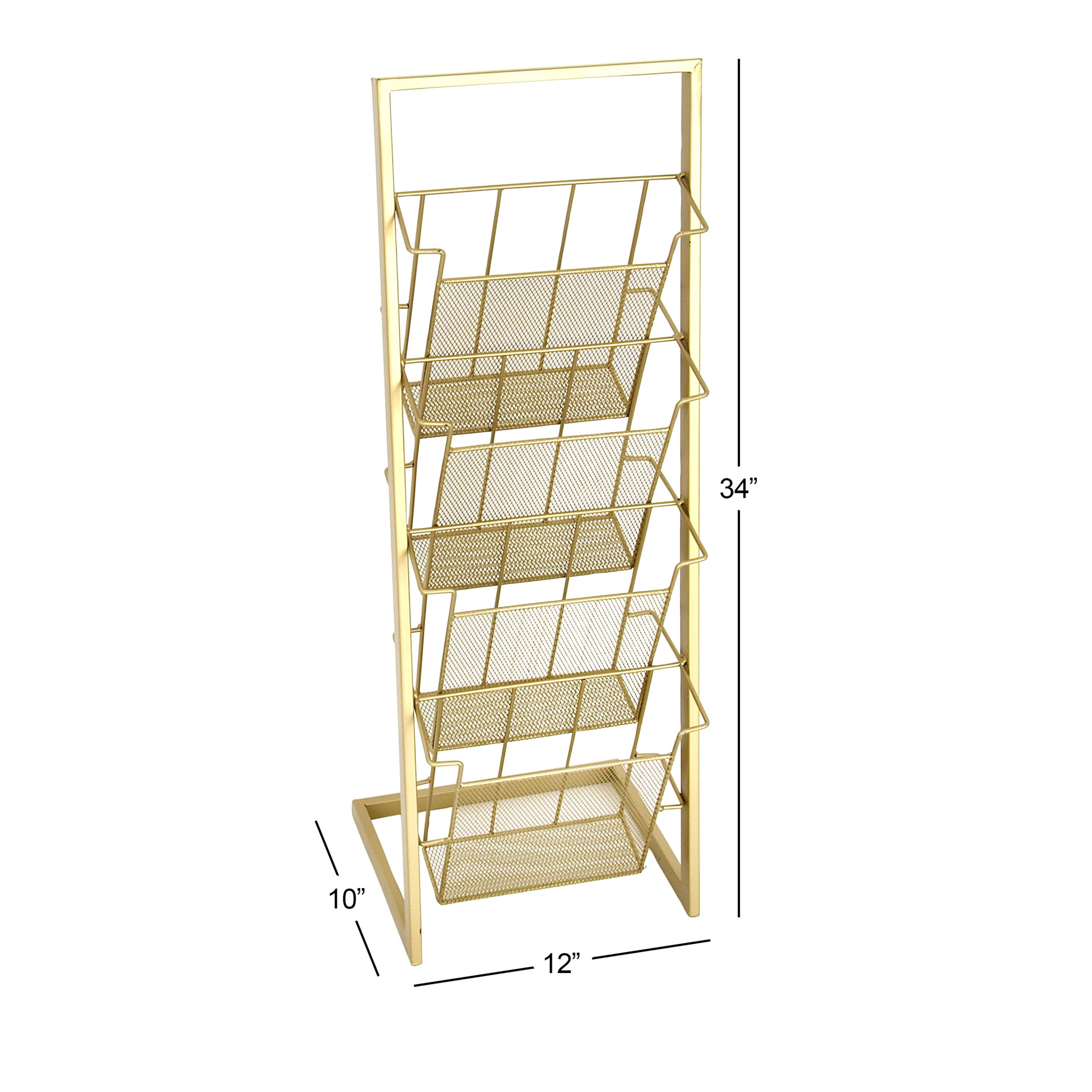 Embrace artistic expression with a style that highlights bold designs with sleek lines, neutral elements, and a minimalist aesthetic Office magazine organizer was crafted from solid iron 4-tier freestanding magazine organizer carries a metallic gold finish Mesh magazine organizer features 4 tiers of basket containers attached to a freestanding metal frame The gold metal magazine holder measures 12L x 10W x 34H inches, and weighs 6.8 lbs This solid gold standing magazine rack carries a slanted rectangle frame and 4 mesh baskets Wipe clean with a dry cloth Features a solid welded metal design for the frame and baskets Contemporary style DecMode 34″ Gold Metal 4 Slot Magazine Holder with Tall Stand makes a perfect addition to any home