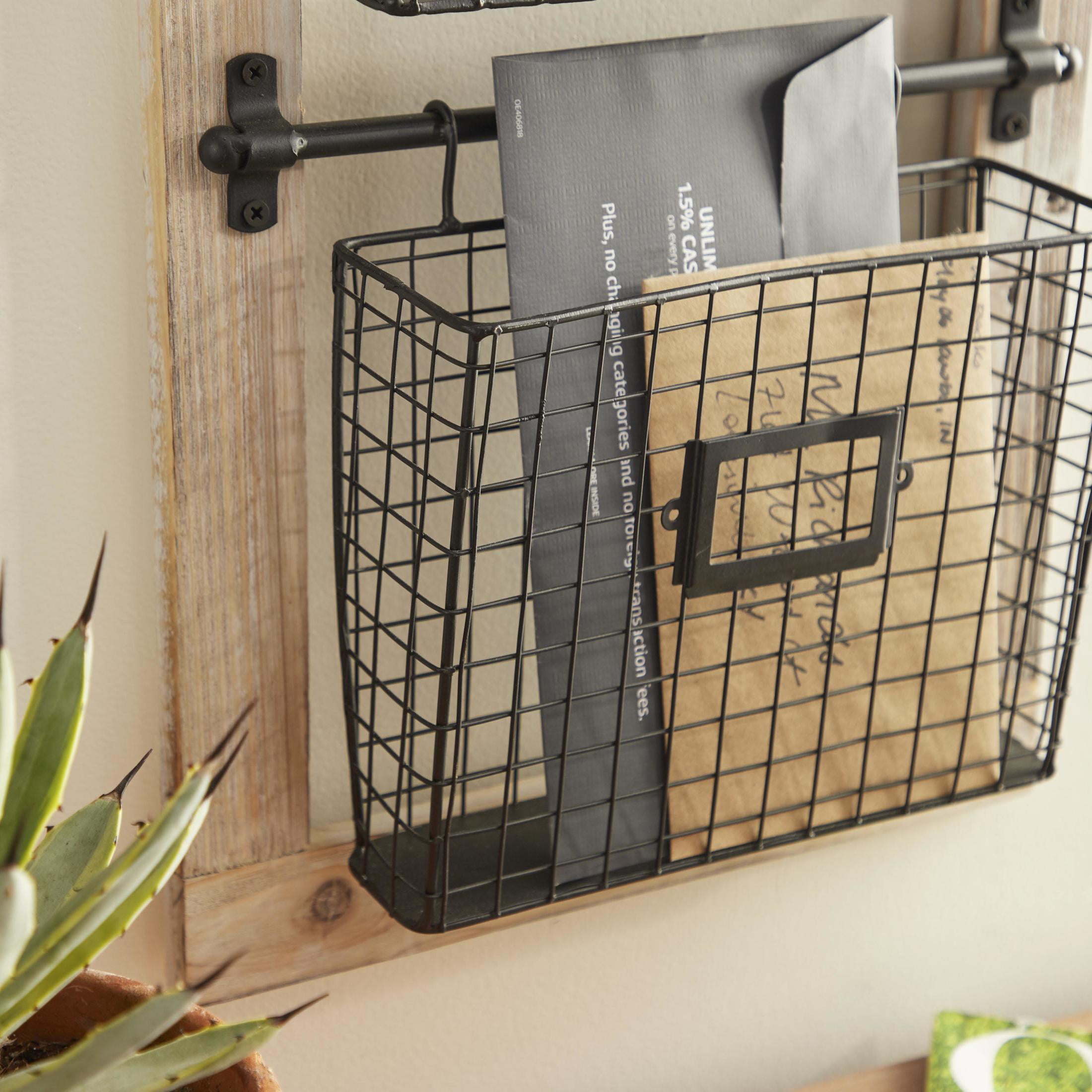 Infuse your home with cozy charm, where weathered textures, rustic finishes, and warm earthy tones create a wholesome atmosphere This wall basket organizer features are made of a solid metal structure Rectangular 2-tiered iron and wood wall rack features a distressed brown wooden finish and a polished black metal finish This wall rack and shelf features 3 tiers of wire baskets and a rectangle wood panel that holds the entire piece together The magazine rack holder measures 14L x 4W x 36H inches, and weighs 2.0 lbs This rectangle wall hung magazine rack carries 3 solid black wire baskets on its brown wooden frame Wipe clean with a dry cloth The baskets on this wall-mounted spice wall rack are fixed on a vertically oriented rectangle panel via metal rods and screws Farmhouse style DecMode 36″ Black Metal 3 Slot Wire Magazine Rack Holder with Suspended Baskets and Label Slots makes a perfect addition to any home