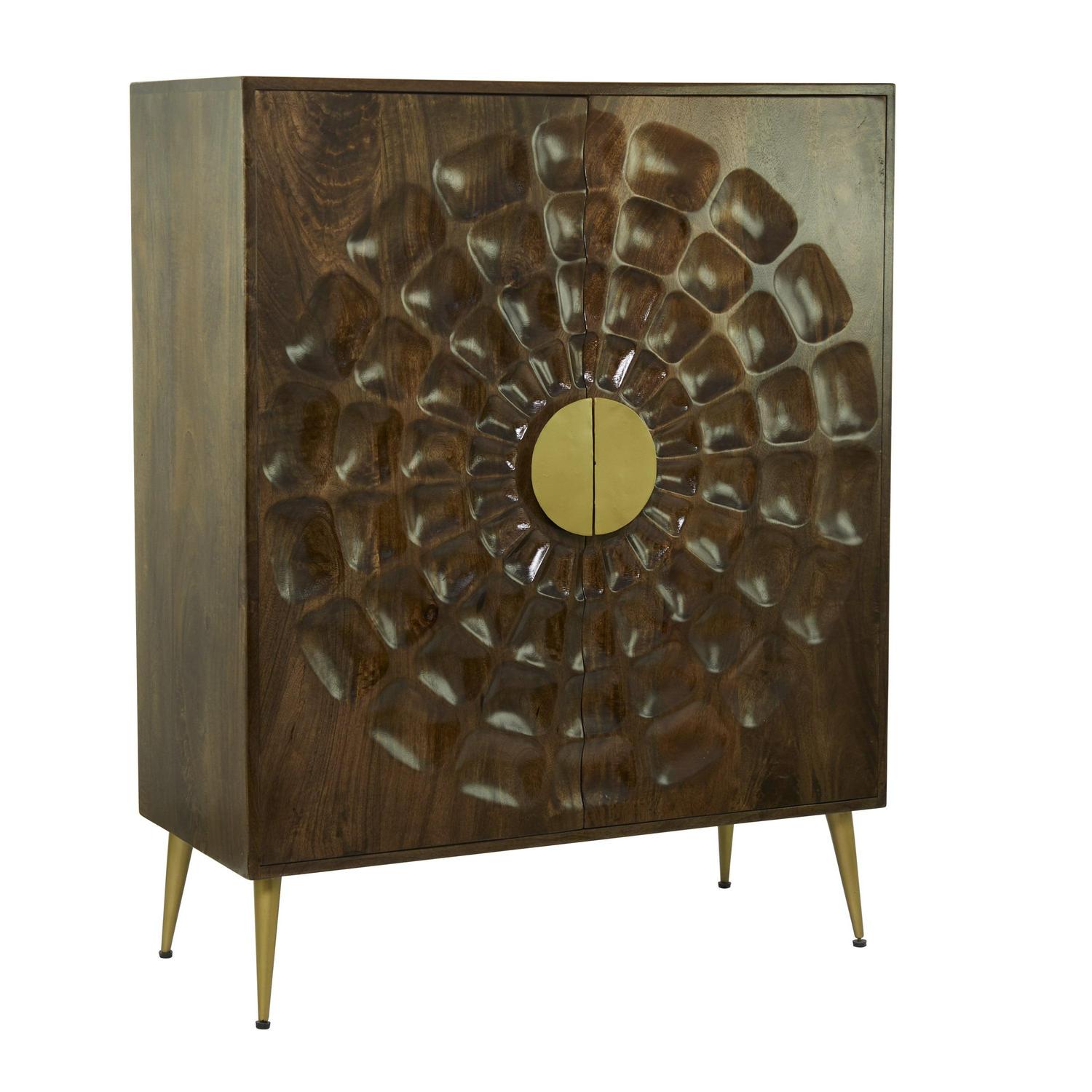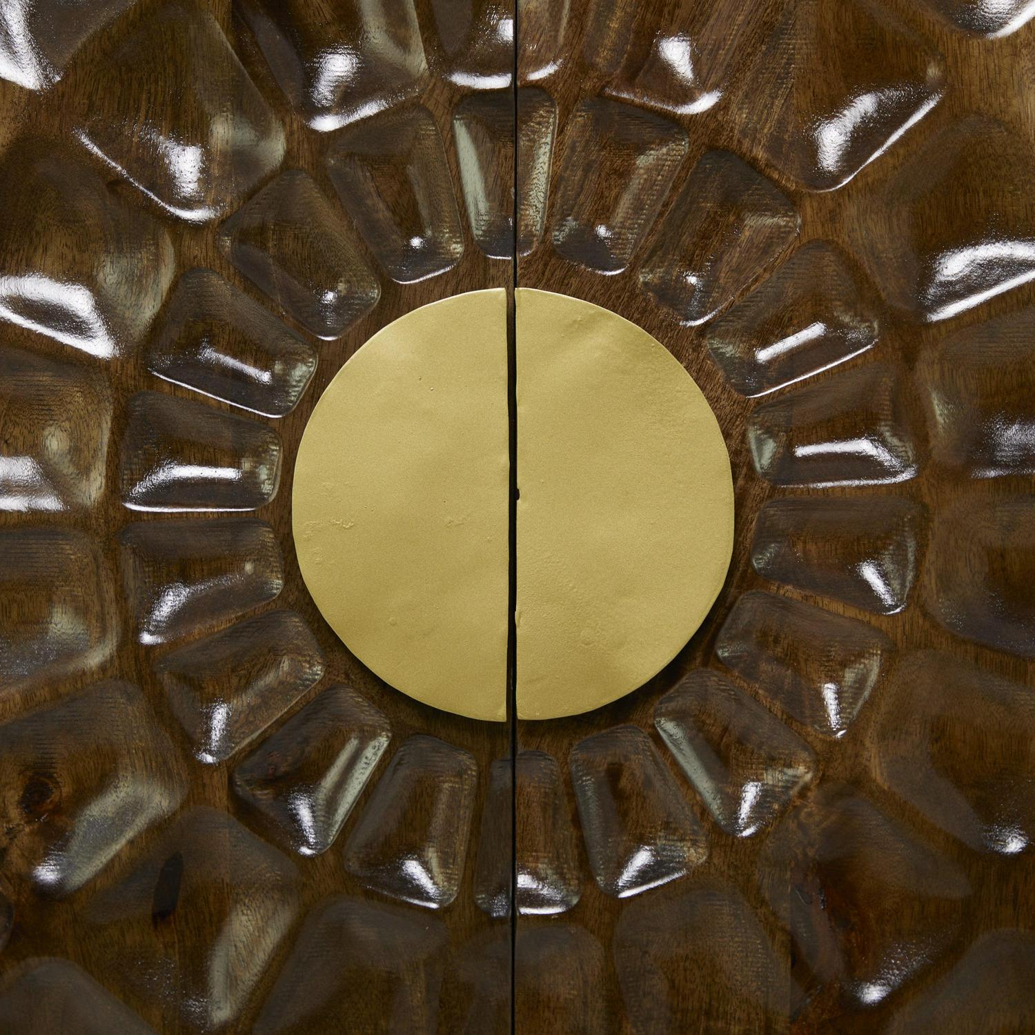 - This storage cabinet accentuates a rectangular form with carved sun ray patterns