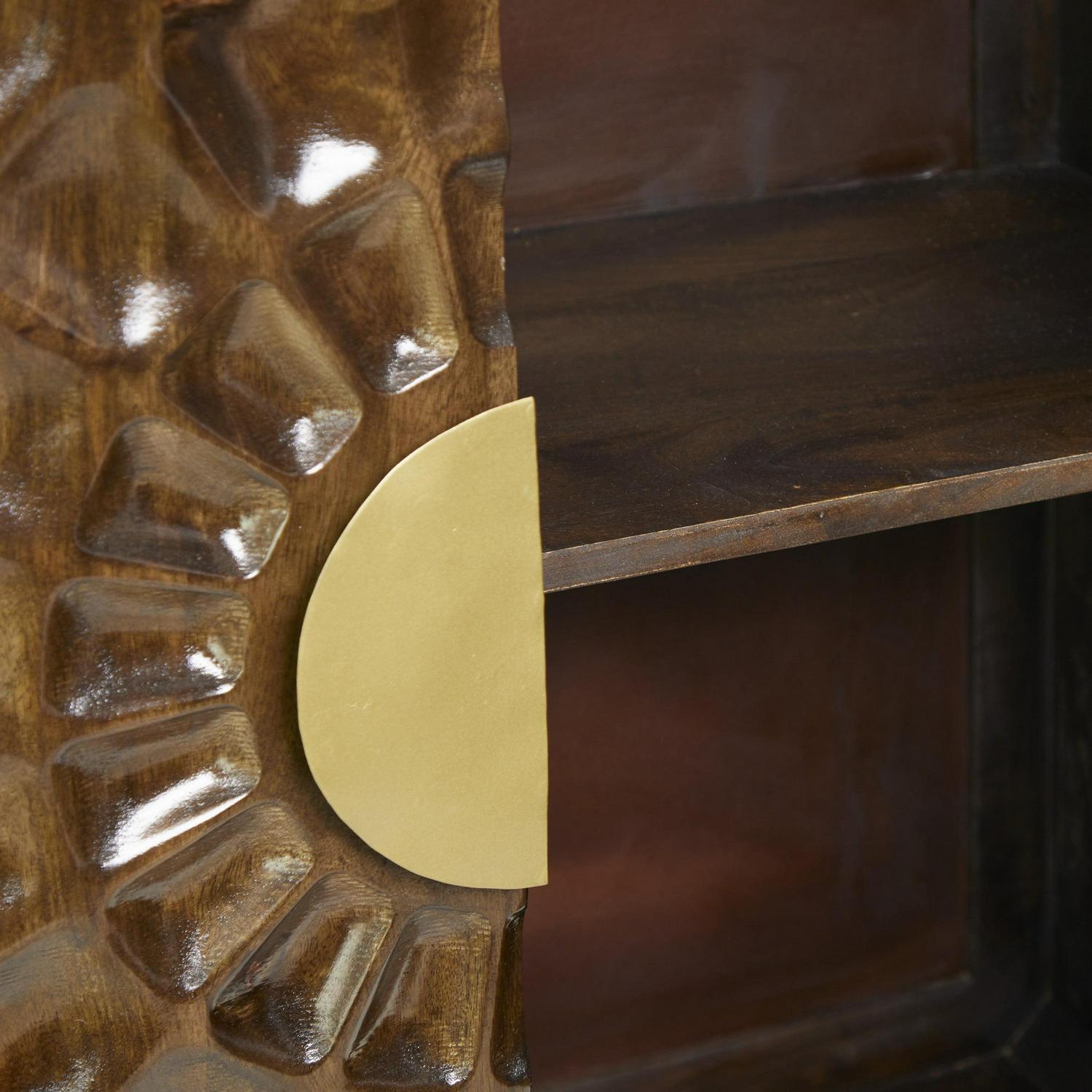 – This storage cabinet accentuates a rectangular form with carved sun ray patterns