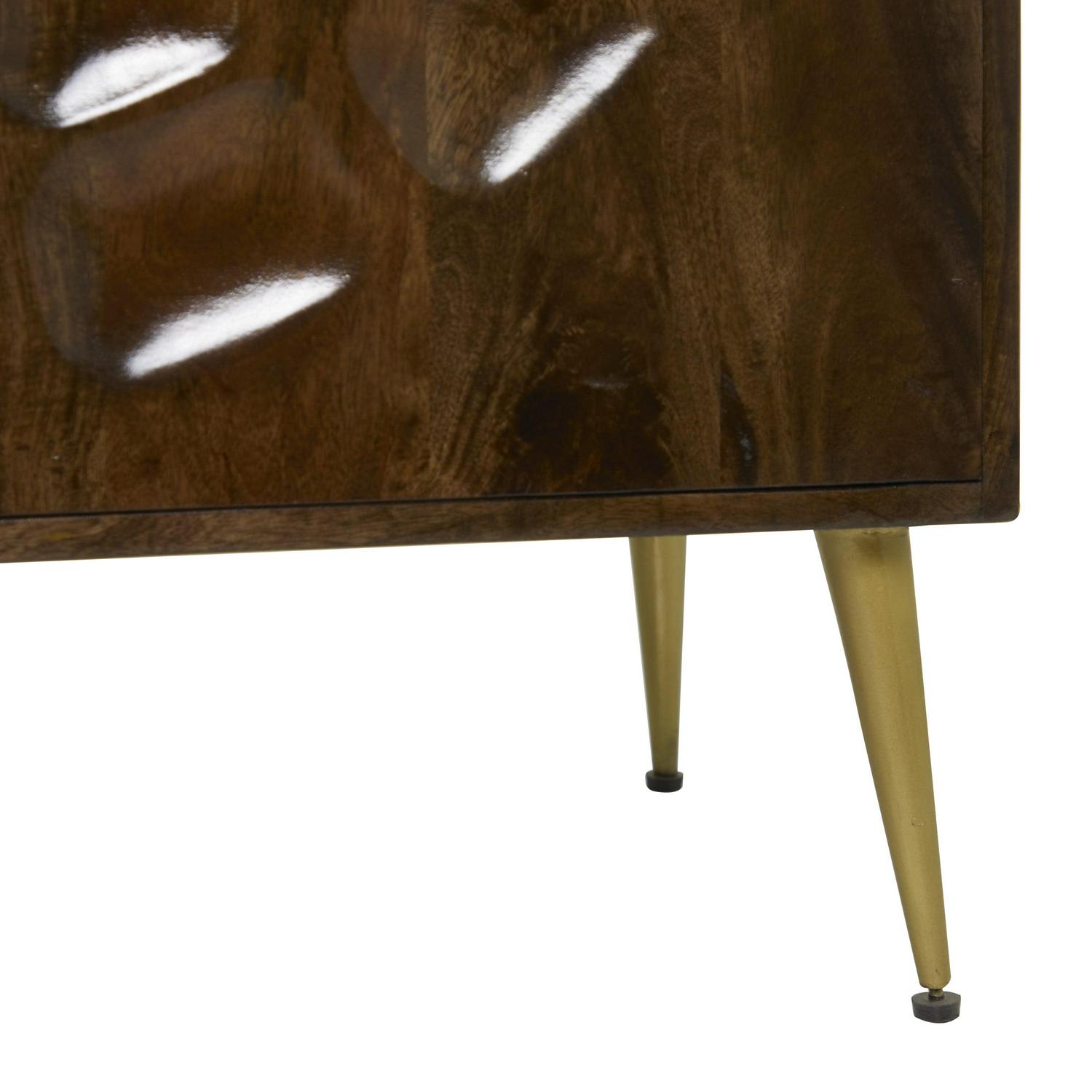 - Wood is carved and polished into this storage cabinet and attached with iron splayed leg stands