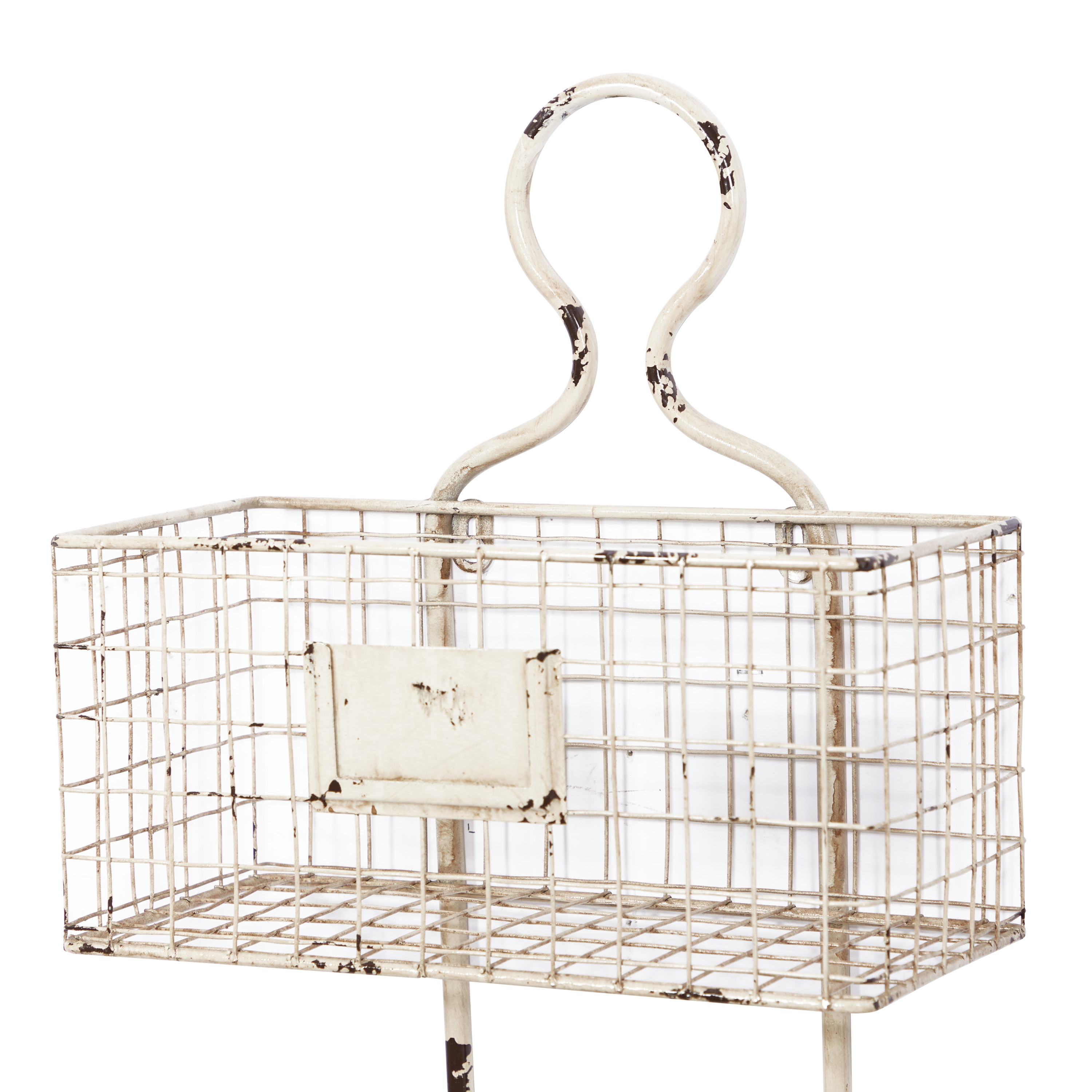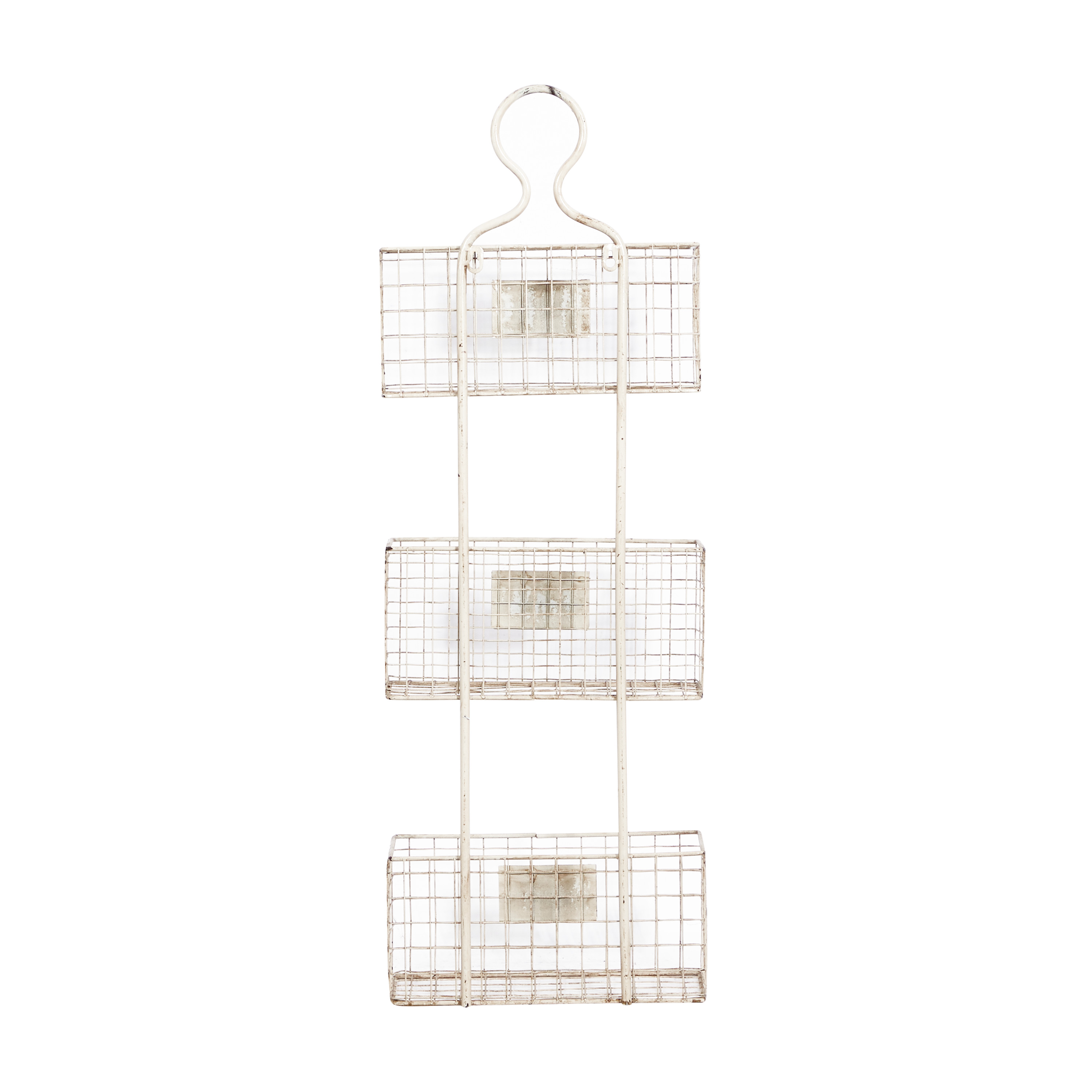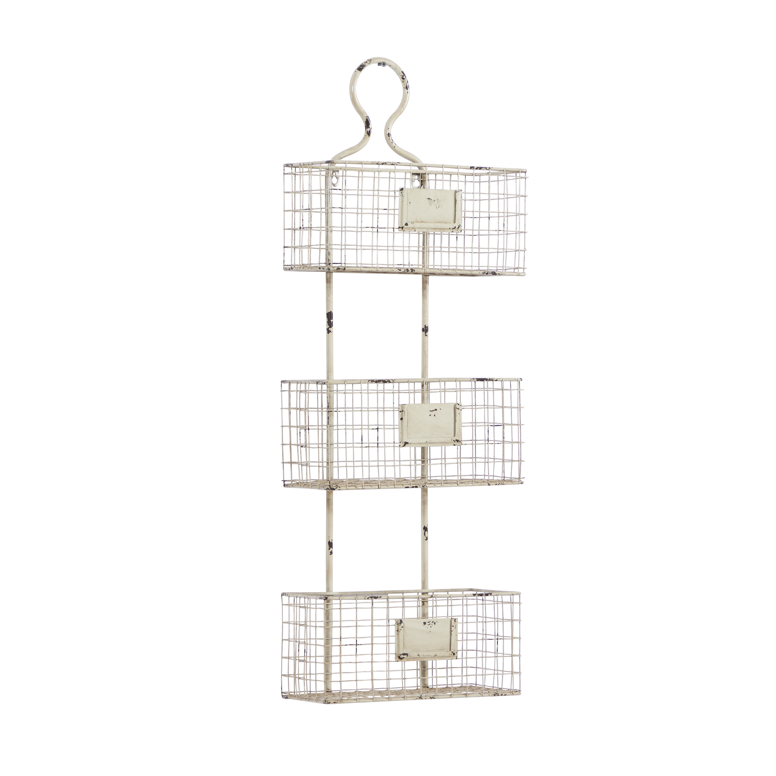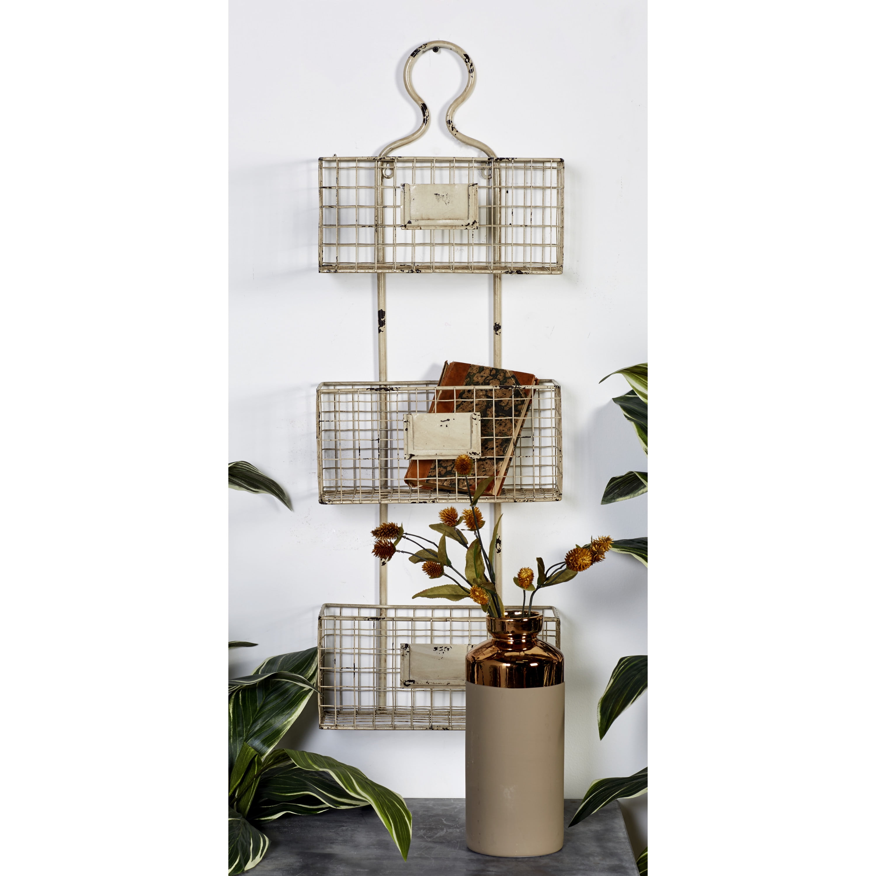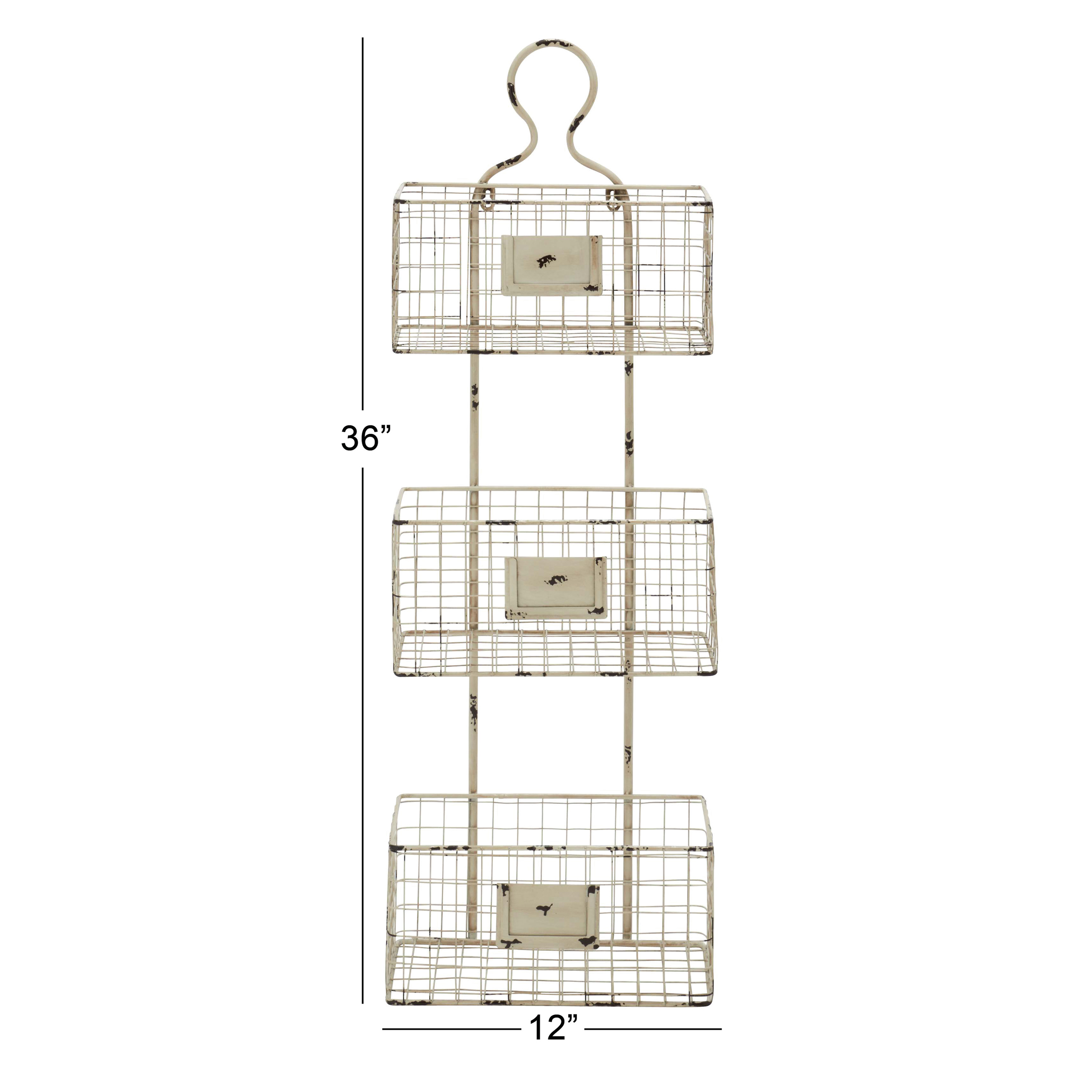 Infuse your home with cozy charm, where weathered textures, rustic finishes, and warm earthy tones create a wholesome atmosphere Wall mounted shelf is crafted with iron material Farmhouse basket shelf highlights a distressed white overall finish Features a 3-tier basket system design for more storage space This item measures 12.5L x 6.5W x 36.5H inches, and weighs 4.84 lbs This farmhouse wall organizer accentuates a rectangular figure with baskets as shelves Wipe clean with a dry cloth Iron is bent and welded to form this wire basket shelf Farmhouse style DecMode 37″ White Metal 3 Hanging Baskets Magazine Rack Holder makes a perfect addition to any home