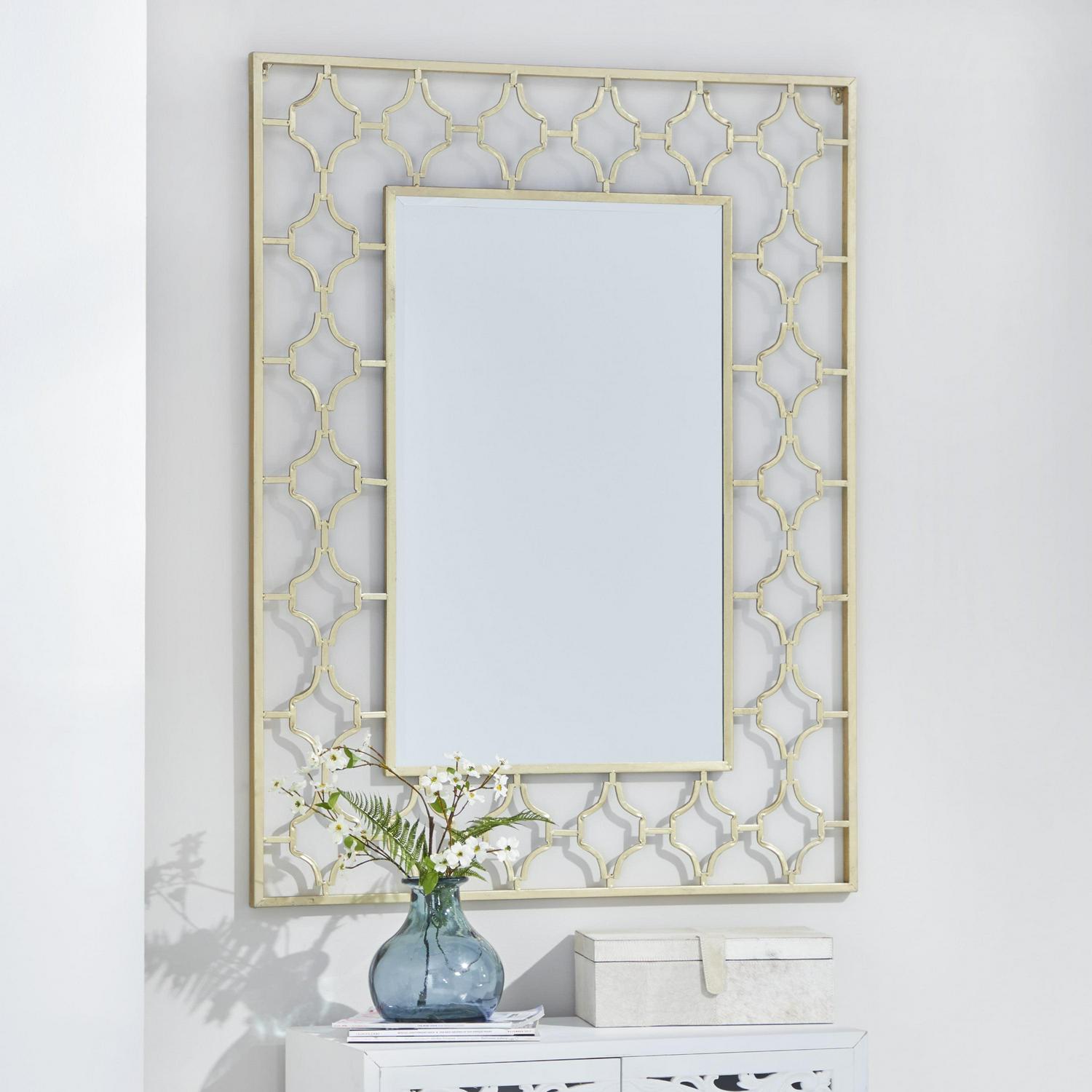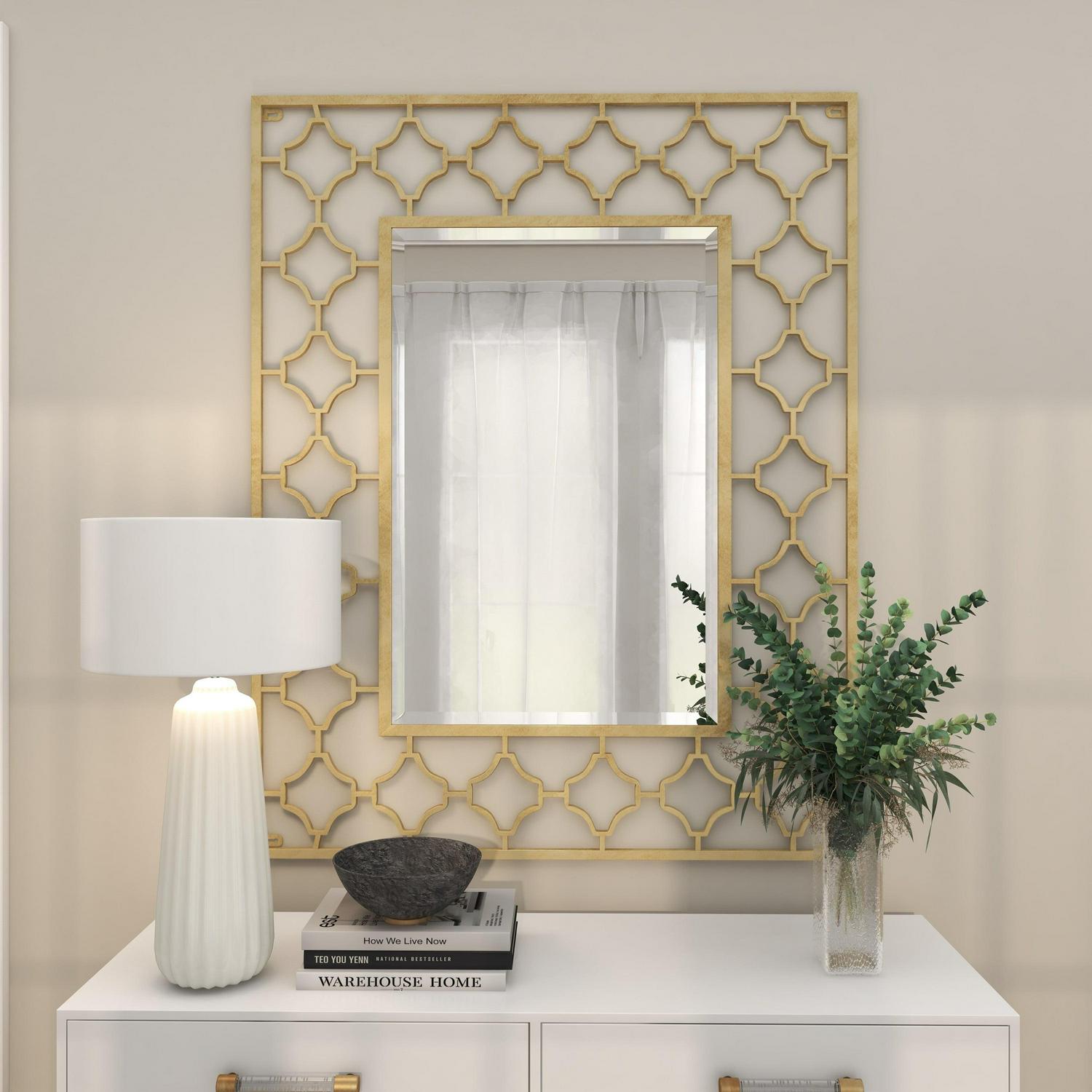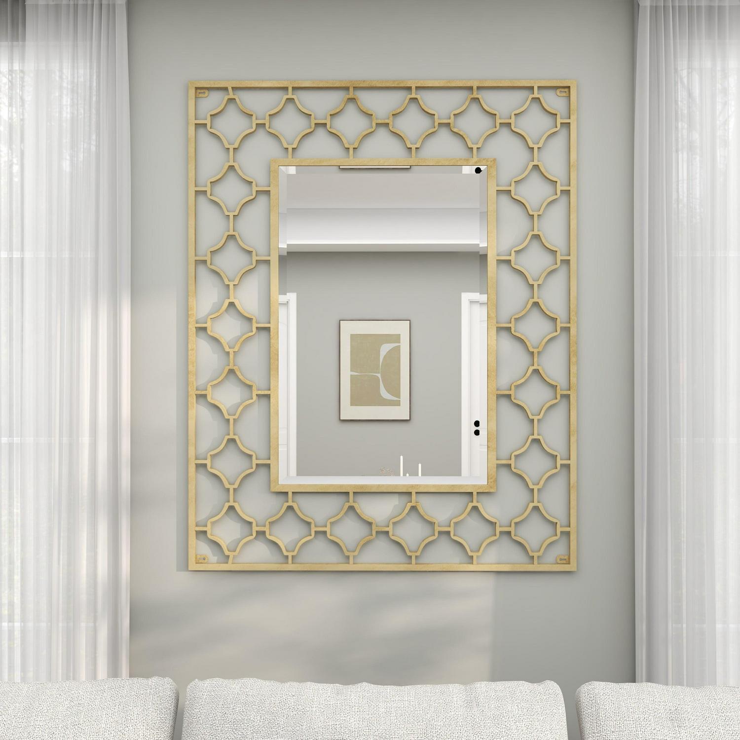 - This decorative wall mirror has a rectangular shape and quatrefoil pattern