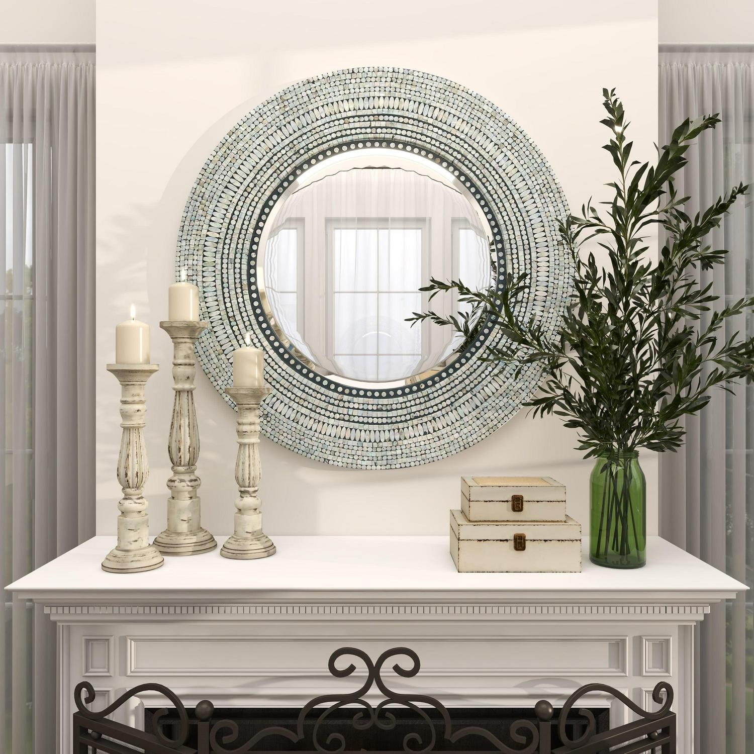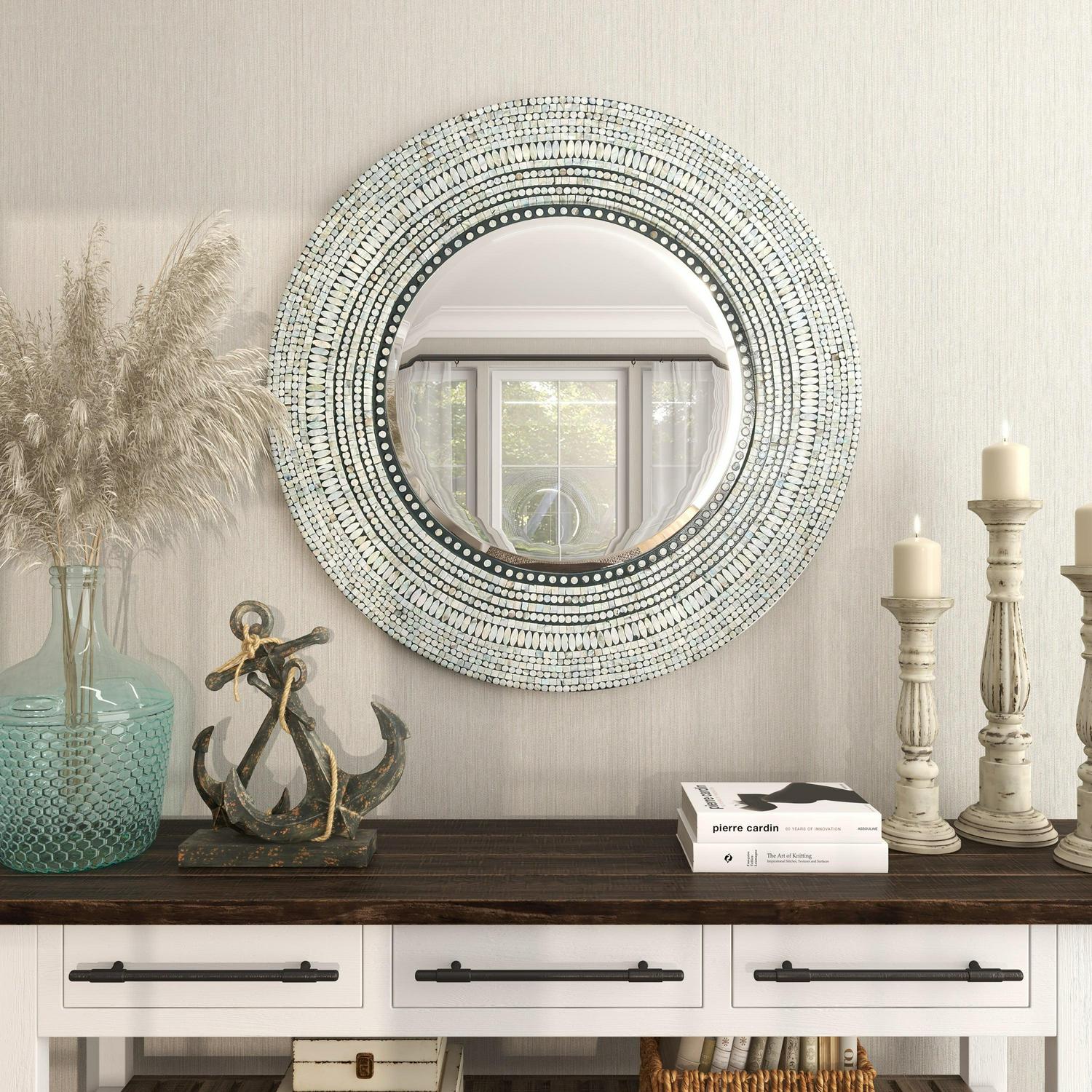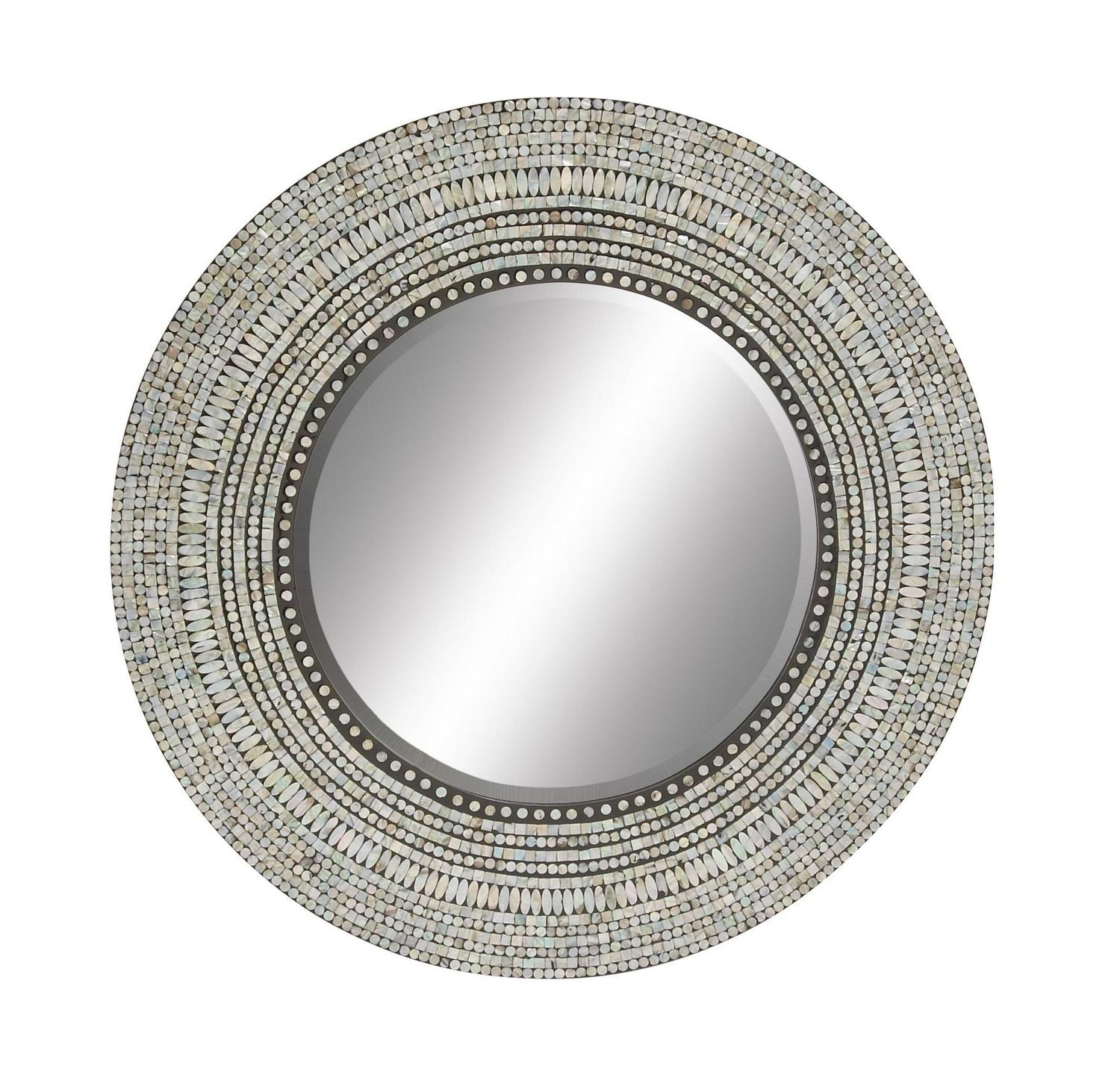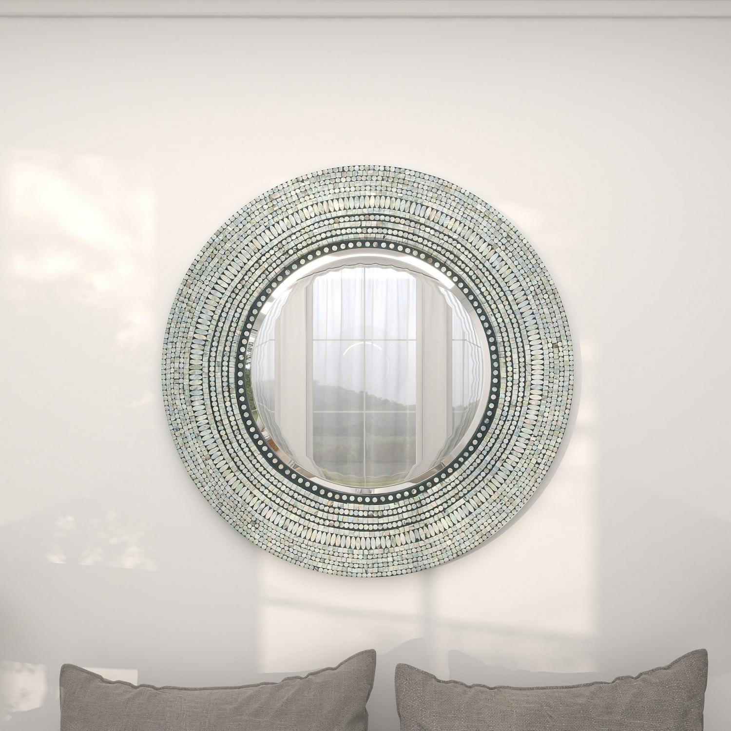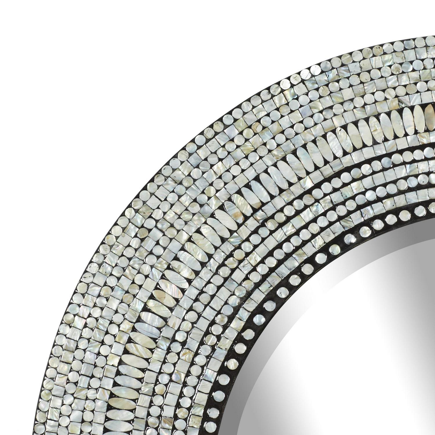 - Round wall mirror highlights layers of natural opalescent pearl mussel shells for an upscale design