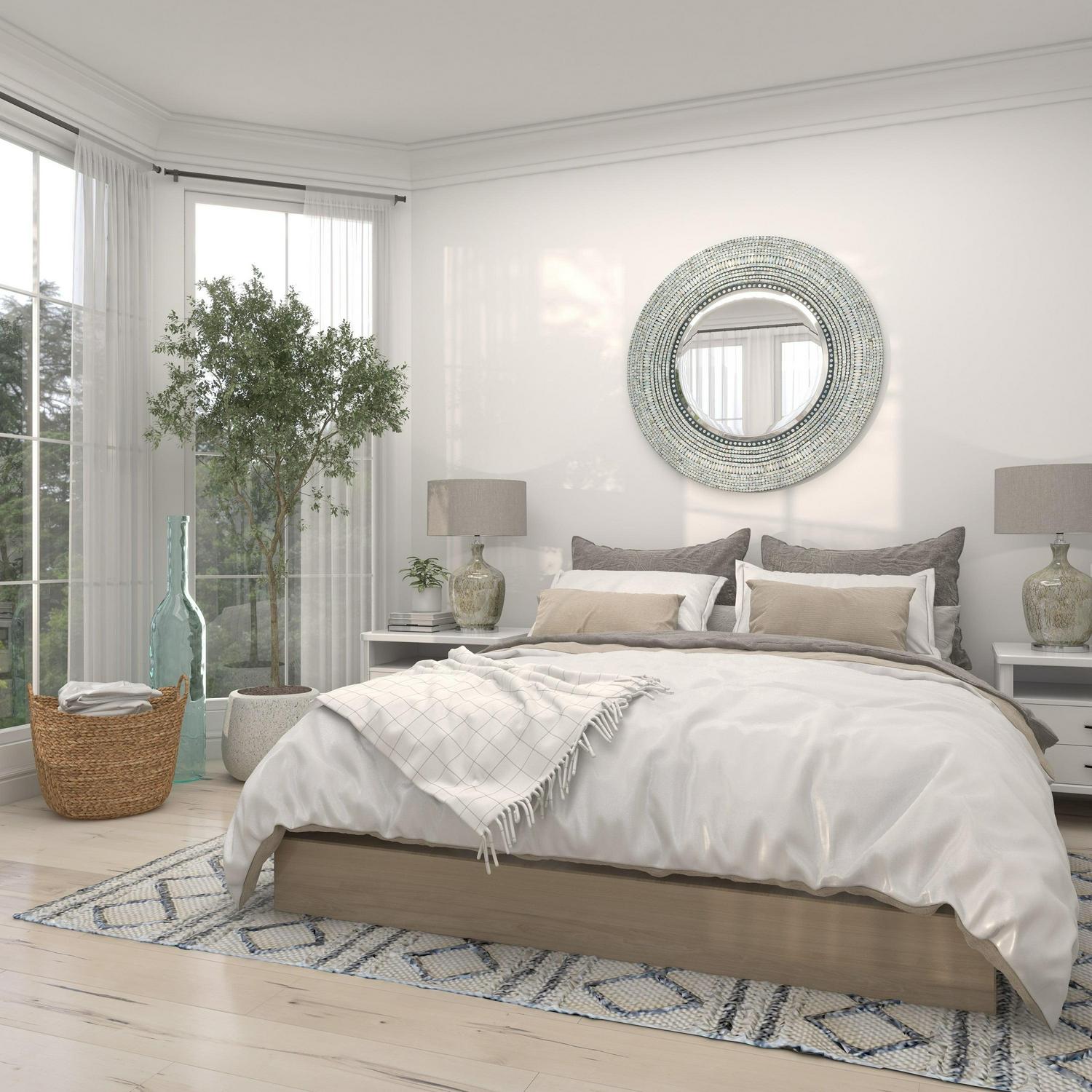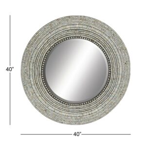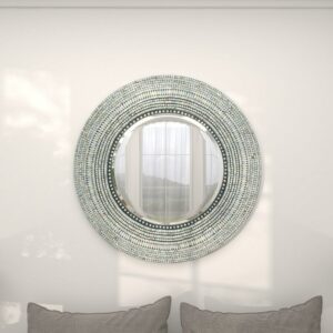 DecMode 39″ x 39″ Gray Handmade Mosaic Wall Mirror is a unique addition to your stylish home. Add flair to your lobby, living room, or bedroom with this multicolor round wall mirror that reflects your style and helps bounce light around your space. This item ships in 1 carton. Due to the handmade nature of this item, no two will be alike, there will be slight differences in shape, size, and color. Can be hung vertically using the D-rings on the back; nails and screws not included. Suitable for indoor use only. This item ships fully assembled in one piece. Made in Vietnam. This is a single gray colored entryway mirror. Coastal style.