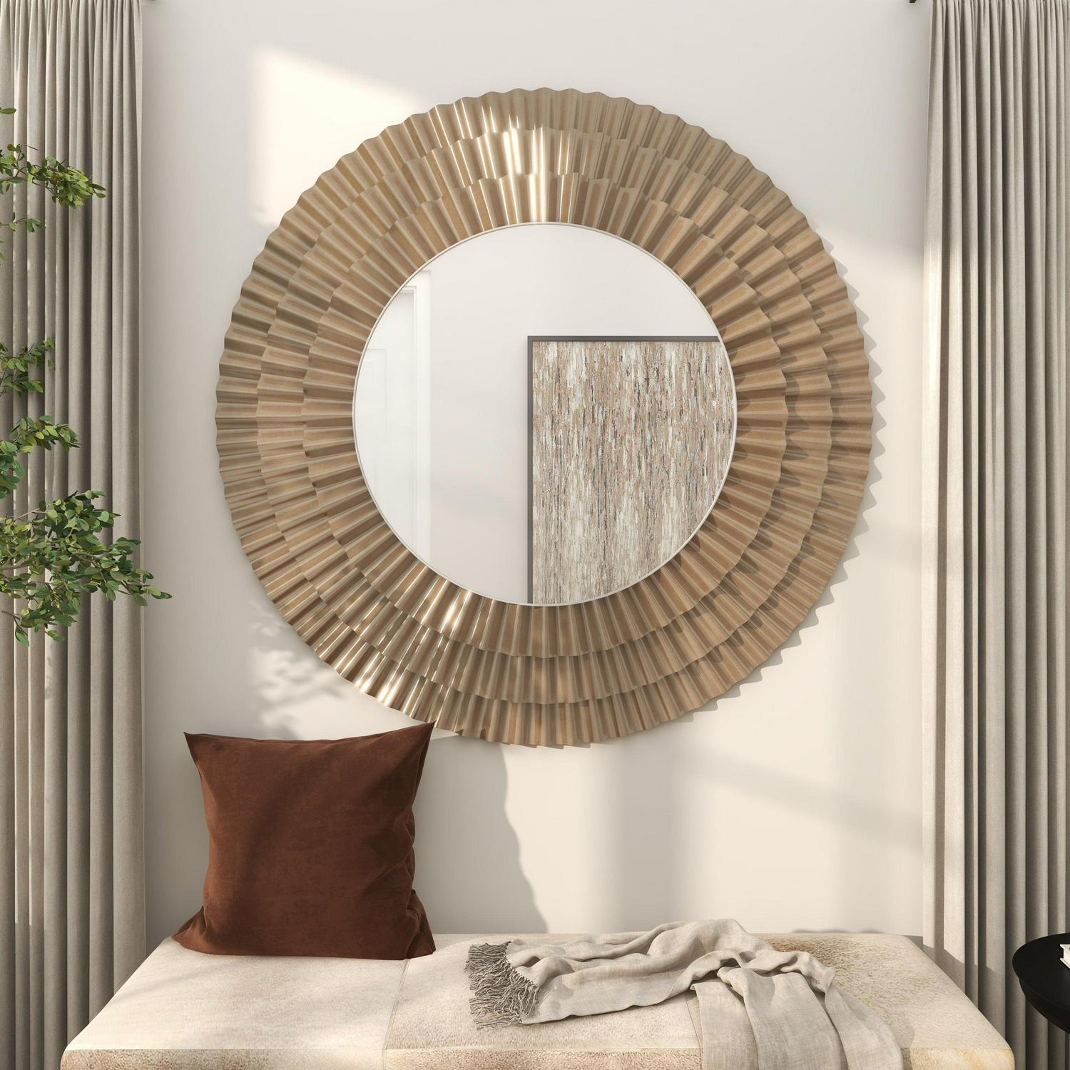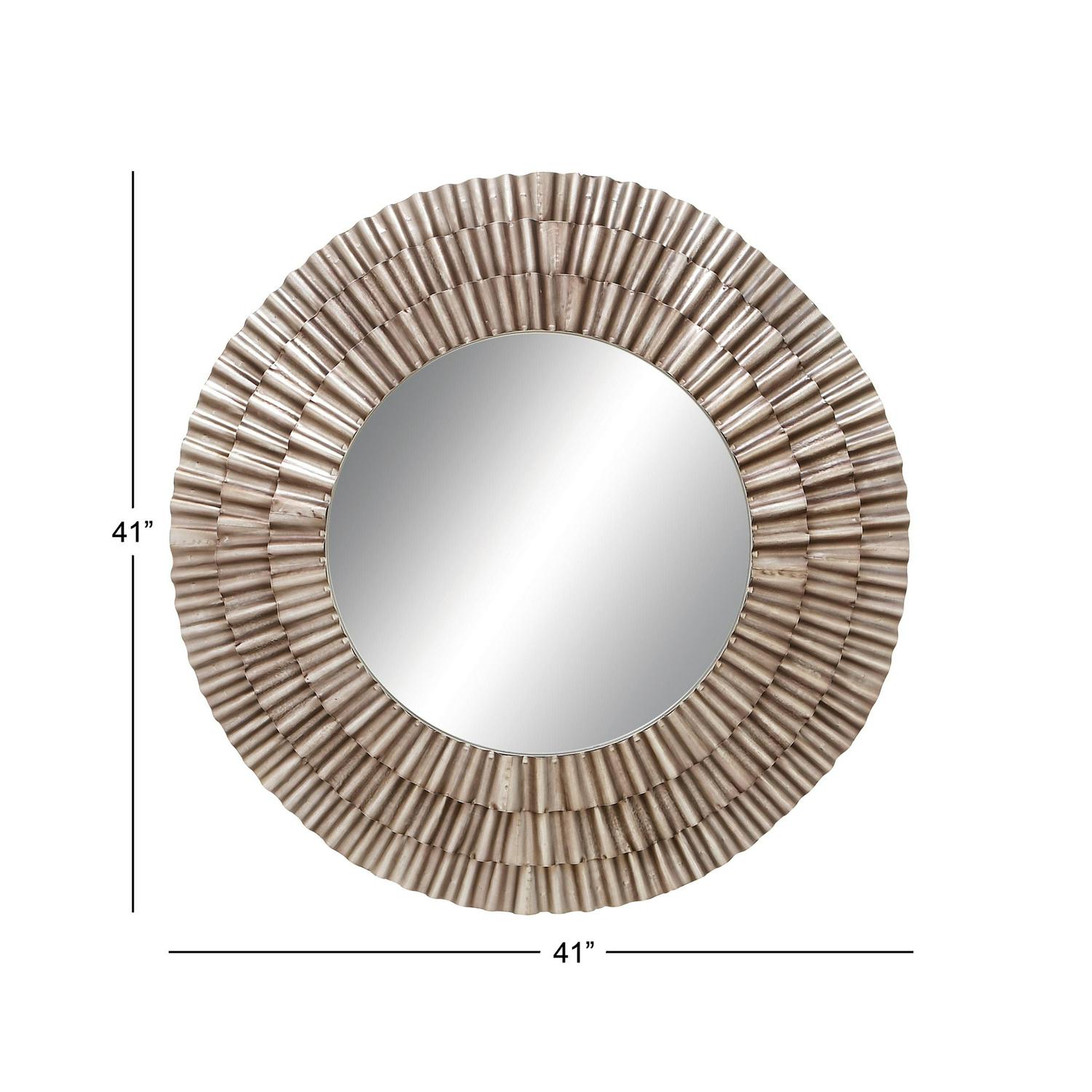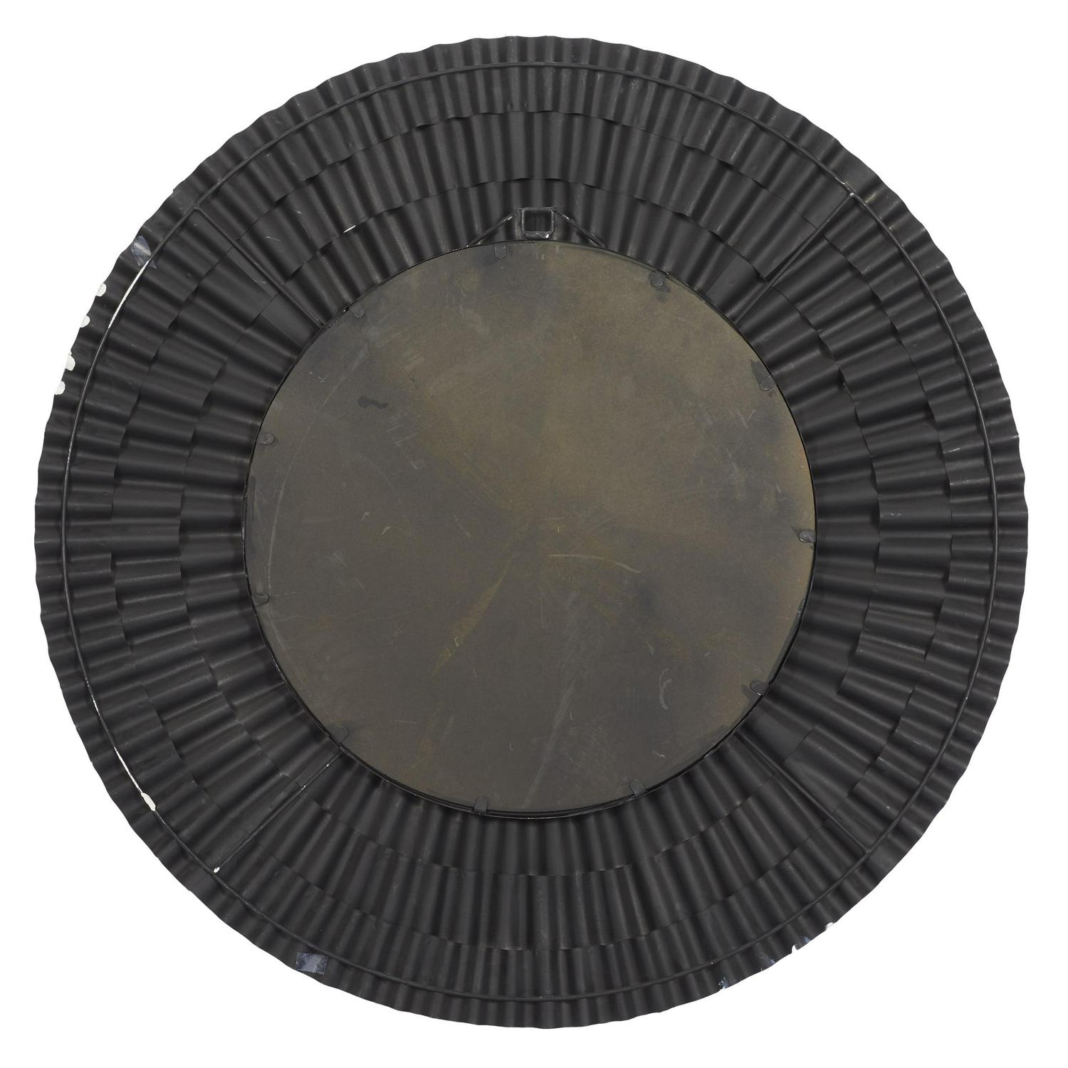 - Round mirror shape with a 3D ribboned pattern throughout the metal frame