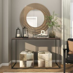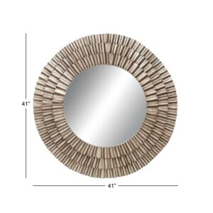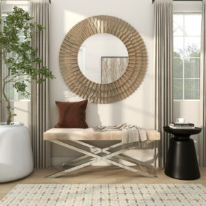 DecMode 42″ x 42″ Silver Starburst Wall Mirror is a unique addition to your stylish home. Apart from decorating your home, the purpose of this wall mirror is to bounce back outdoor light to a small room to make it look bigger. Pair this decorative wall mirror with house plants or other wall decor accent pieces to blend everything together perfectly. Display this accent decor as a focal point in your living room or dining room to add lively reflective texture to your space. This item ships in 1 carton. Can be hung vertically using the metal rings on the back; nails and screws not included. Suitable for indoor use only. This item ships fully assembled in one piece. This is a single silver colored entryway mirror. Rustic style.