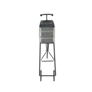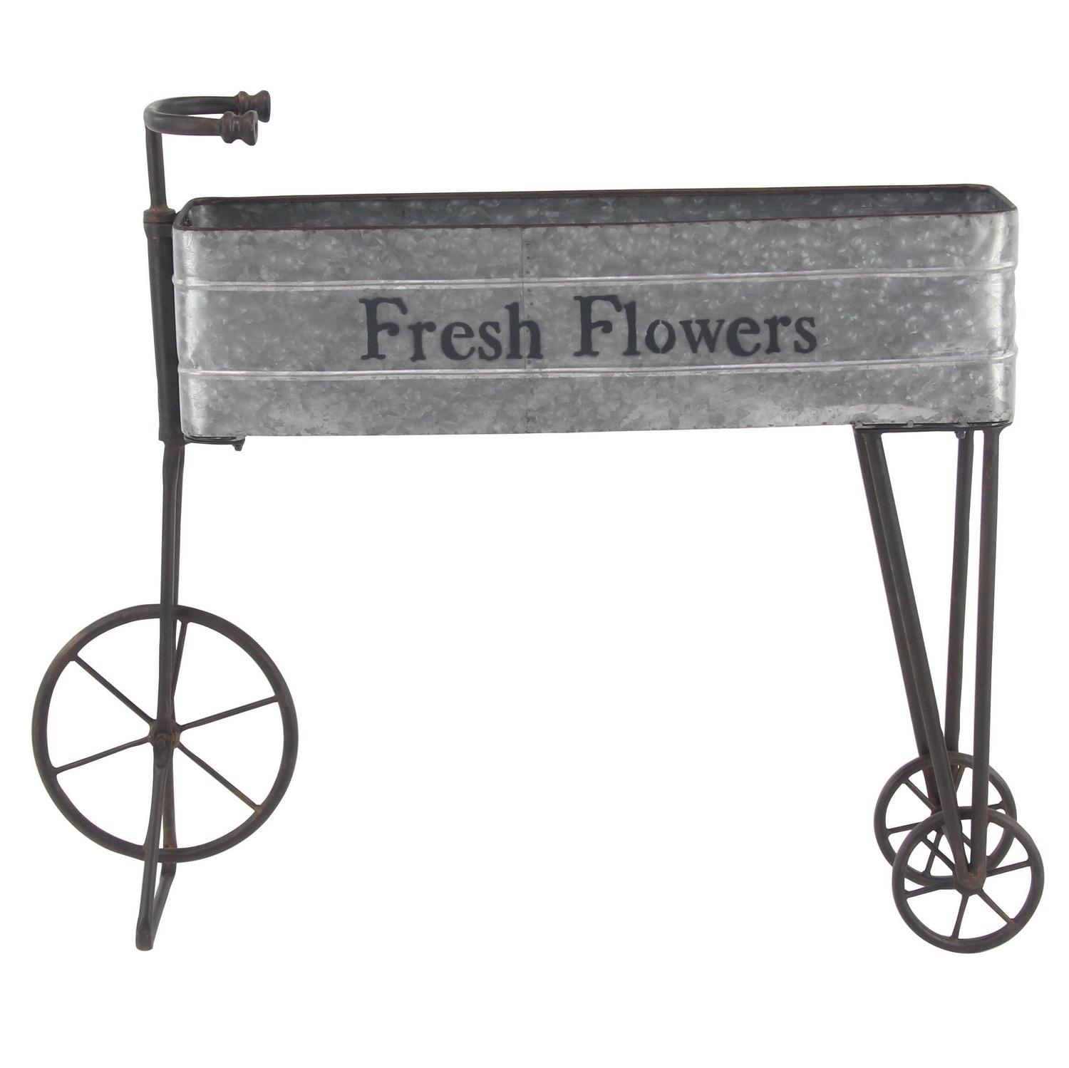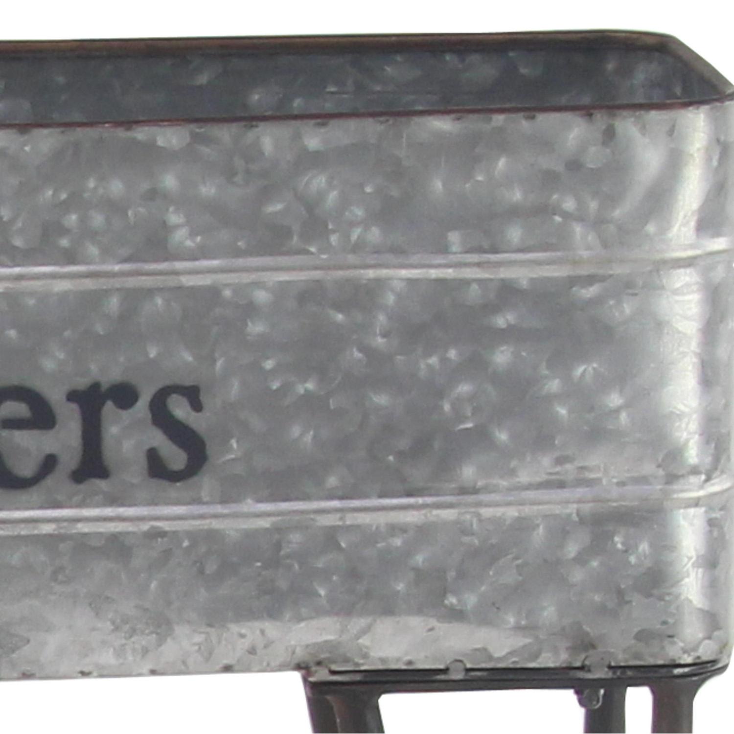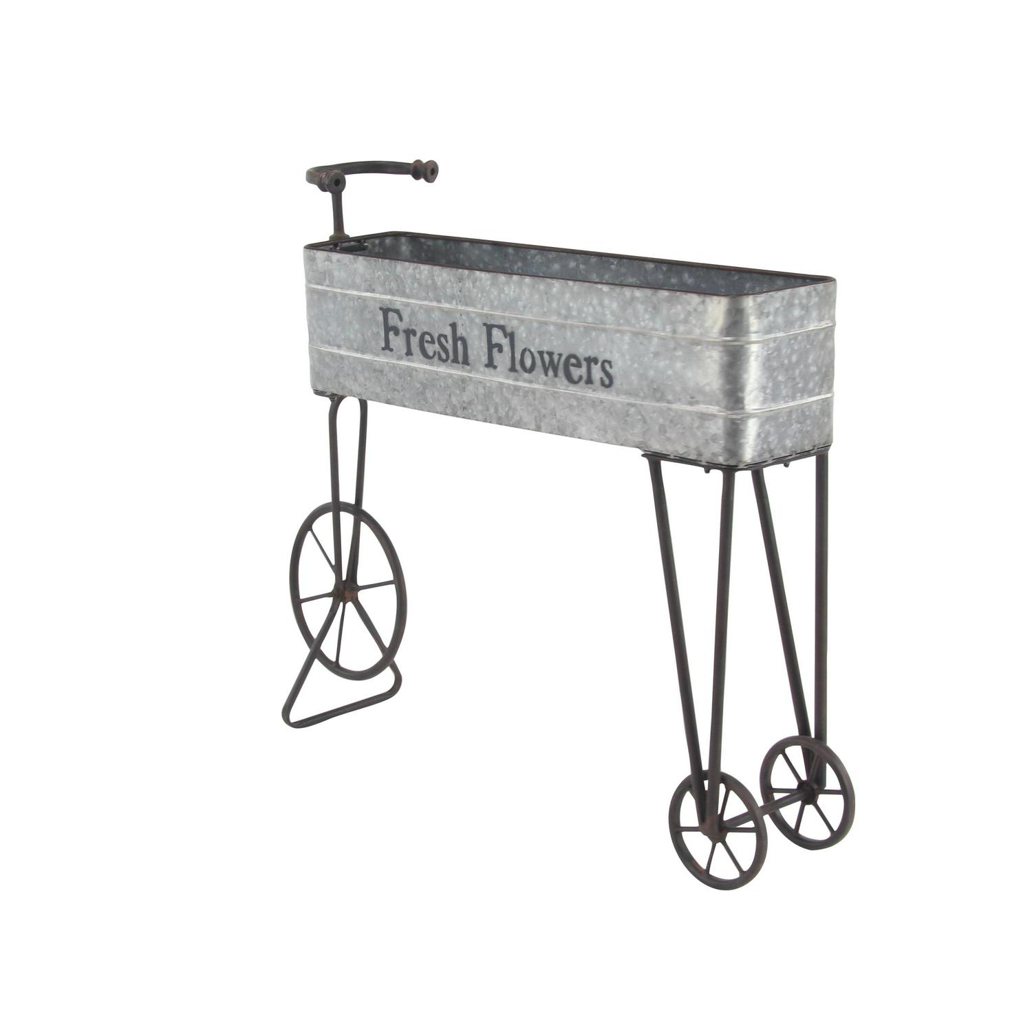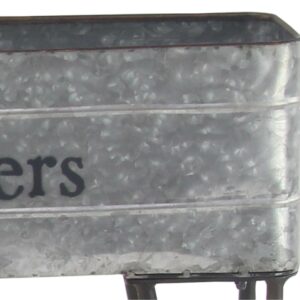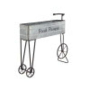 – This planter cart features a galvanized-looking rectangular box to hold pots and decorative handles, legs, and wheels