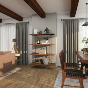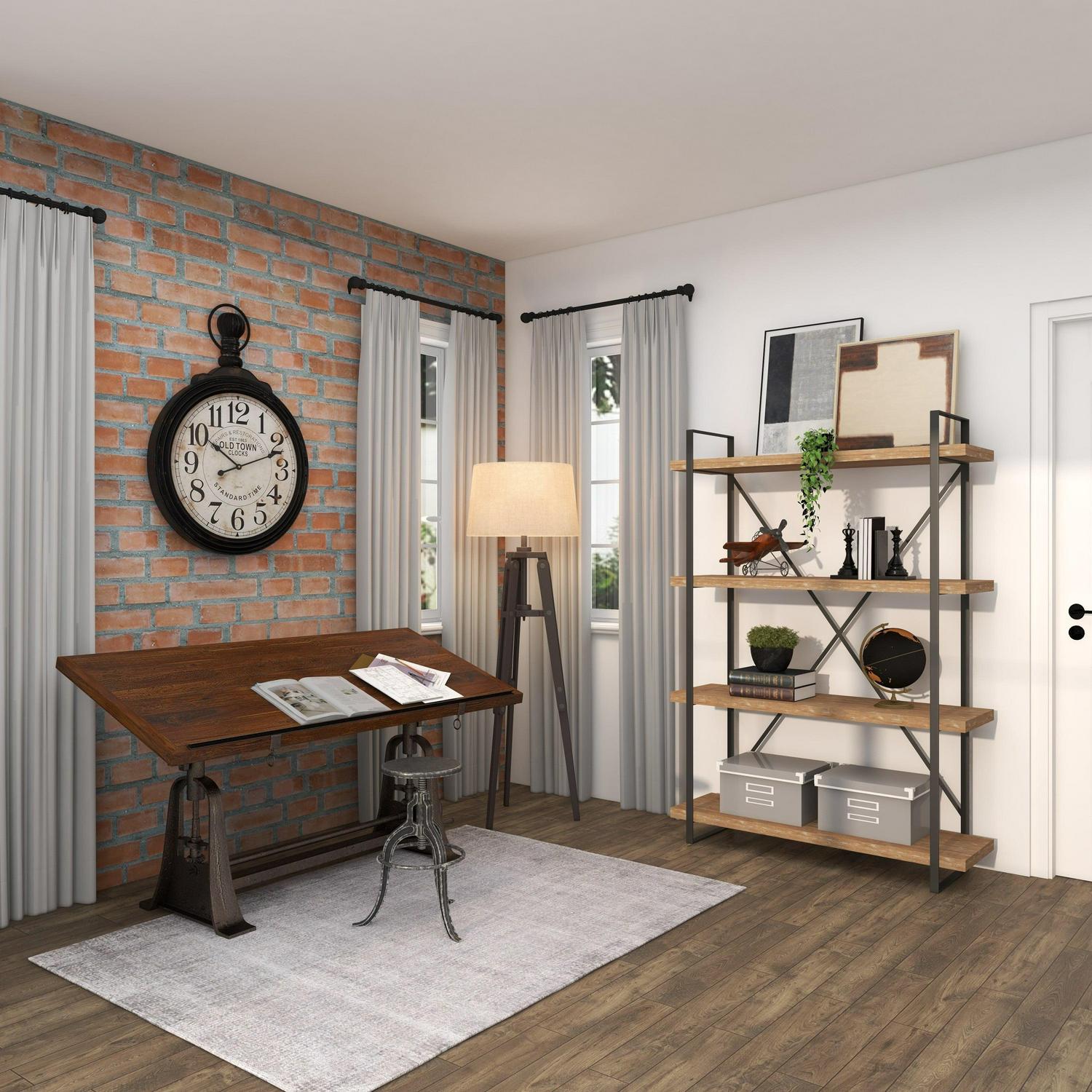 – This industrial display shelf highlights a natural wood brown textured finish with dark silver frames