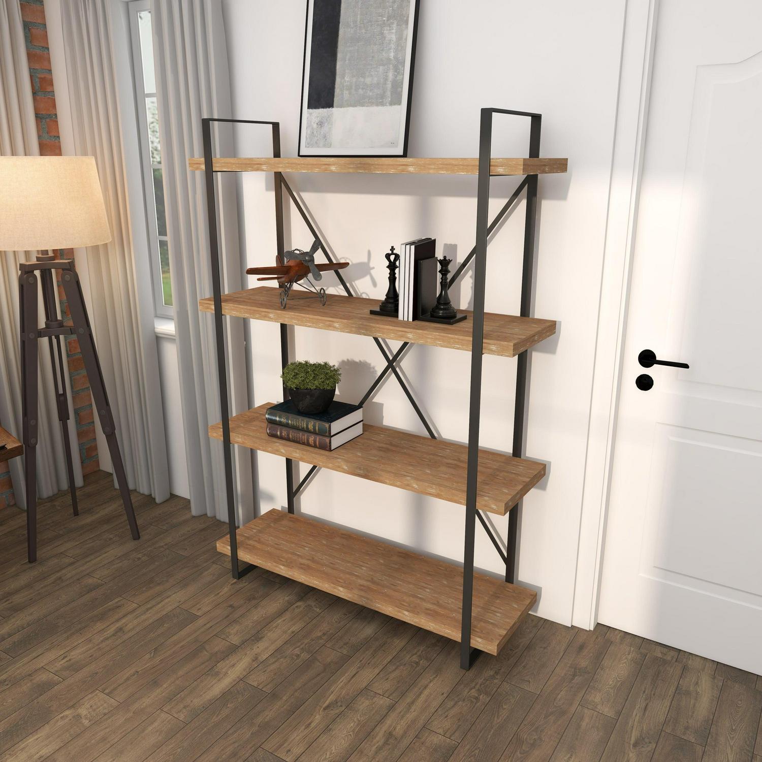 – Tall storage shelf is crafted with solid wood and metal material