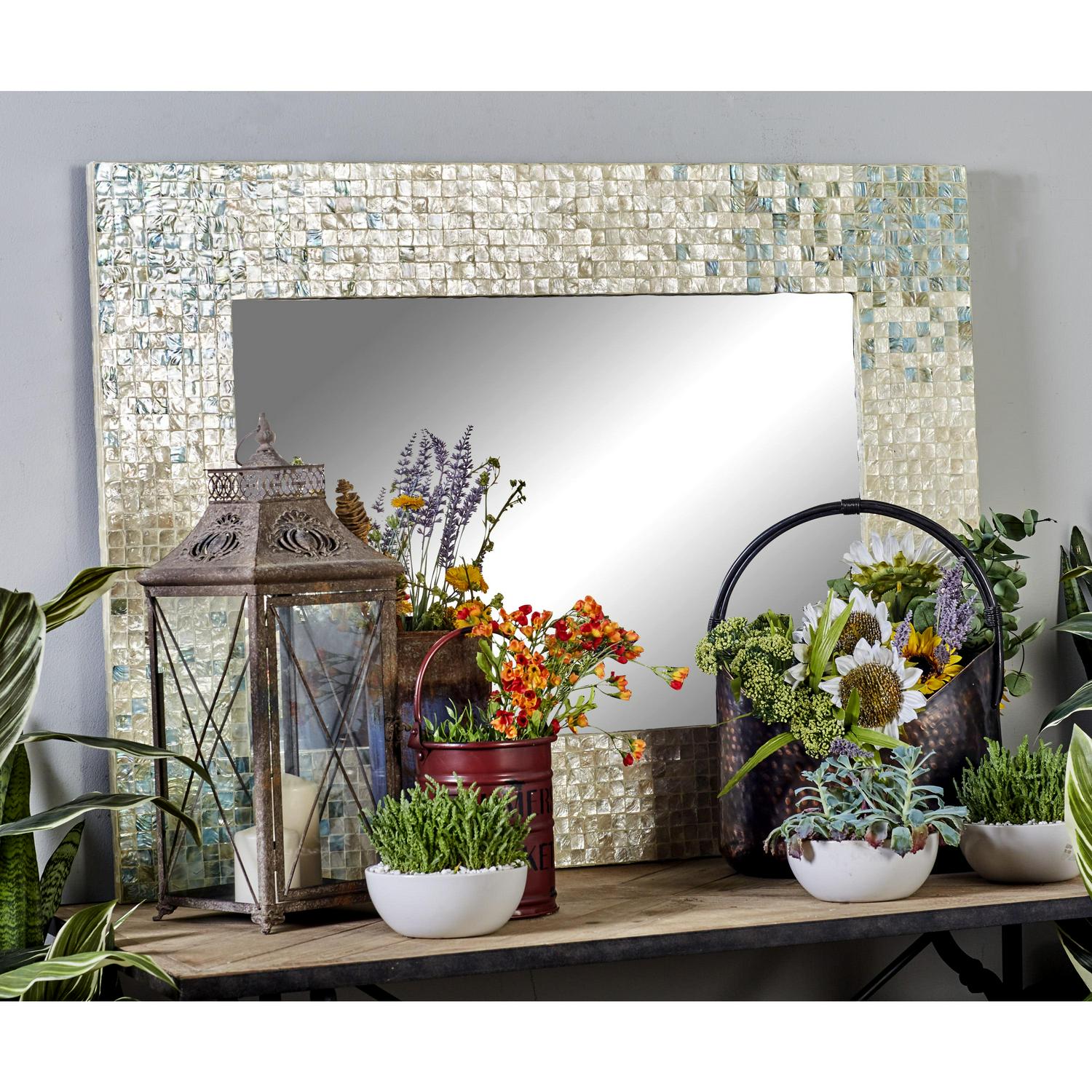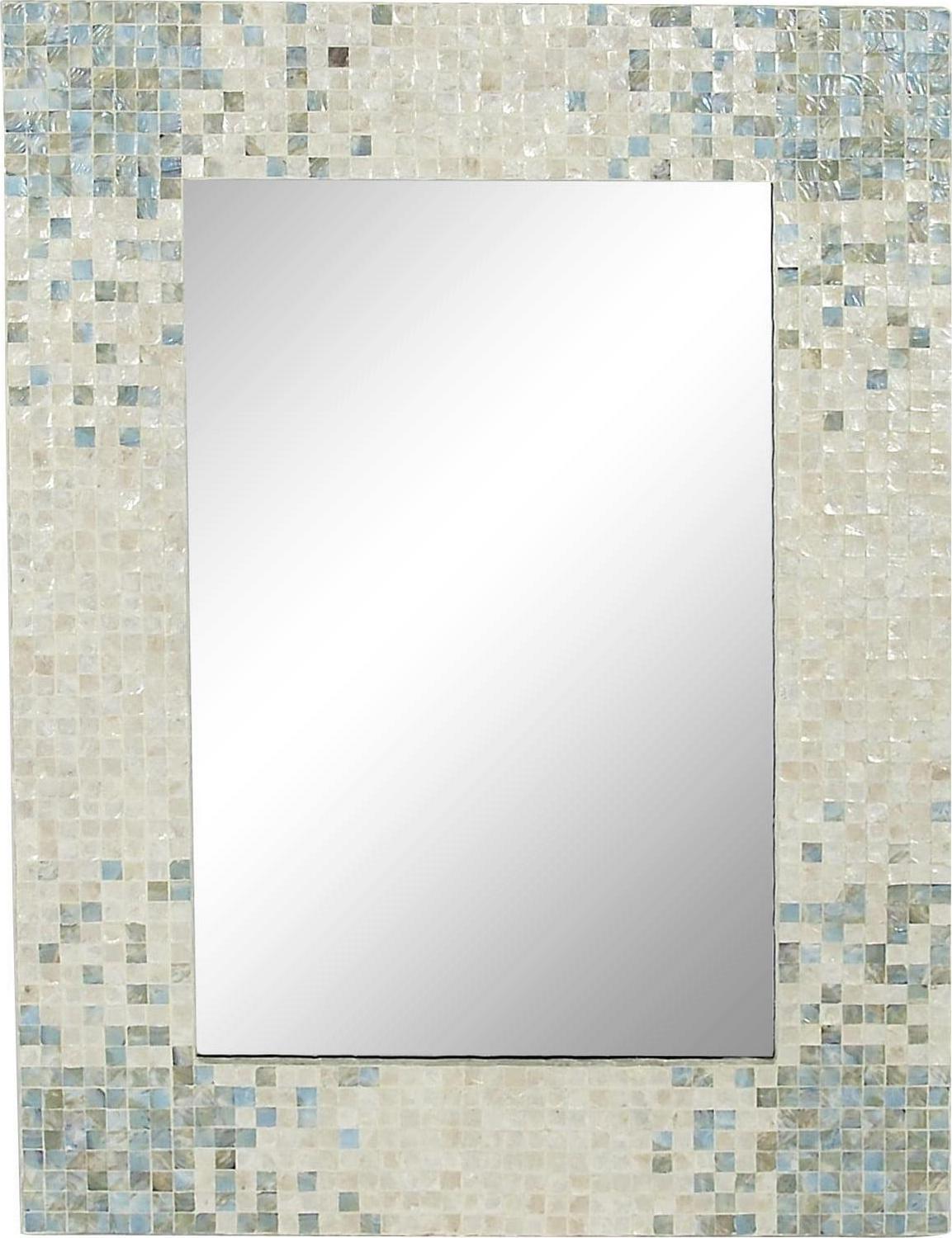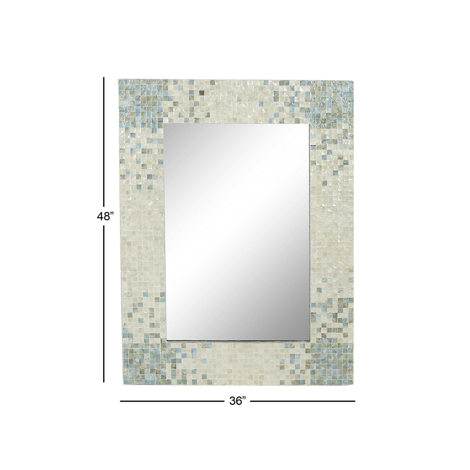 DecMode 48″ x 36″ Cream Handmade Mosaic Wall Mirror with Blue Corners is a unique addition to your stylish home. Display in your nautical, coastal, or beach-house inspired living room over your sofa, in entryway, or bedroom. This item ships in 1 carton. Wall mirror has a rectangular tiled frame made of pearl mussels. Due to the handmade nature of this item, no two will be alike, there will be slight differences in shape, size, and color. Can be hung vertically using the keyholes; nails and screws not included. Suitable for indoor use only. This item ships fully assembled in one piece. Made in Vietnam. This is a single cream colored entryway mirror. Coastal style.