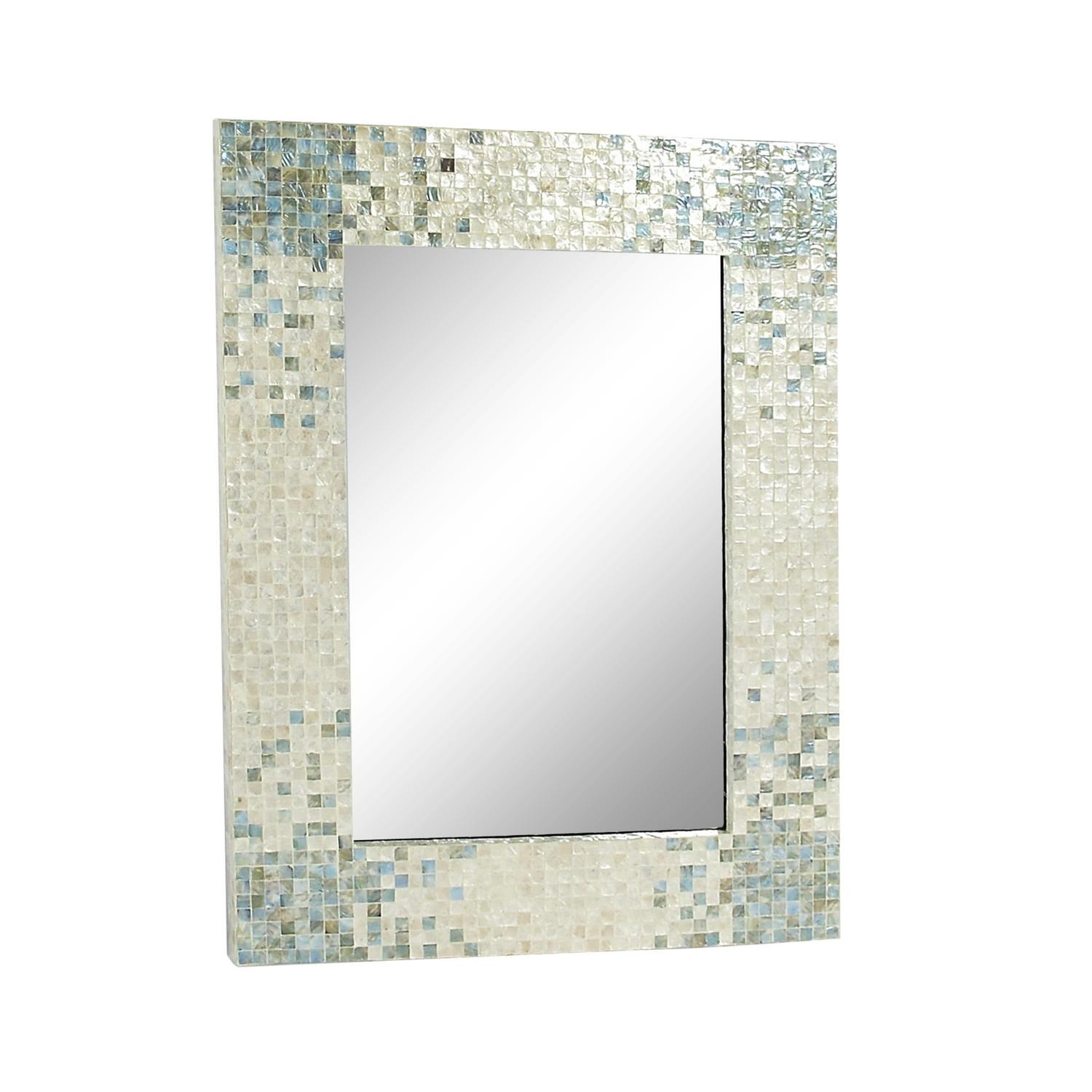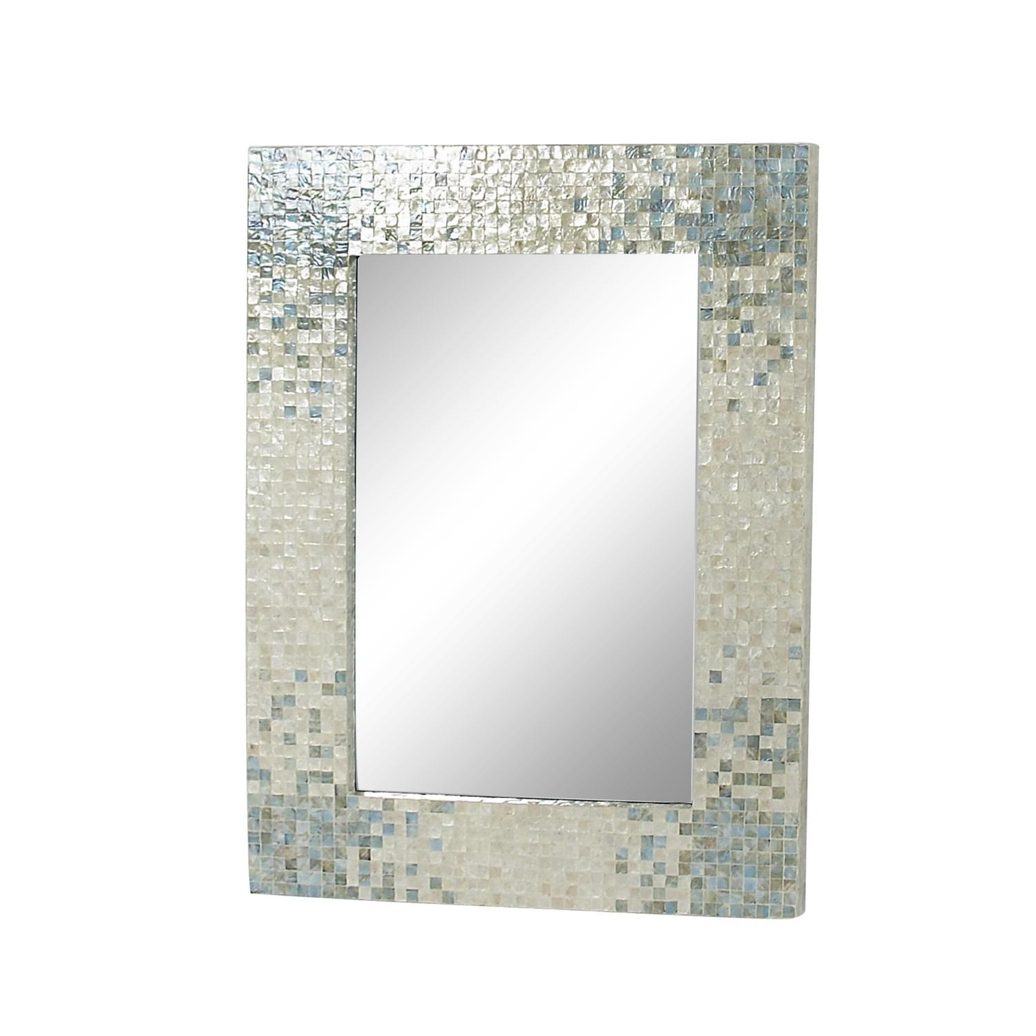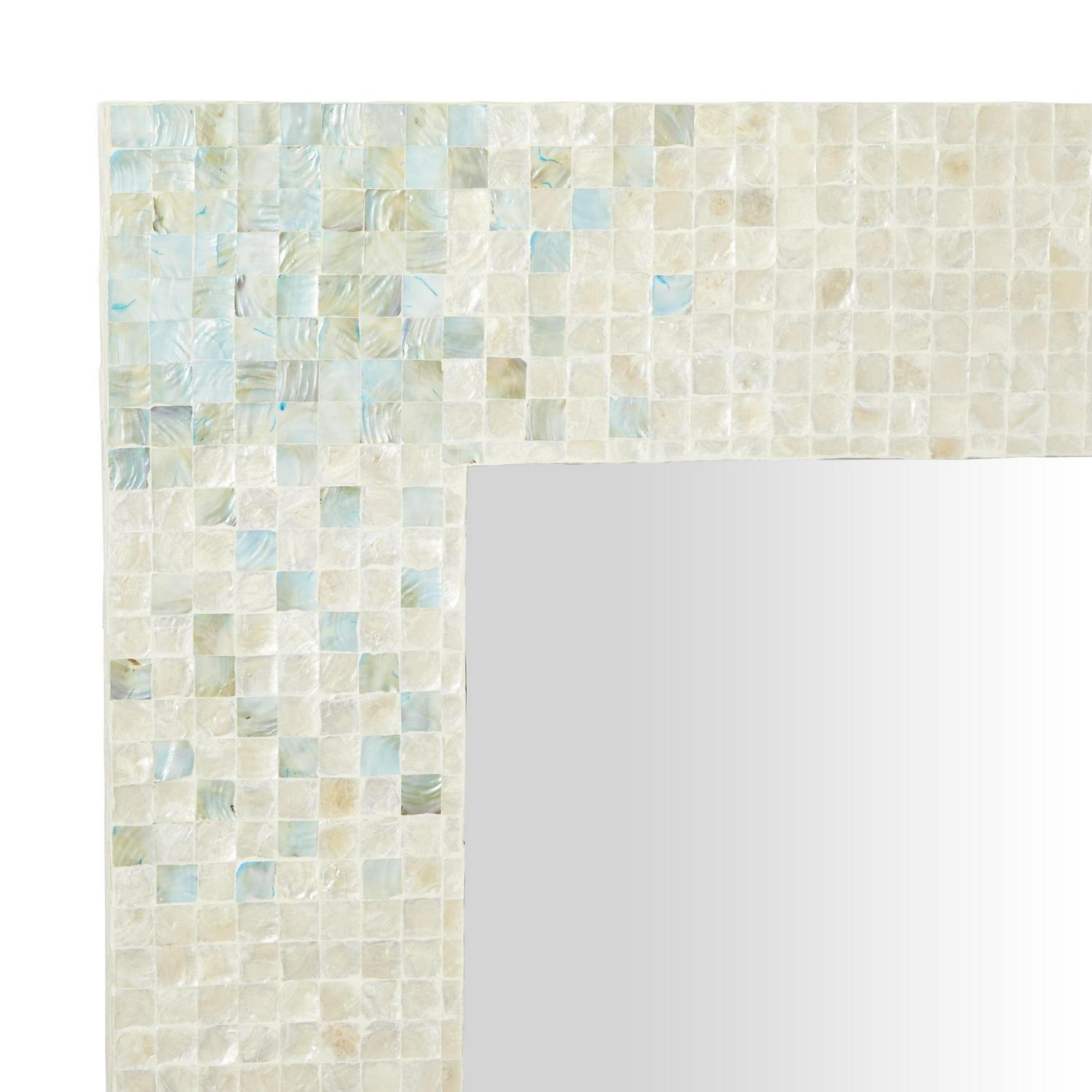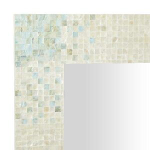 – A wall mirror accent piece featuring a clear reflective glass mirror panel with mosaic shell inlay on its thick border