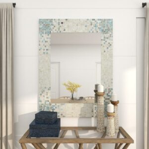 – DecMode 48″ x 36″ Cream Handmade Mosaic Wall Mirror with Blue Corners makes a perfect addition to any home
