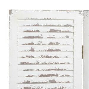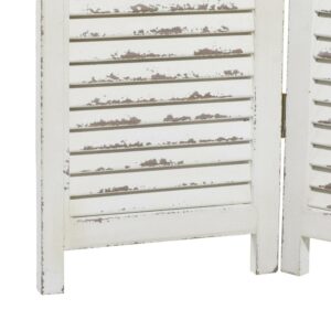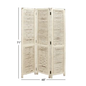 DecMode 48″ x 71″ Cream Wood Hinged Foldable Partition 3 Panel Room Divider Screen with Horizontal Slats, 1-Piece is a unique addition to your stylish home. Use this wooden room divider to break up a large space and create a sense of privacy. This item ships in 1 carton. Suitable for indoor use only. Item features 3 panel screens. This is a single room divider screen. Farmhouse style.