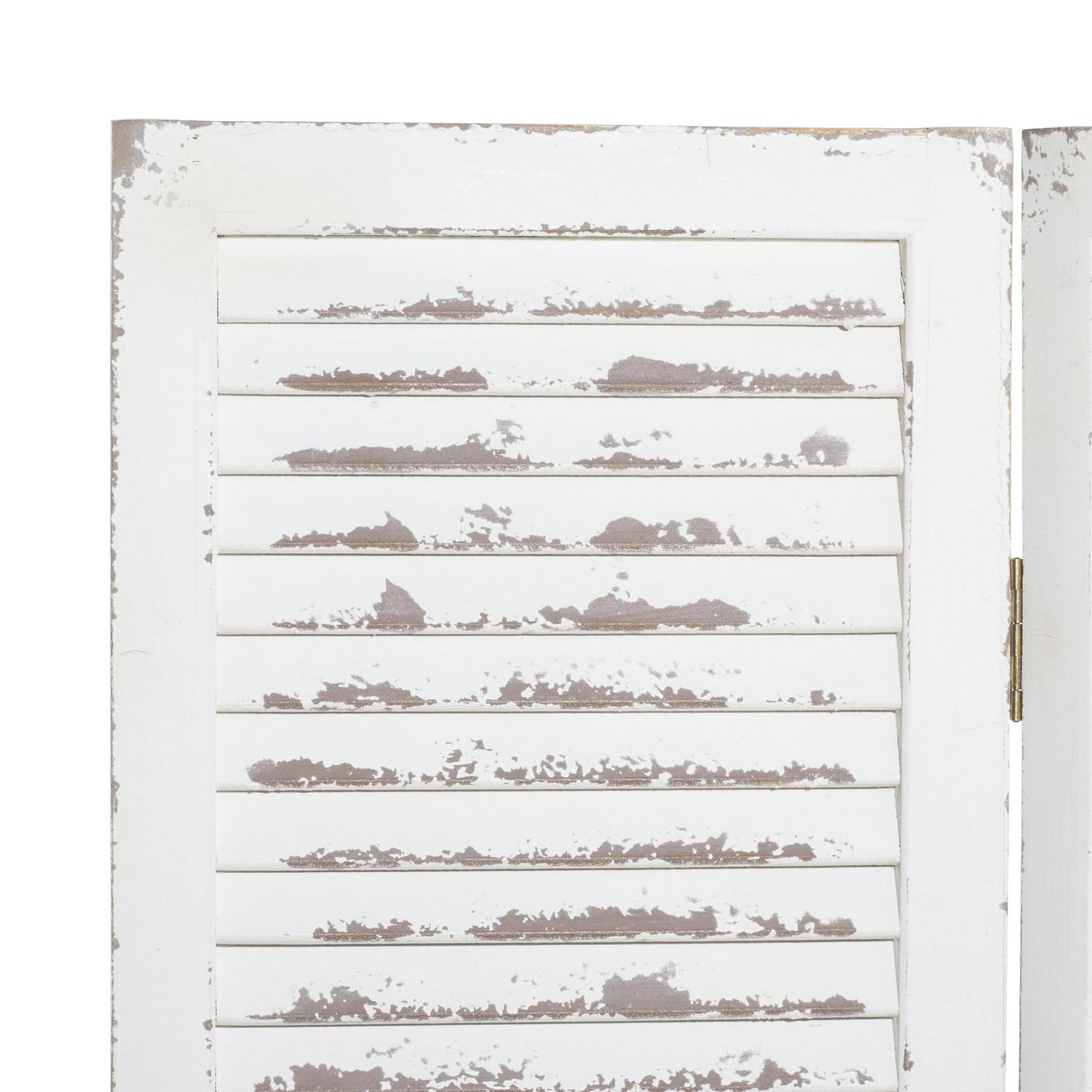 – White wood 3-fold room divider screen features louvered design for added style and supported by black hinges for optima configuration