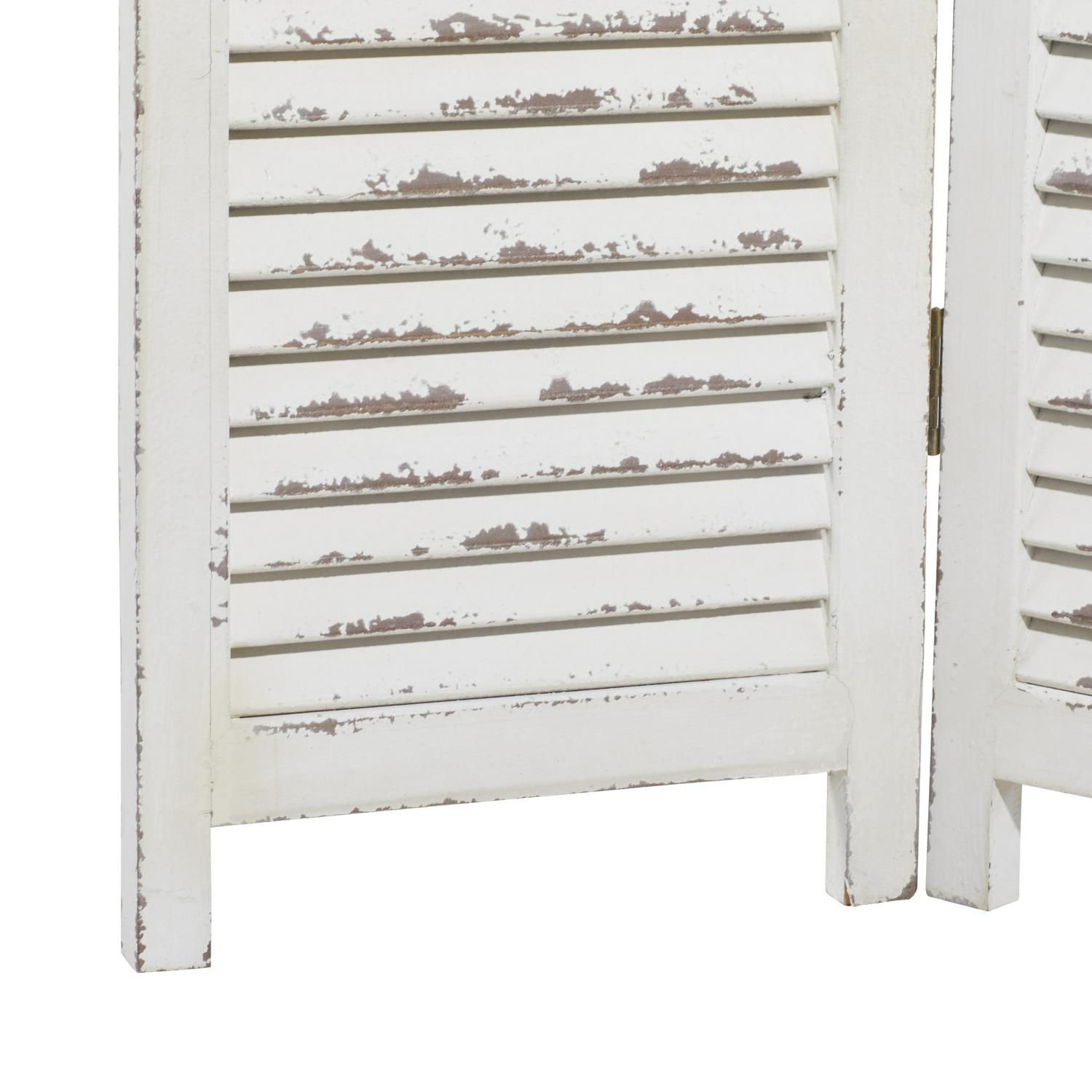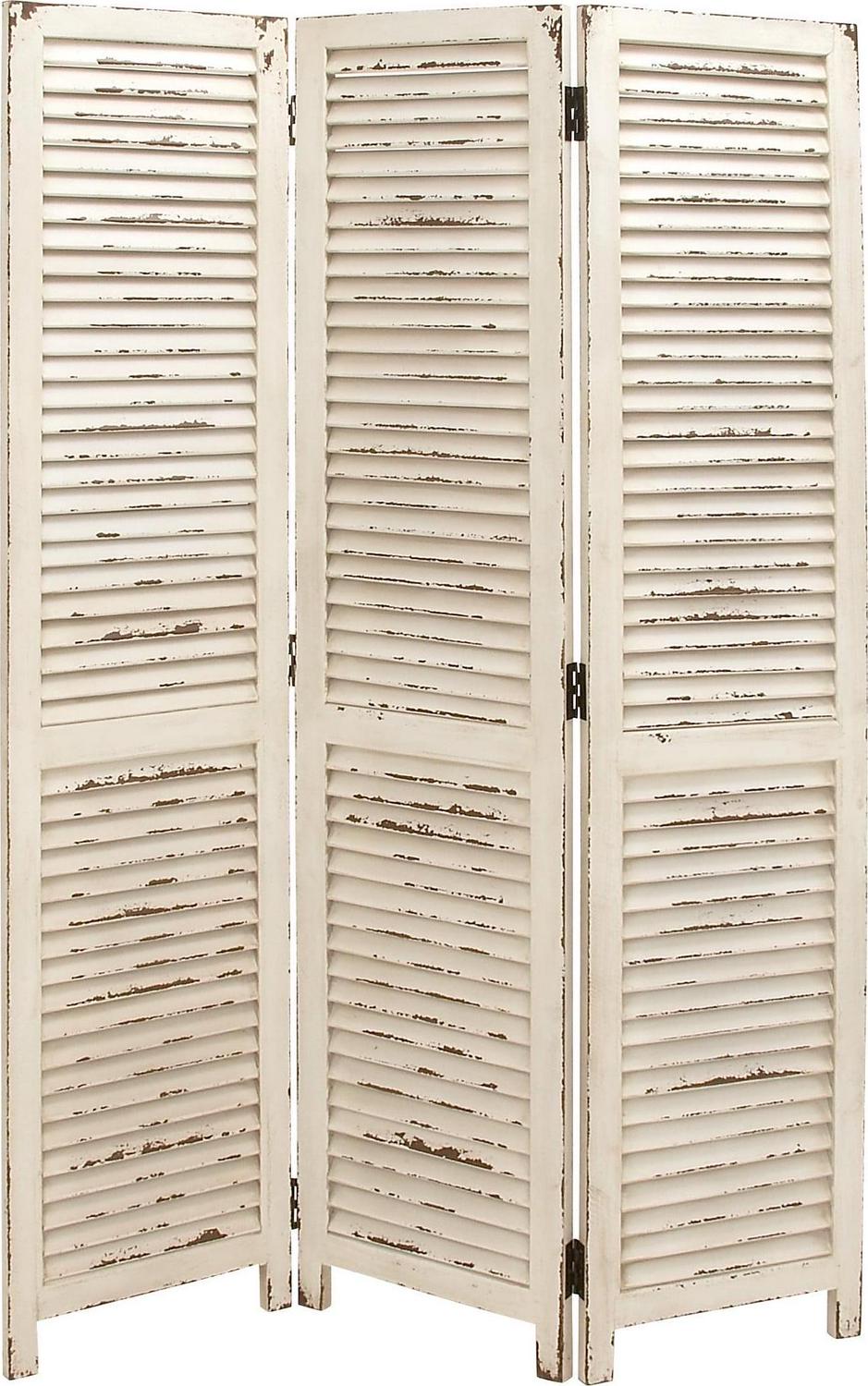 - This wood room divider screen has a distressed cream finish for an aged look