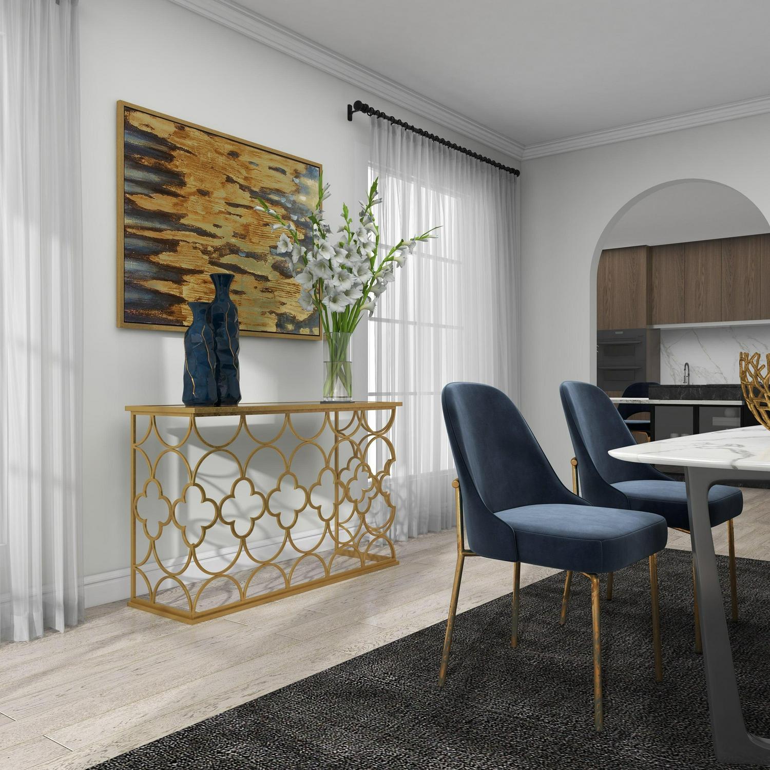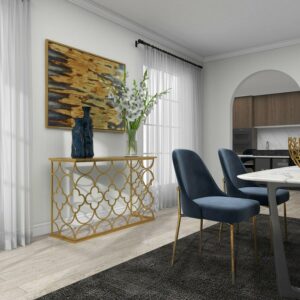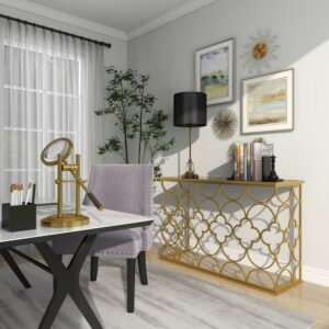 – DecMode 49″ x 31″ Gold Metal Quatrefoil Design Geometric Console Table with Mirrored Glass Top, 1-Piece makes a perfect addition to any home