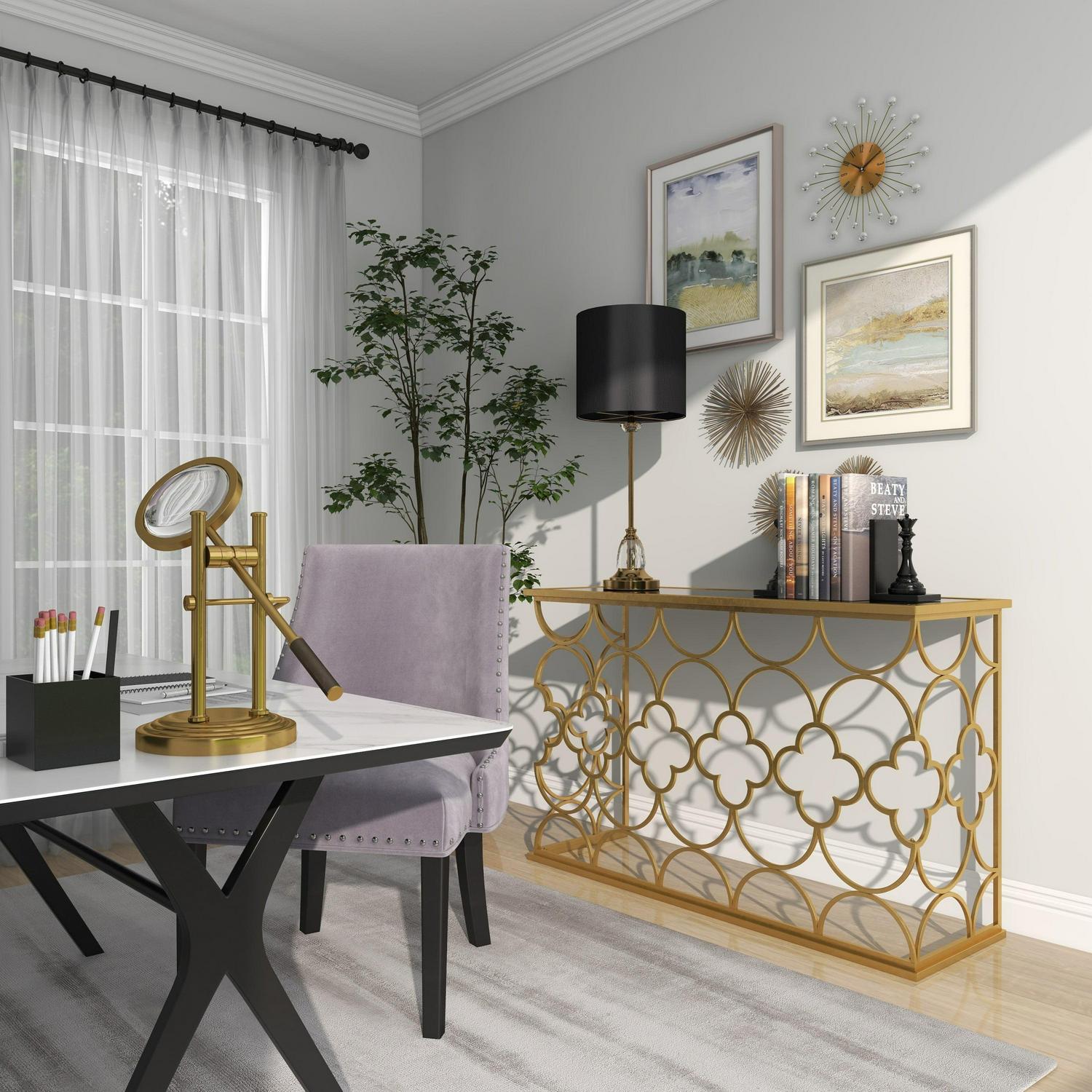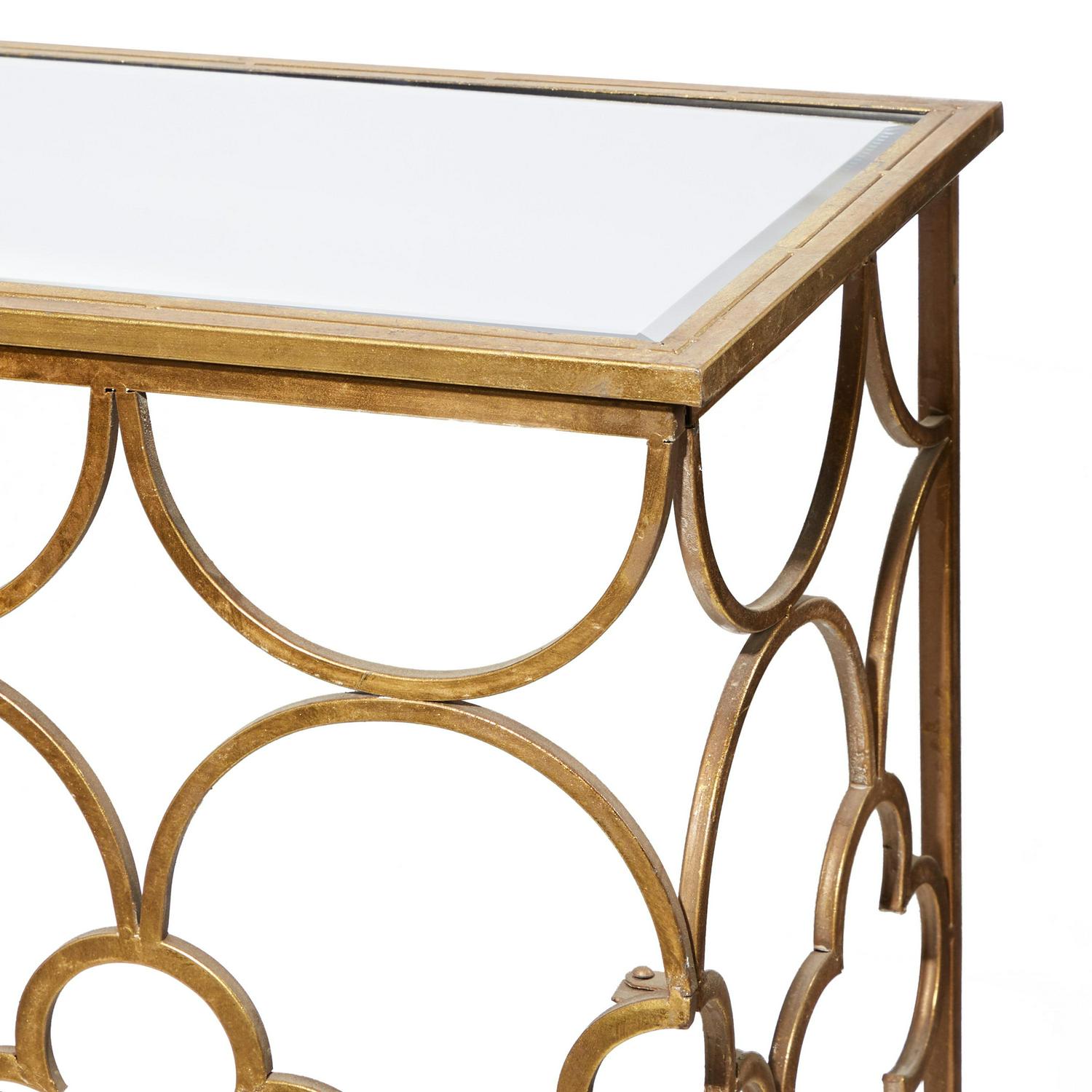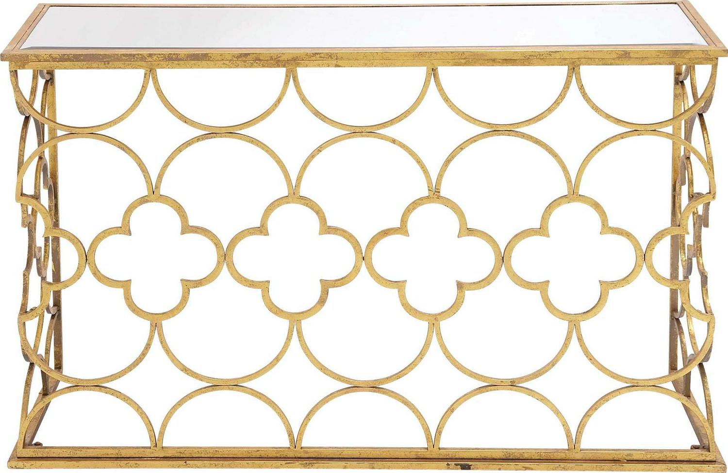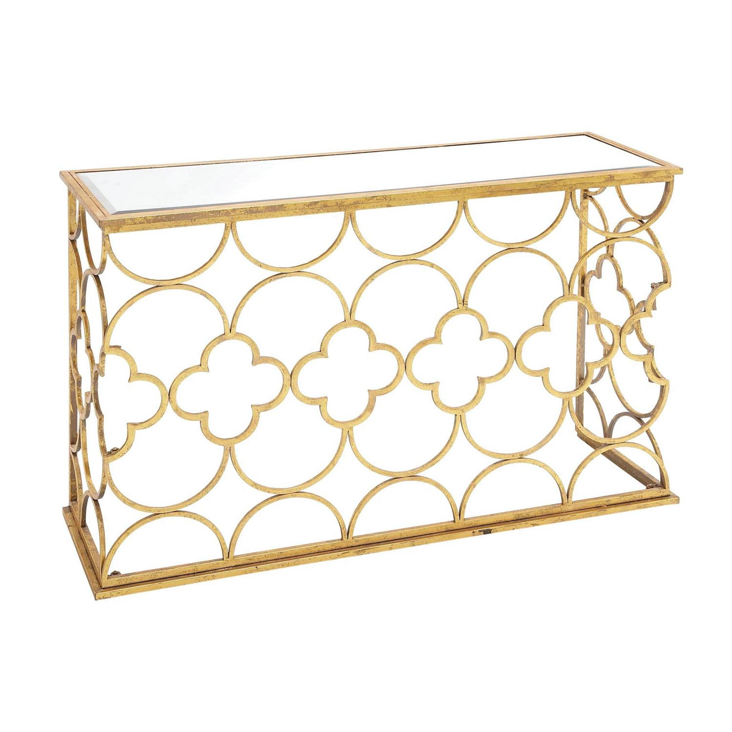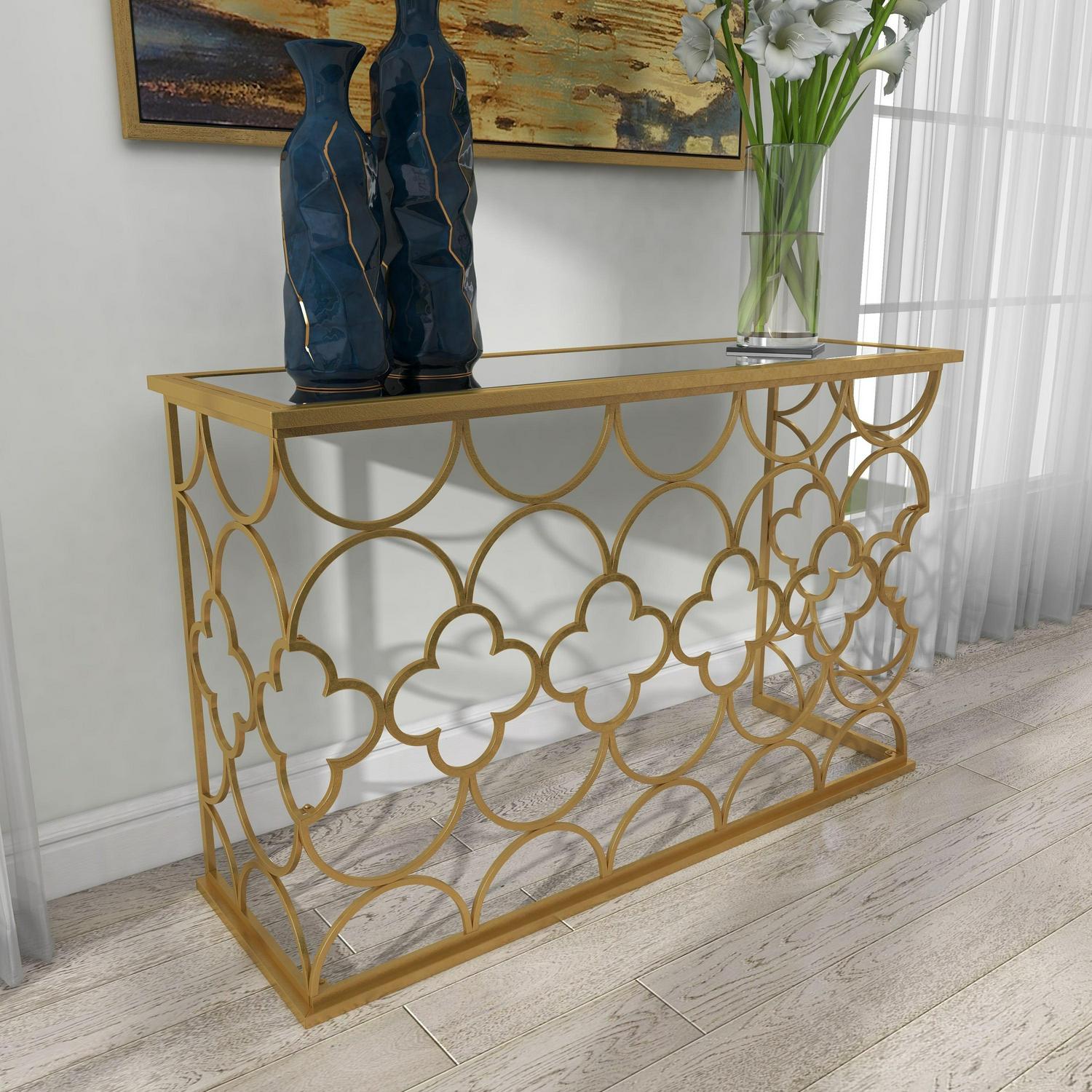 – Metal gold console table has a rectangle glass surface with quatrefoil metal structure in an open style frame