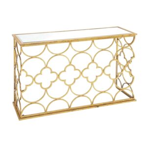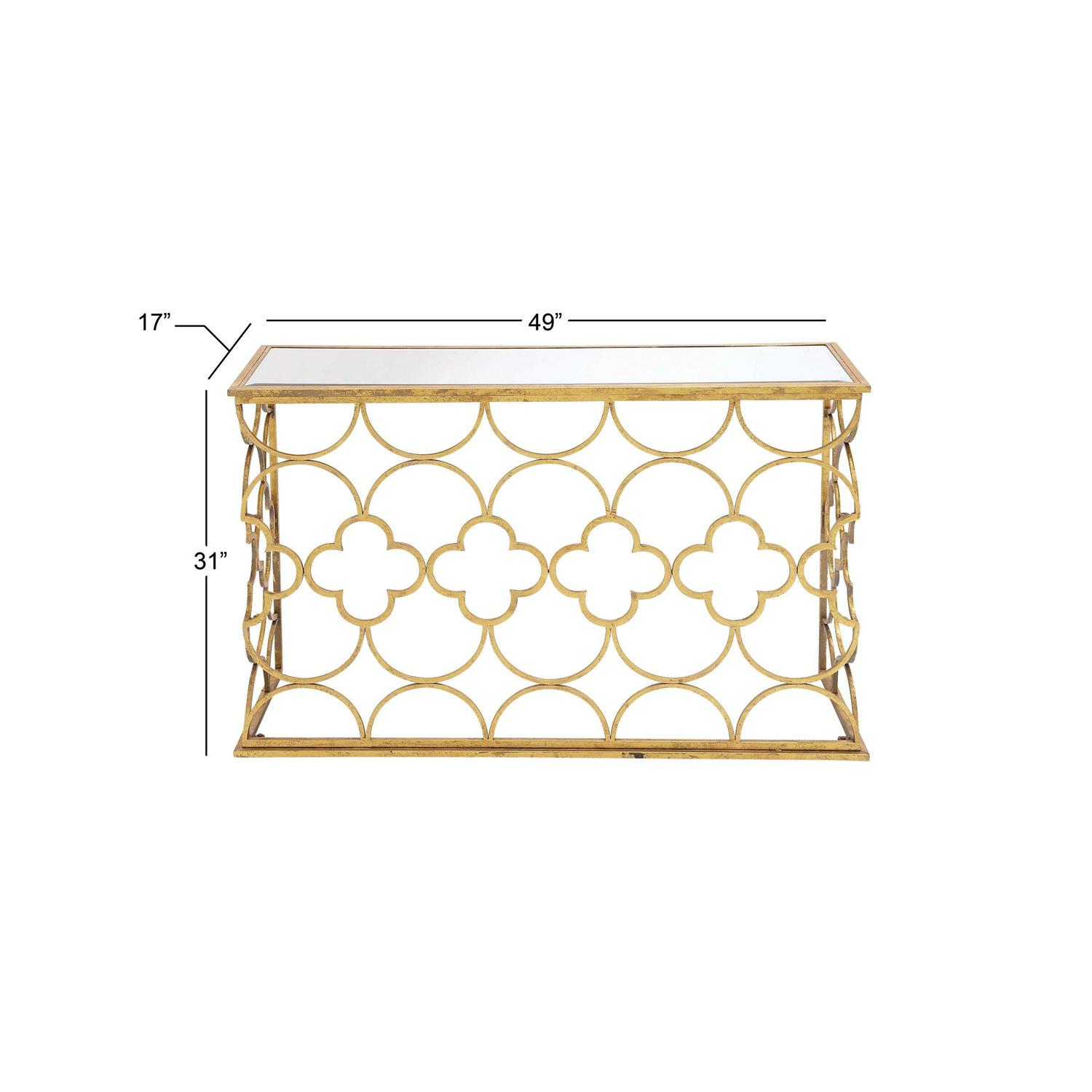DecMode 49 x 31 Gold Metal Quatrefoil Design Geometric Console Table with Mirrored Glass Top, 1-Piece