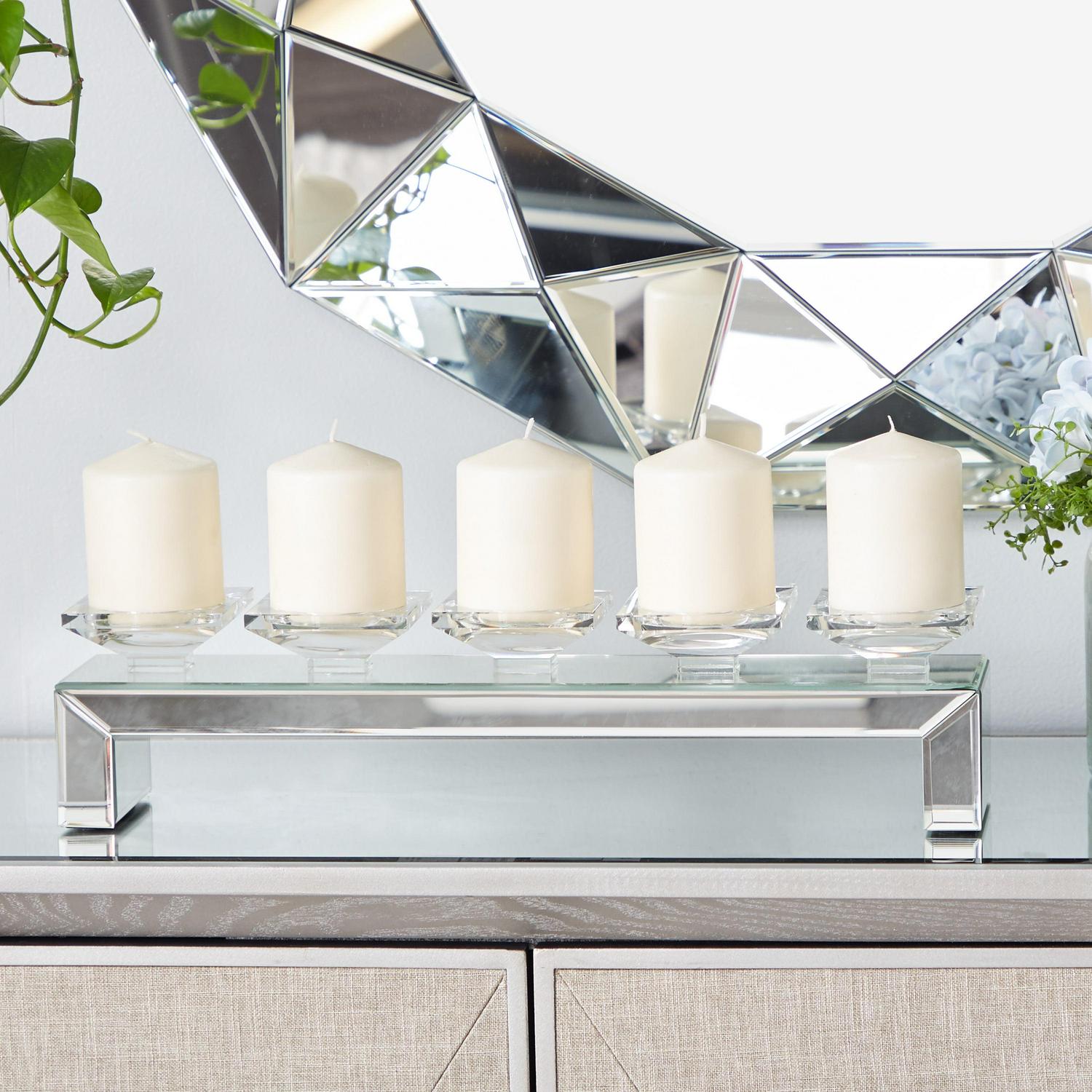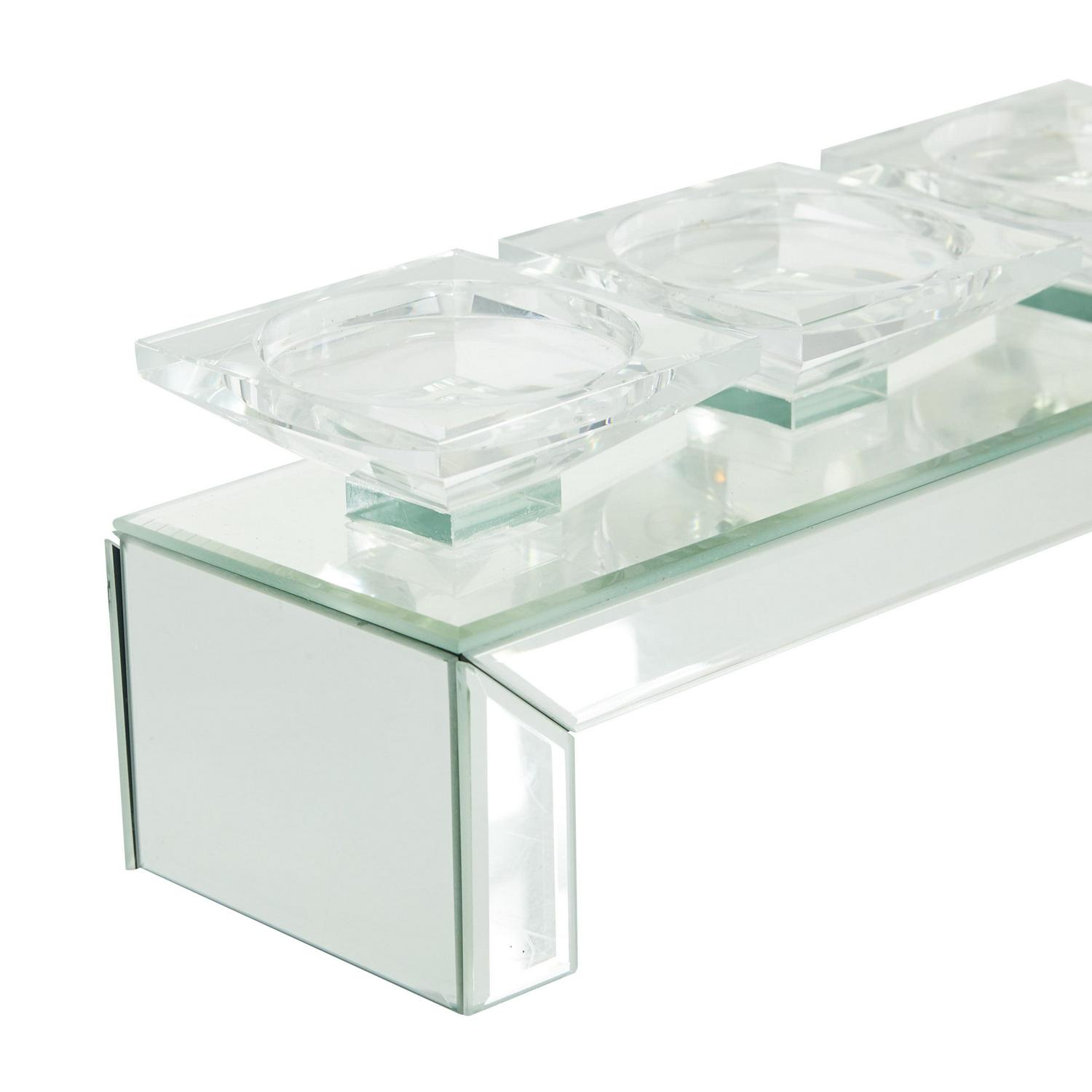 DecMode 5 Holder Silver Glass Pillar Candelabra with Mirrored Accents is a unique addition to your stylish home. Give your space a radiant illumination with these beautifully crafted candle holders. Made with a sturdy base, it is perfect for creating an elegant atmosphere at your table top or mantel. Use this candle holder centerpiece to create a gorgeous display on your mantel or table. Designed with felt or rubber stoppers at the base that prevent scratching furniture and table tops, as well as sliding around. Can hold 5 pillar candles, not included. This item ships in 1 carton. Suitable for indoor use only. This item ships fully assembled in one piece. This is a single silver colored candlestick holder. Glam style.