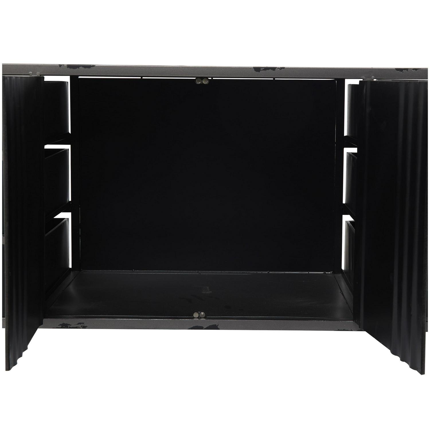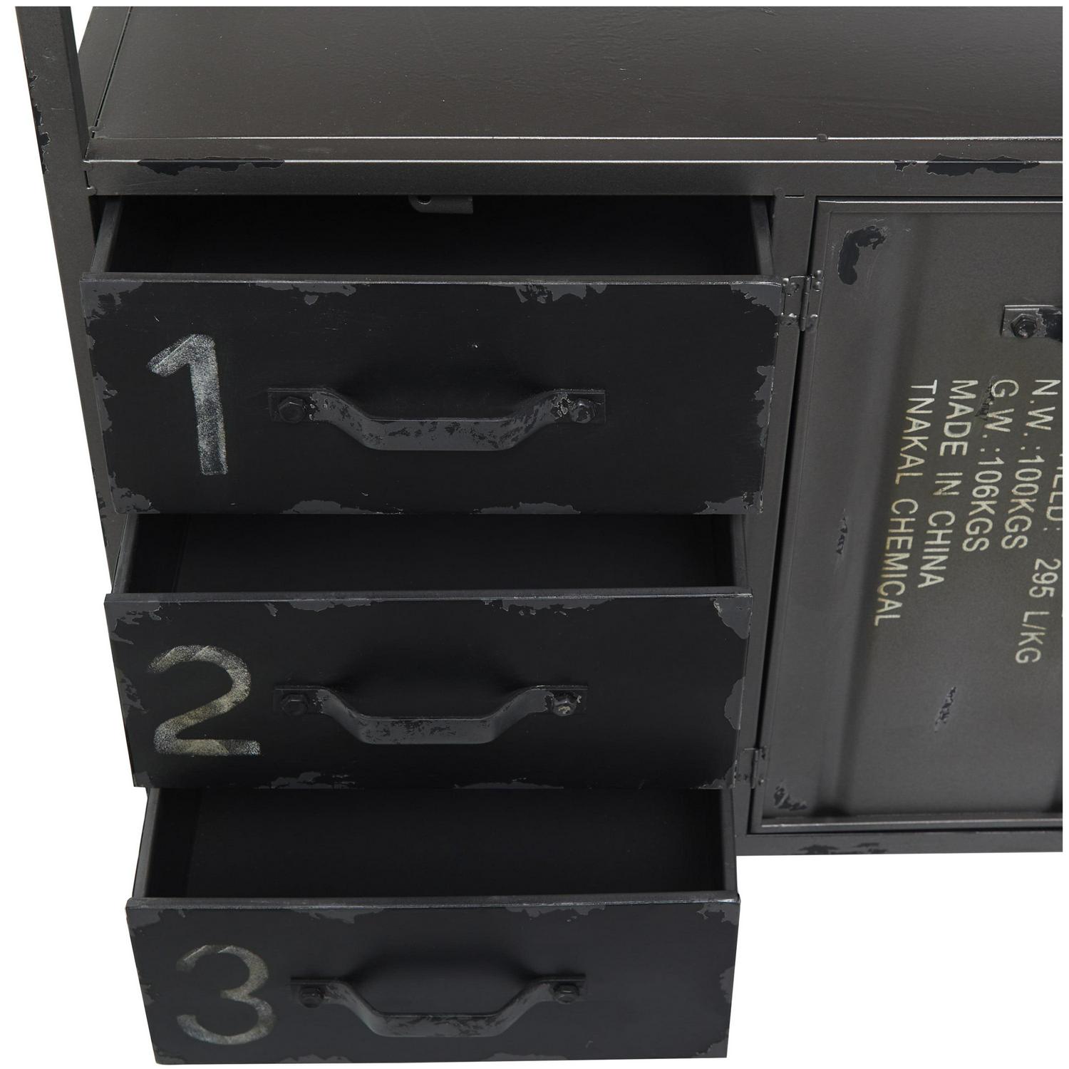 – Rectangular metal sideboard features open midsection shelf with a combination of spacious cabinets and drawers, curved handle bars for easy open and painted with repurposed-style script in white with heavily distressing design