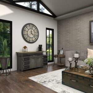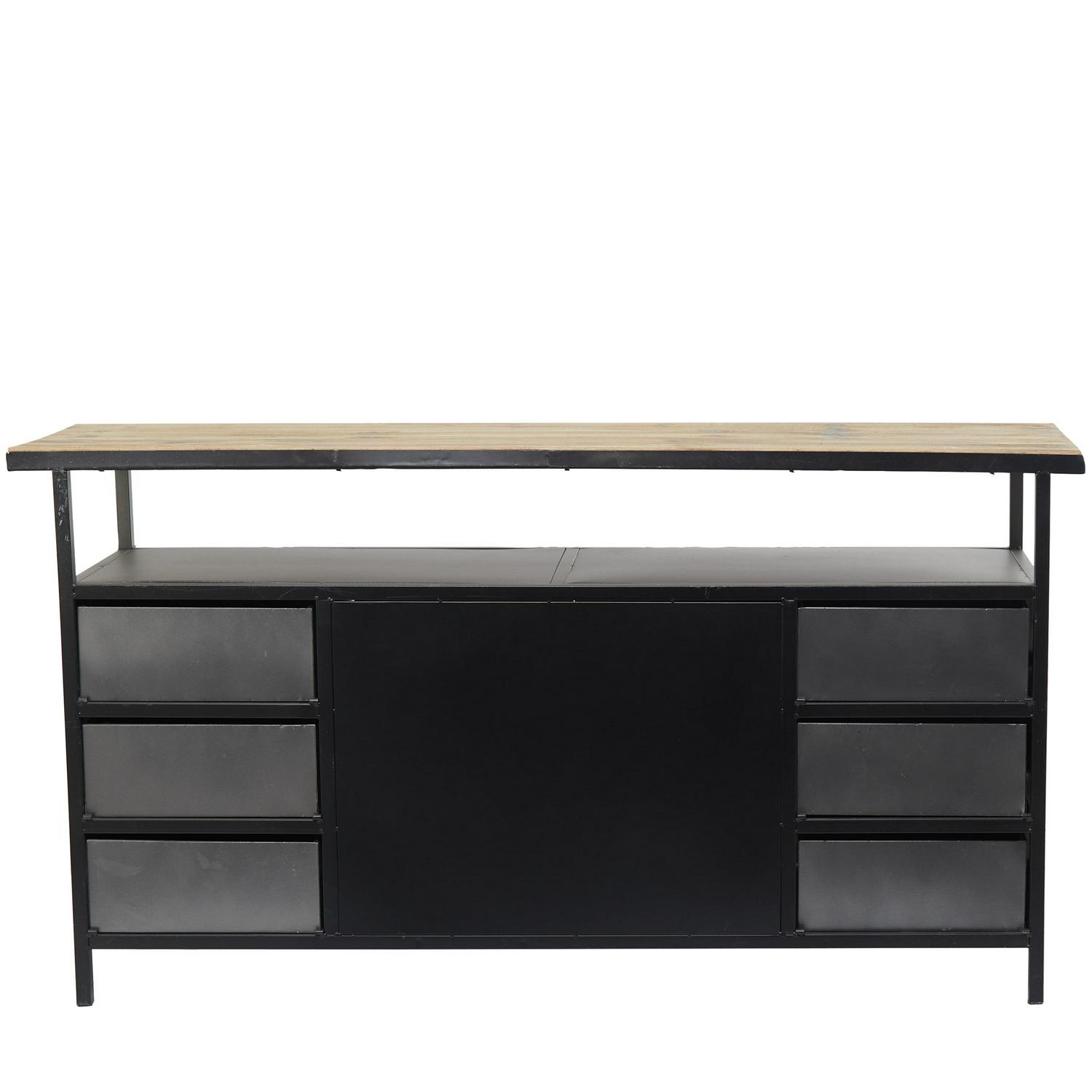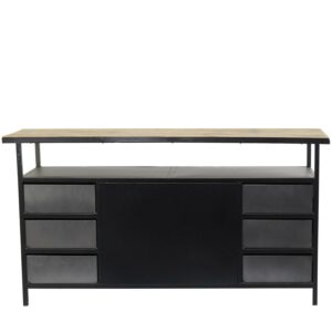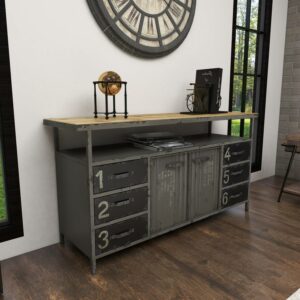 – Metal cabinet buffet carries natural wood brown top with gunmetal grey structure and black distressing