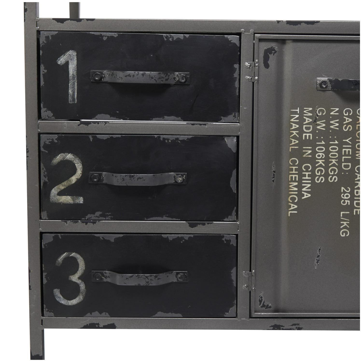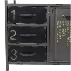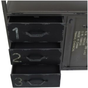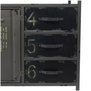 DecMode 56″ x 30″ Gray Metal Army Surplus Style 6 Drawers 2 Shelves and 2 Doors Buffet with Numbers and Text, 1-Piece is a unique addition to your stylish home. Bring a finishing touch to your home with an inviting appeal with this expertly crafted buffet sideboard. A stylish way to keep you organize and your belongings safe and protected. Create an rustic display with this black metal sideboard and decorate it with large abstract object on top of books next to a large leaning wall art. 1 door cabinet measures 25″L x 15″W x 18″ H. This item ships in 1 carton. Gray buffet features 6 drawers with 25 lbs weight limit. Storage with tabletop, open shelf, large cabinet, 6 drawers. Suitable for indoor use only. This item ships fully assembled in one piece. Maximum weight limit is 30 lbs. This is a single gray colored sideboard. Metal buffet features 2 shelves. Industrial style.