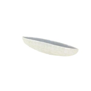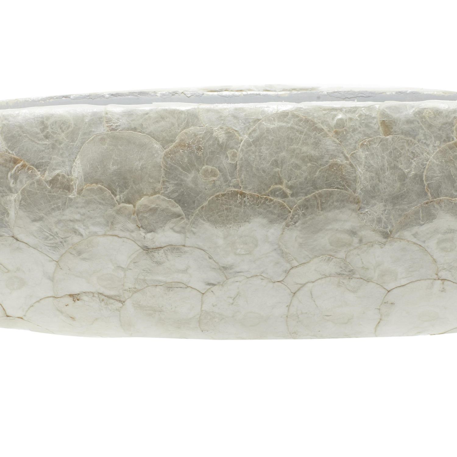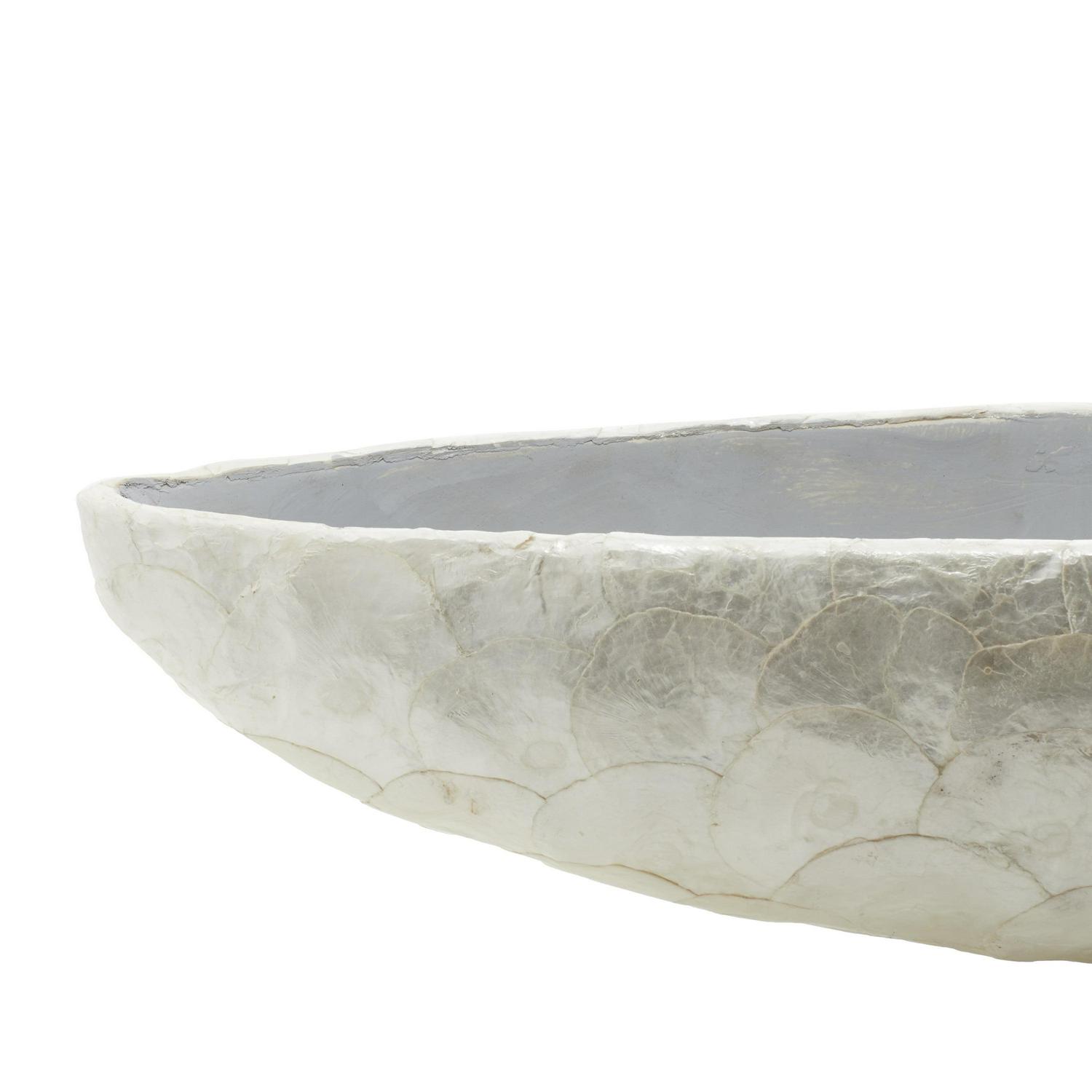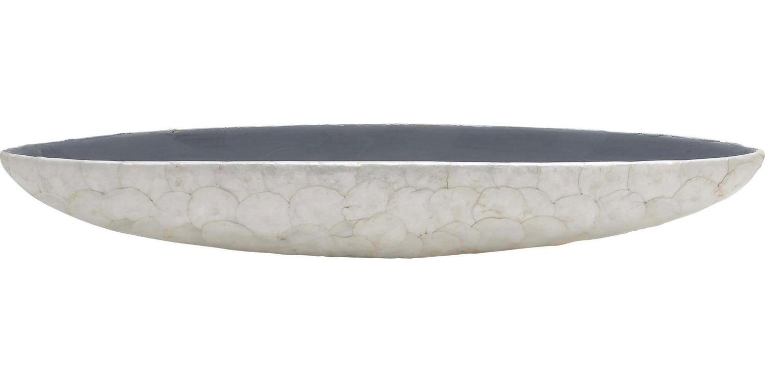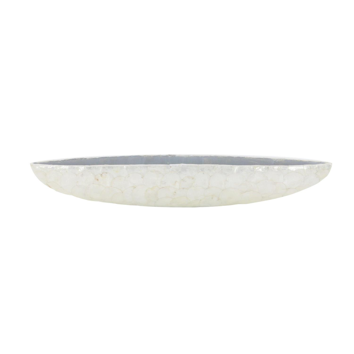 – This coastal style inspired design white resin and Capiz long bowl features an elongated profile and fish scale pattern on the surface with a shallow construction
