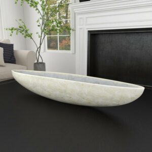 DecMode 6″ Oval White Polystone Decorative Bowl is a unique addition to your stylish home. The perfect compact storage for your belongings while keeping your surface space protected. Give your surface space a finishing touch with these beautifully crafted decorative bowls. This polystone and Capiz long bowl will add a hint of relaxation and peace when displayed on tables and shelves in your coastal style home. Designed with felt or rubber stoppers at the base that prevent scratching furniture and table tops, as well as sliding around. This item ships in 1 carton. Please note that this item is for decorative purposes only and is not food safe. Polystone decorative bowl makes a great gift for any occasion. Suitable for indoor use only. This item ships fully assembled in one piece. This is a single white colored display bowl. Coastal style.