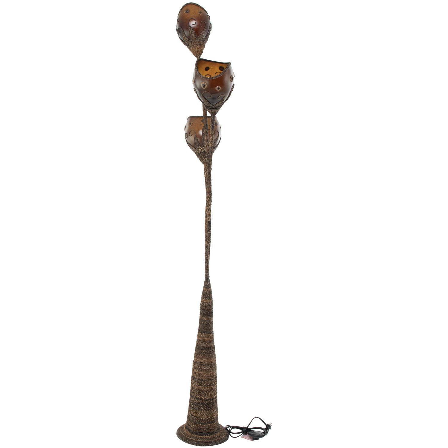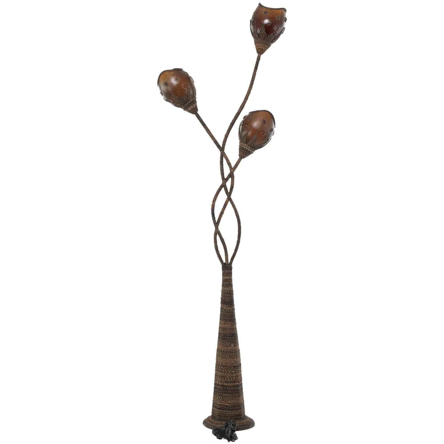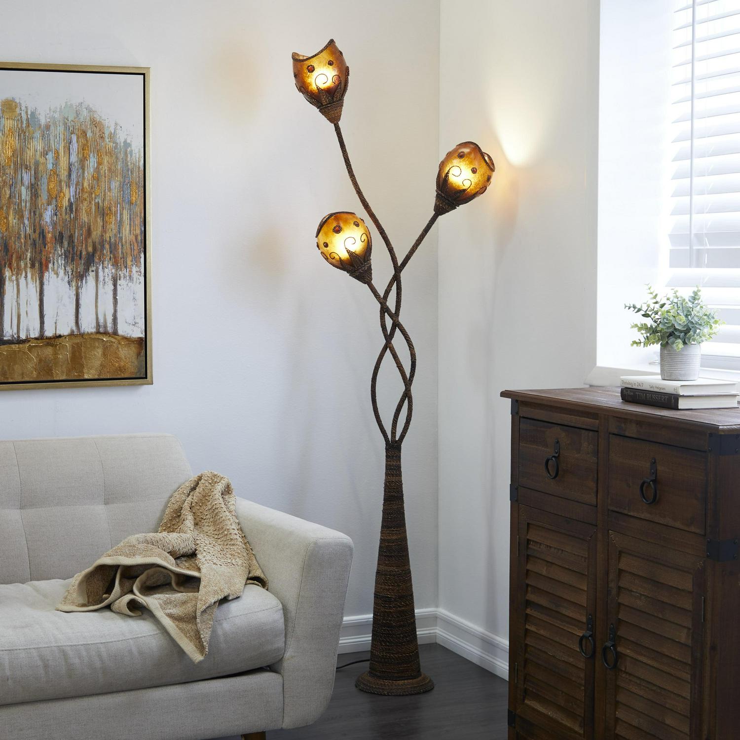 – Captivating tall floor lamp with braided abaca design with three amber brown light shades to encase bulbs