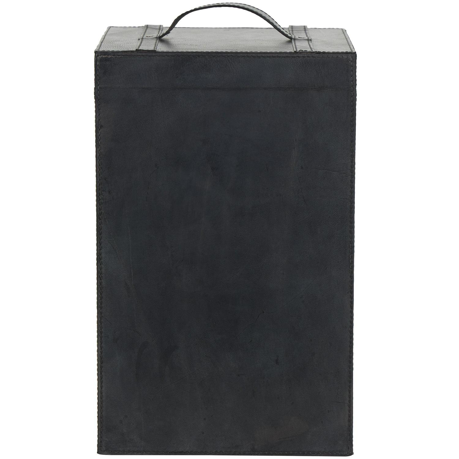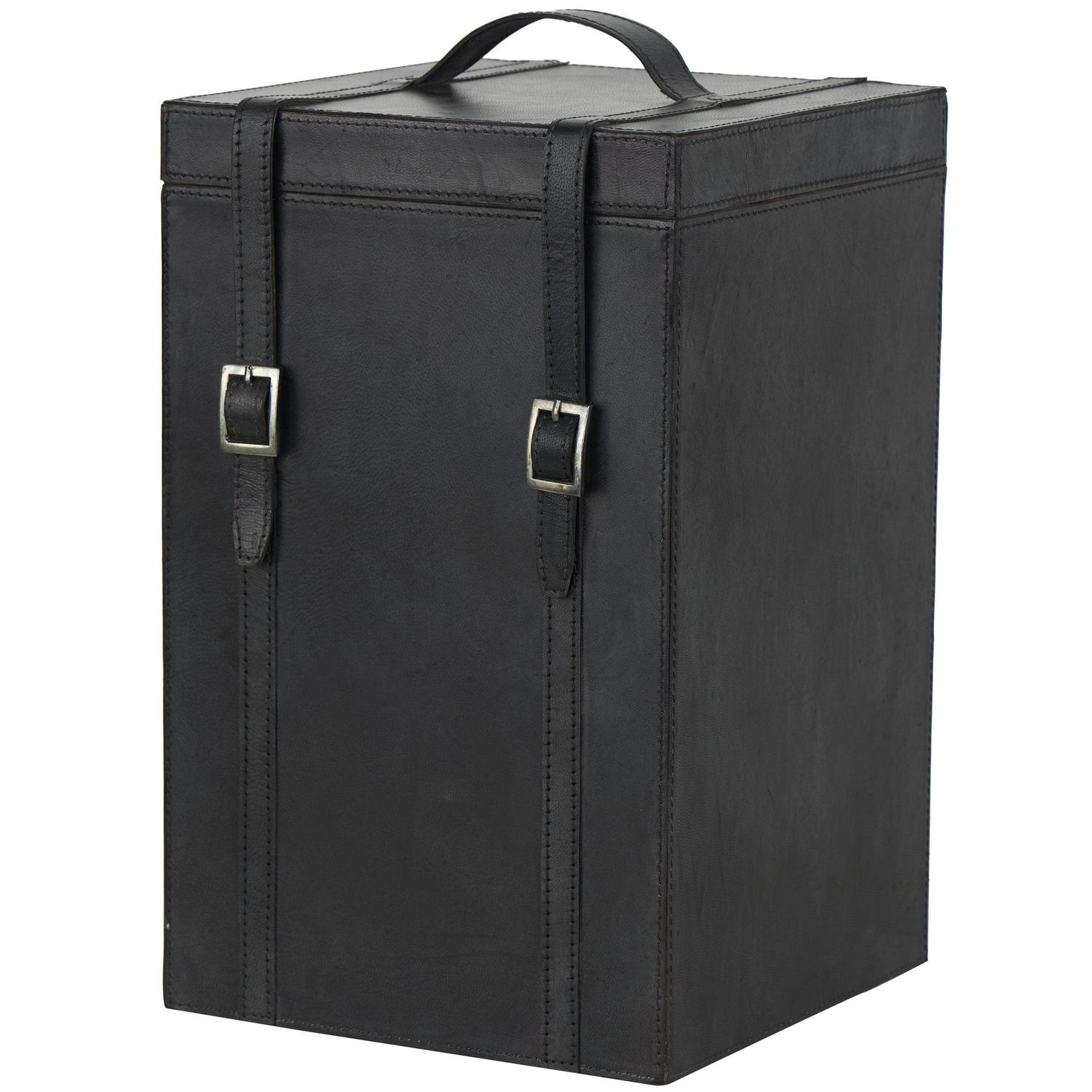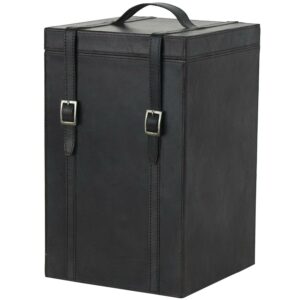 - A leather strap duo holds the lid close and is topped with another strap for easy carrying