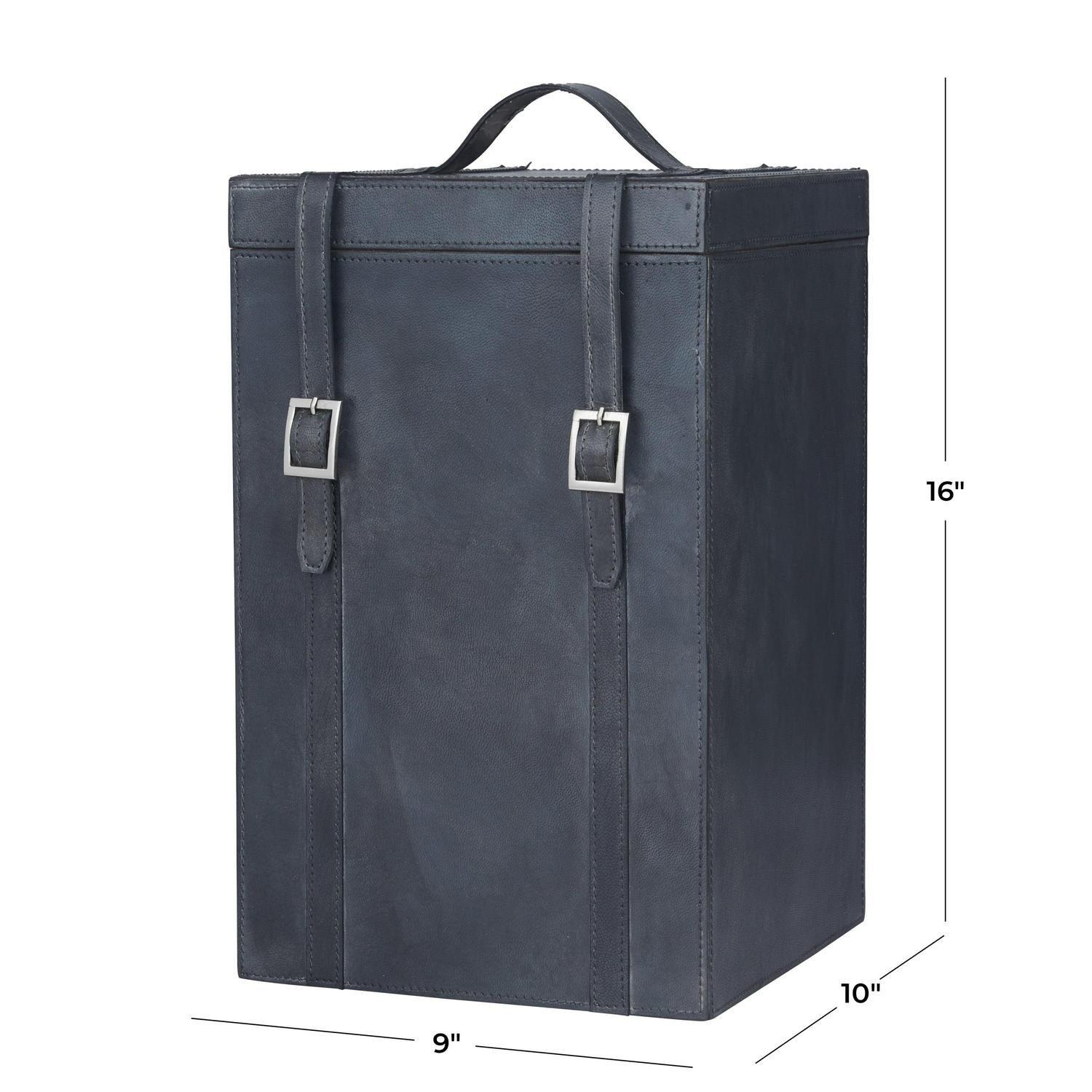 DecMode 9″ x 16″ Dark Blue Leather 4 Bottle Wine Holder with Carrying Handle, 1-Piece is a unique addition to your stylish home. Showoff your bottle beverage collection in the most elegant way with this wine holder. Made from sturdy and long lasting material featuring real leather for a chic yet durable design. Enjoy your wine or drinks on your next travel with this navy leather wine bottle holder that comes in a chic and sleek style. This item ships in 1 carton. Please note that this item is for decorative purposes only and is not food safe. Leather wine holder makes a great gift for any occasion. Suitable for indoor use only. This item ships fully assembled in one piece. Leather and hair on hide are natural products, and therefore no two will be alike. There may slight variations in pattern, natural blemishes, colors, and overall aesthetic of the product. Maximum weight limit is 10 lbs. Made in India. This is a single dark blue colored wine bottle caddy. Modern style. Dark blue wine holder can hold 4 average wine bottles.
